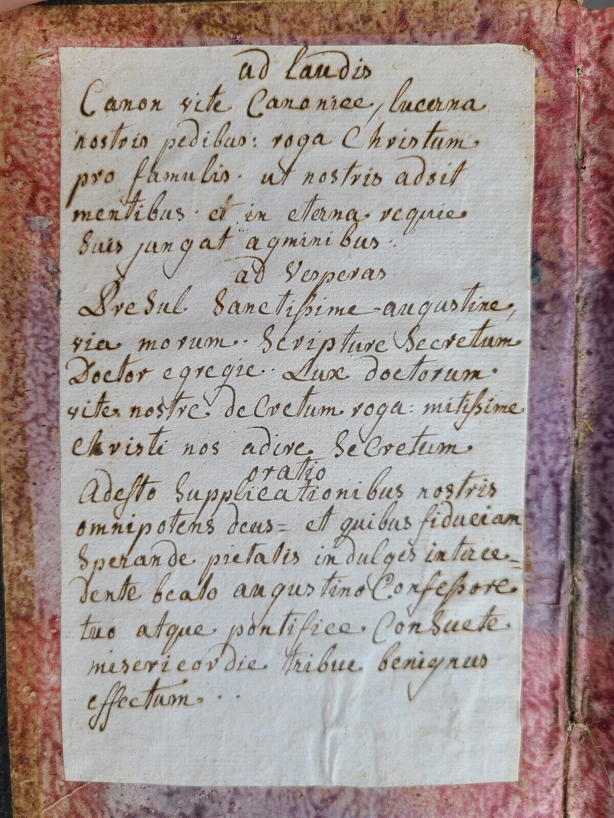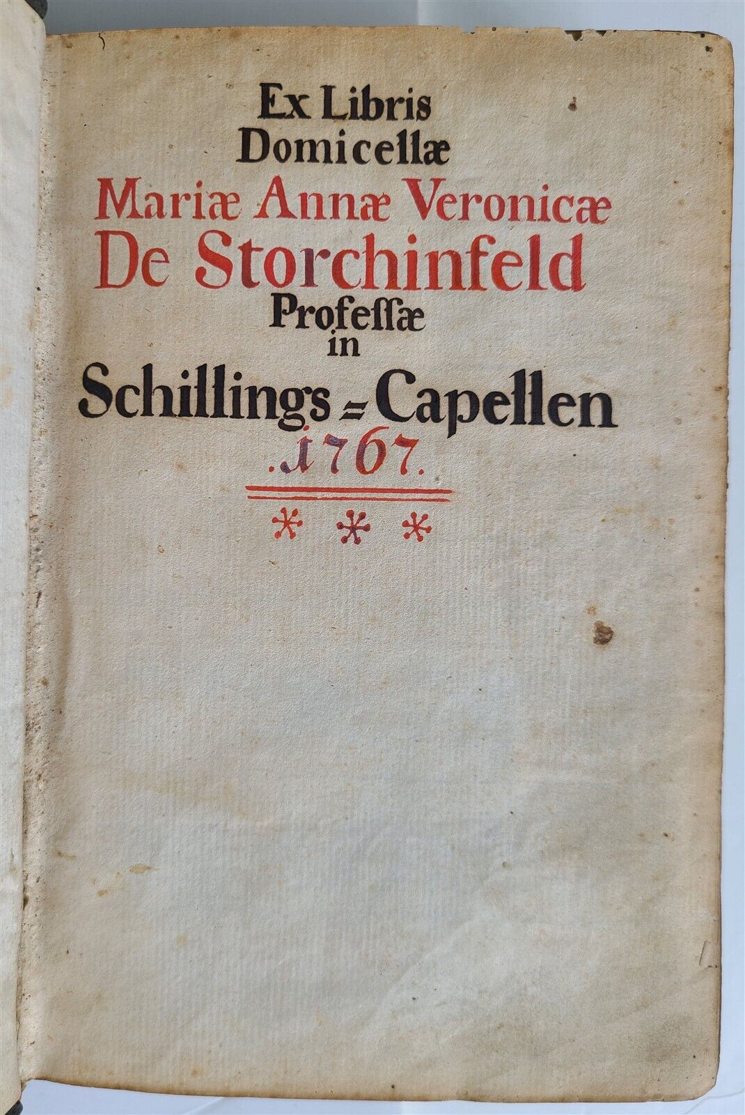 - 1 vol. with manuscript ex-libris Domicellae Mariae Annae Veronicae de Storchinfeld, Professae in Schillings-Capellen, dated 1767.