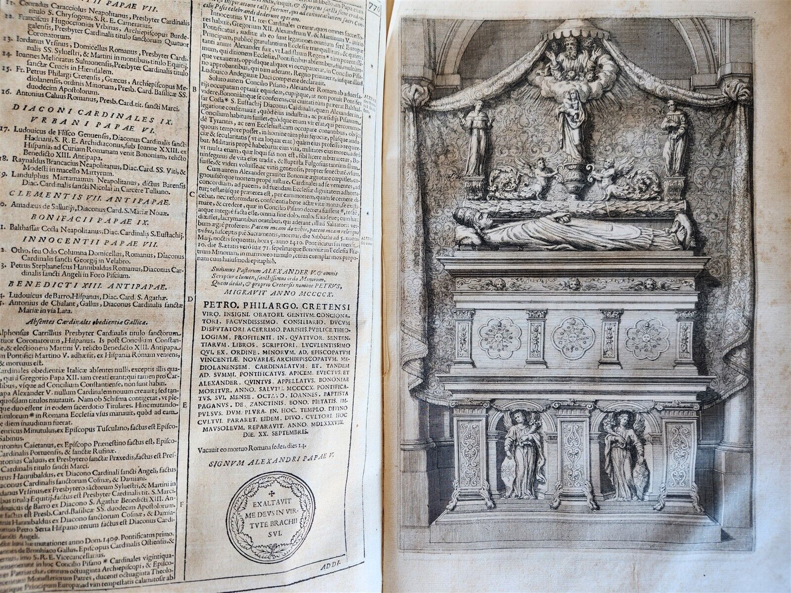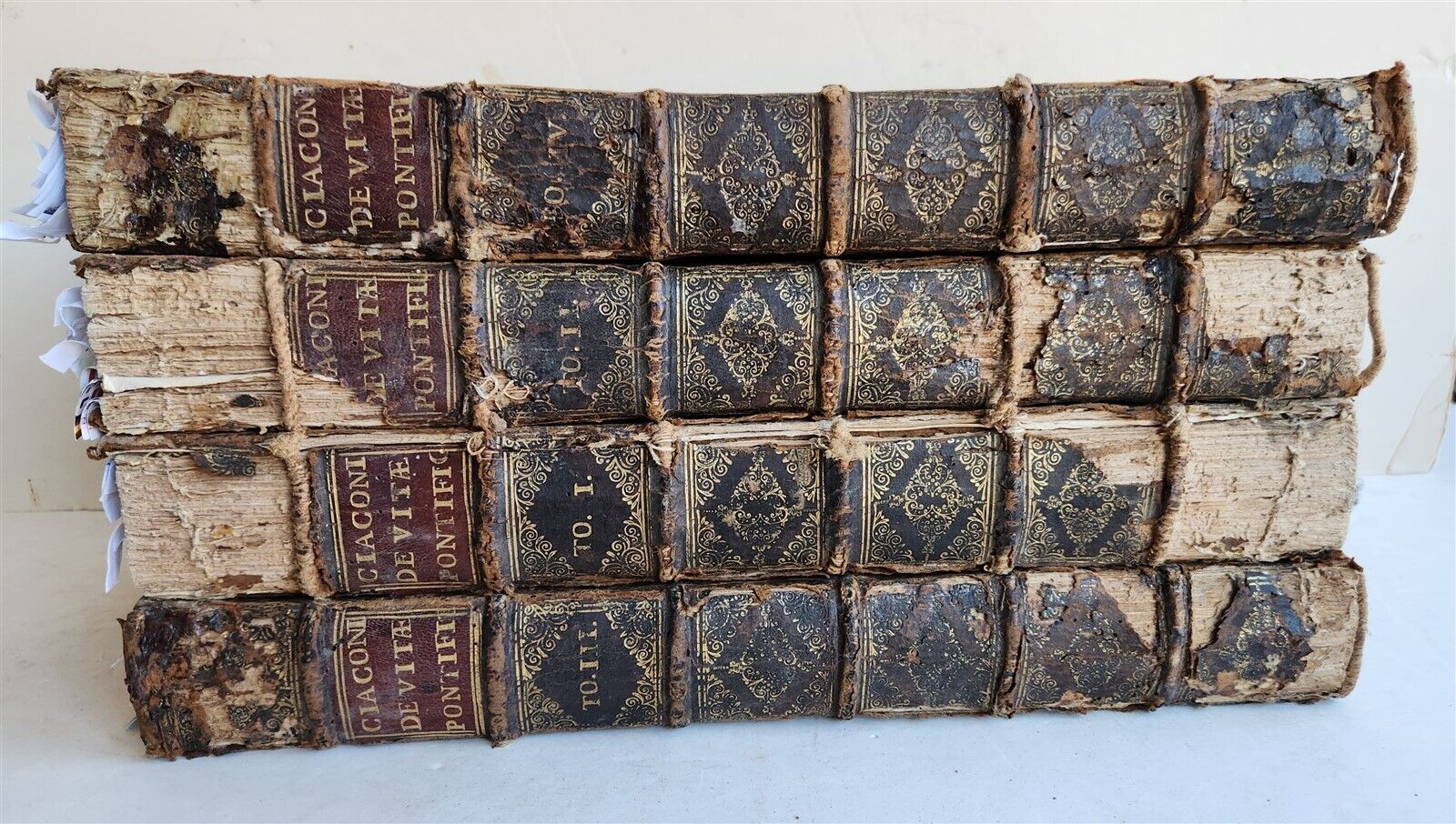 Vitae, et res gestae pontificum Romanorum et s.r.e. cardinalium ab initio nascentis Ecclesiae vsque ad Clementem IX. p.o.m. Alphonsi Ciaconii Ordinis Praedicatorum & aliorum opera descriptae: cum vberrimis notis. Ab Augustino Oldoino Societatis Iesu recognitae, & ad quatuor tomos ingenti vbique rerum accessione productae. Additis pontificum recentiorum imaginibus, & cardinalium insignibus, plurimisque aeneis figuris, cum indicibus locupletissimis.( Lives and deeds of the Roman pontiffs and cardinals from the beginning of the nascent Church to Clement IX by Alphonsus Ciaconii by Ciacconio (Chacon), A.4 volumes (complete set)Rome, de Rubeis ; 1677Massive folios: 10 3/4 by 16 1/2"With numerous full page copperplates and woodcuts. Original full leather with ribbed spines.Some wear , spines are damaged, some leaves are detached and frayed, some foxing and minor toning- Brunet II, 1 (note). Graesse II, 155 only mentions late edition. - Encyclopedic work on Popes and Cardinals, with many portraits, as well as illustrations of coins and medalsText in Latin=====================Please see my other auctions Thank You