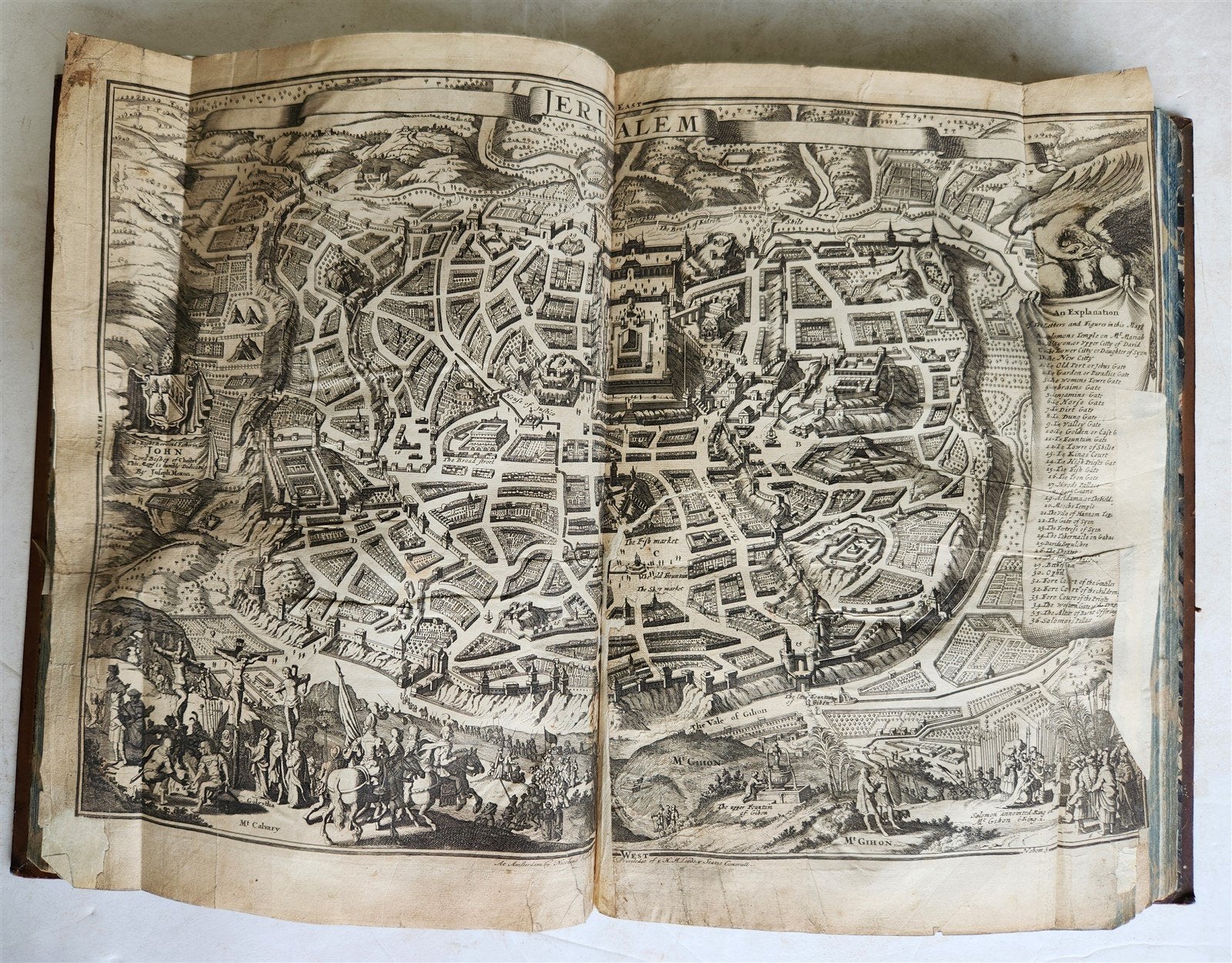 double-page plan of Jerusalem torn to edges with loss and repaired,