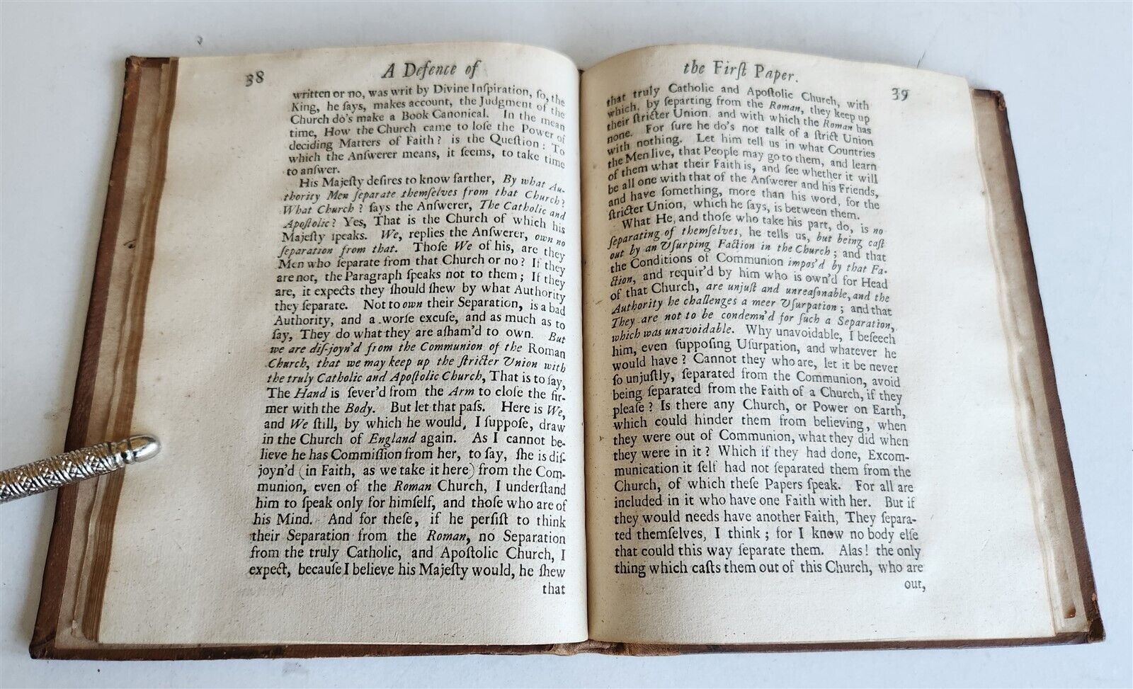(Dryden, John)A Defence of the Papers Written by the Late King Of Blessed Memory, and Duchess of York, Against the Answer made to ThemLondon: H. Hills; 1686First editionOriginal speckled tan calf, rebacked, stamped in gilt;red speckled edges; ownership inscription, dated 1783, on front paste-down; Very good condition- ESTC R22072-Size 6 1/4 by 7 3/4 inchesText in English====================================Please see my other auctions Thank You