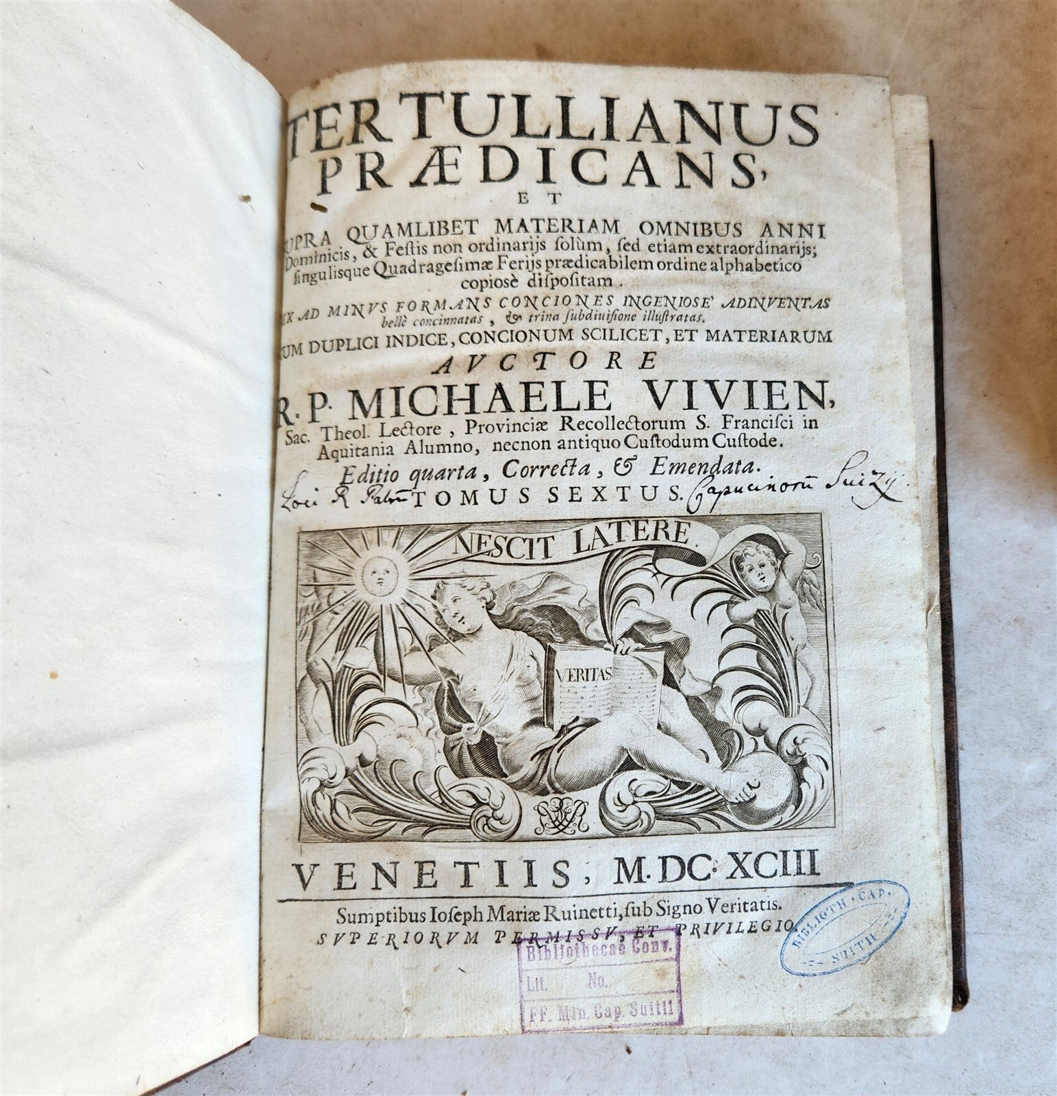 Tertullianus praedicans, et supra quamlibet materiam omnibus anni dominicis & festis... singulisque quadragesimale feriis praedicabilem ordine alphabetico dispositam... Ed. quarta. 6 volumes. Venedig, Ruinetti ; 1693 With 1 folded, engraved frontis. Not paginated. Original blind ruled leather, spines with raised bandsSize 6 1/2 by 8 3/4"Minor wear of leather, very good interior except missing 46 pages (including title) in Volume 4Text in Latin=====================Tertullian (Latin: Quintus Septimius Florens Tertullianus; c. 155 – c. 220 AD) was a prolific early Christian author from Carthage in the Roman province of Africa.He was the first Christian author to produce an extensive corpus of Latin Christian literature and was an early Christian apologist and a polemicist against heresy, including contemporary Christian Gnosticism.Tertullian was the first theologian to write in Latin, and so has been called "the father of Latin Christianity", as well as "the founder of Western theology".He is perhaps most famous for being the first writer in Latin known to use the term trinity (Latin: trinitas).Tertullian originated new theological concepts and advanced the development of early Church doctrine. However, some of his teachings, such as the subordination of the Son and Spirit to the Father, were later rejected by the Church.According to Jerome, he later joined the Montanist sect and may have apostasized; however, modern scholars dispute this.=====================Please see my other auctions Thank You