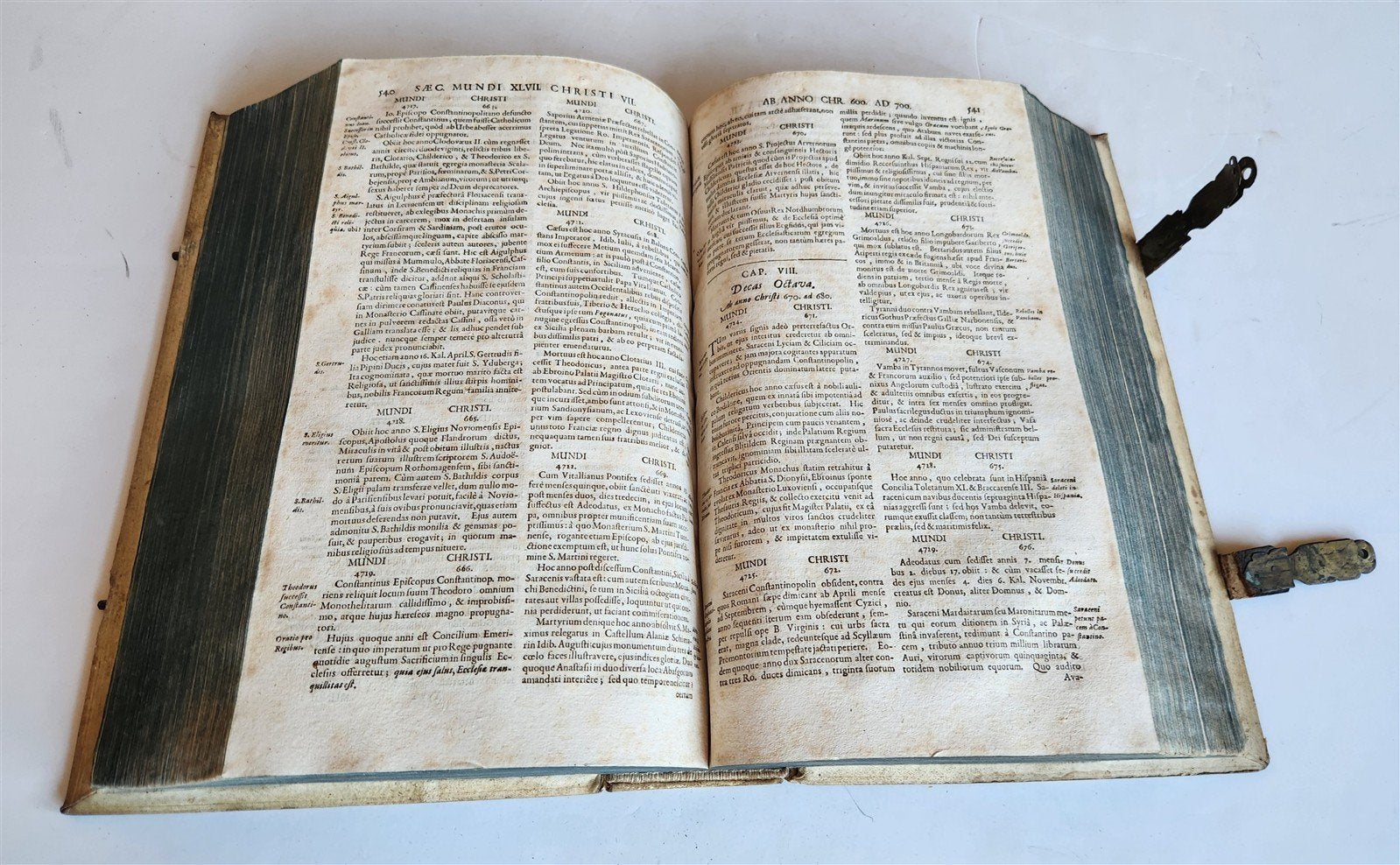 1696 WORLD'S CHRONICLE antique PIGSKIN BOUND FOLIO w/ CLASPS decorative