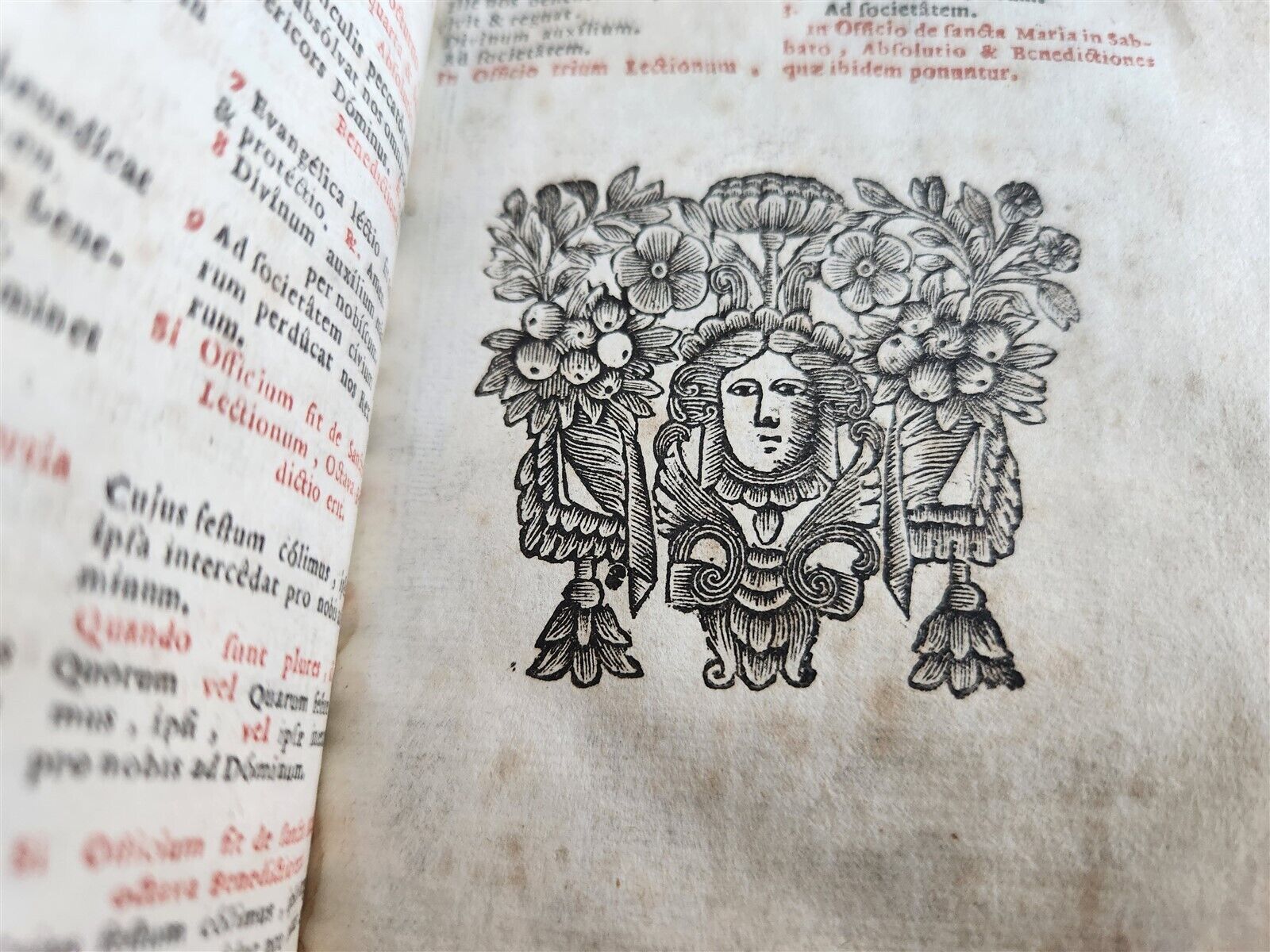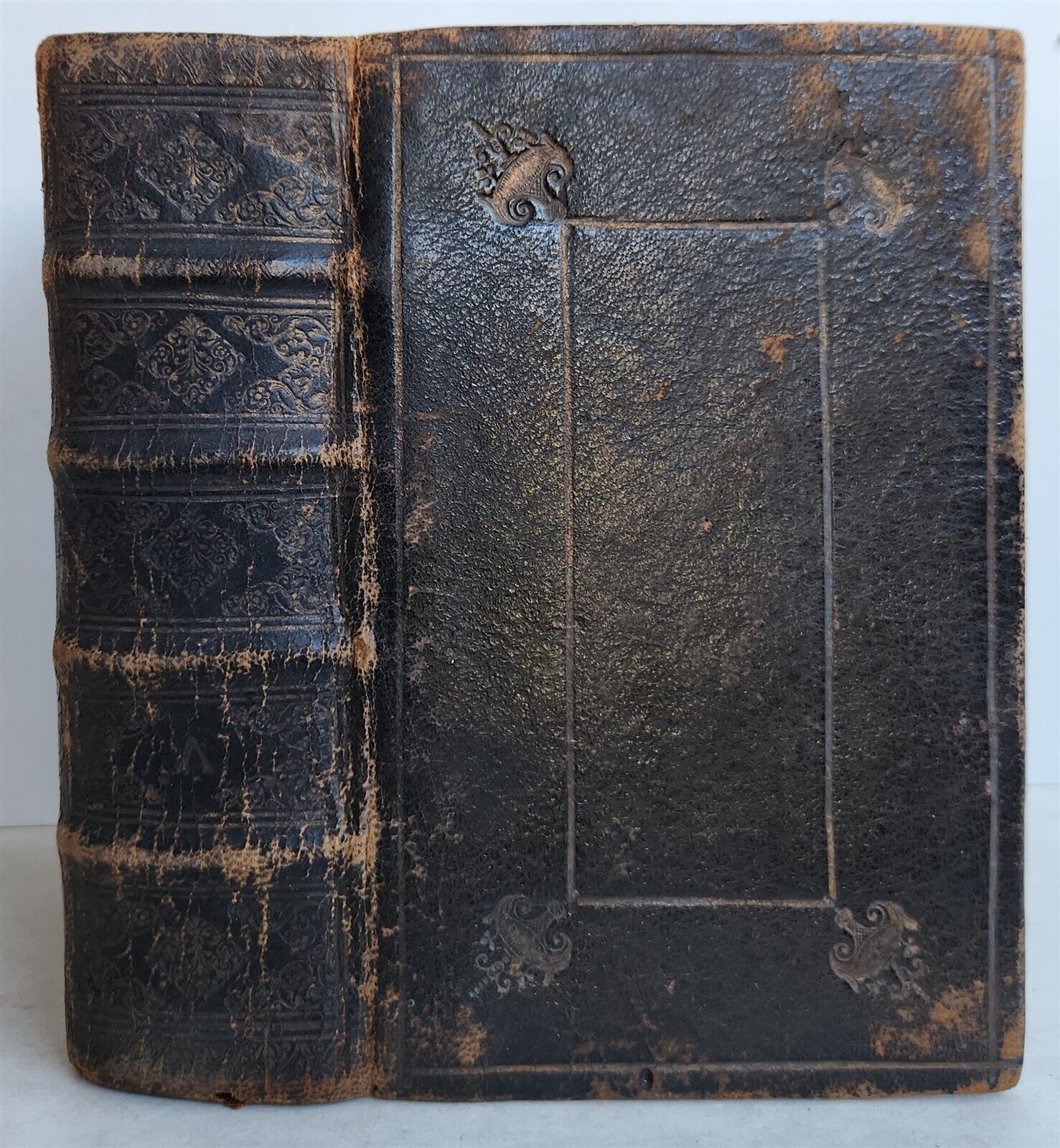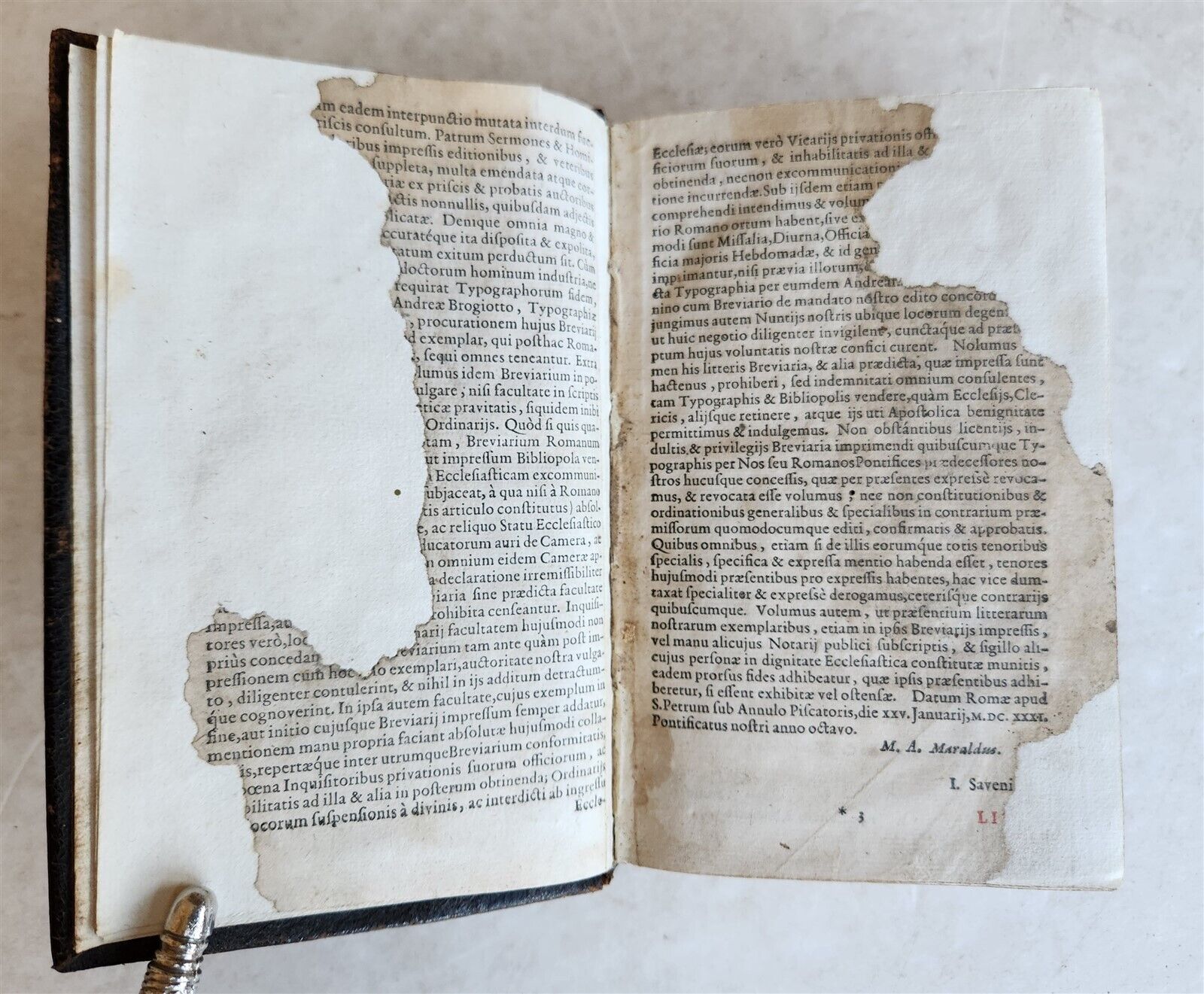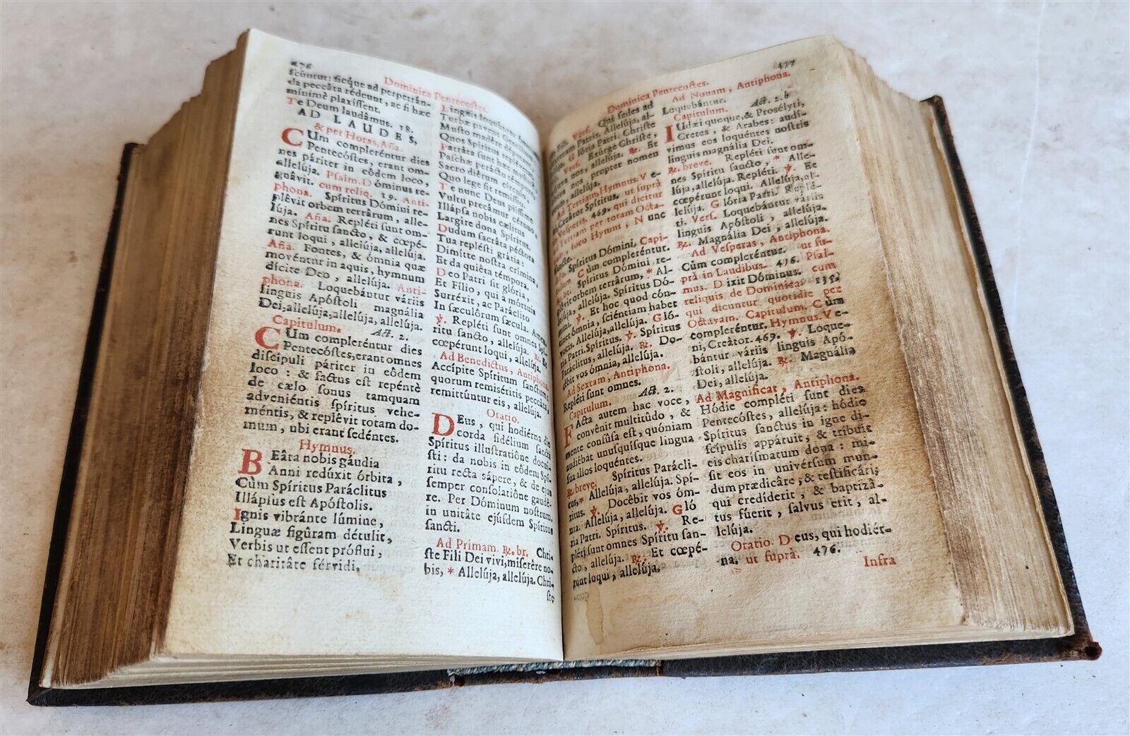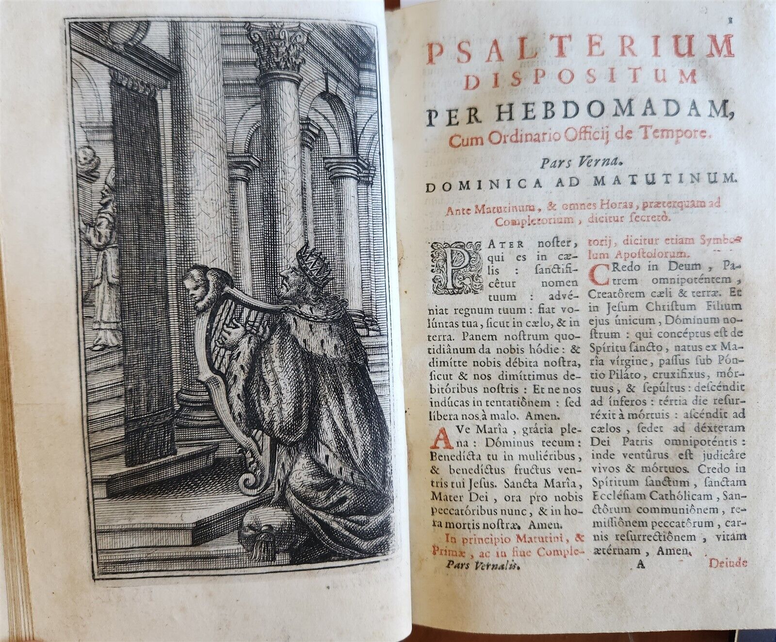 BREVARIUM ROMANUMex decreto... Pii II... Clementis VIII et Urbani VIII.w/ PsalteriumTitle page is damaged, edition information is missing[c.1700s]With one copperplate engraving. Size: 4 by 6.5 inchesblind tooled original leather binding, spinbe with raised bands, marbled endpapers, gilt edges, text in red and blackFirst 6 leaves are damaged and repaired, occasional spotsSome wear of bindingText in Latin===========================