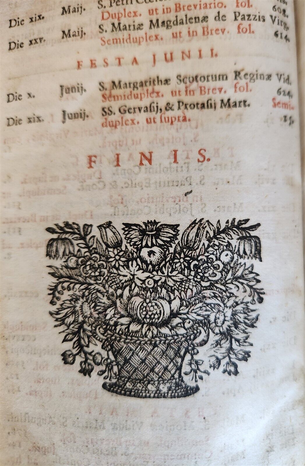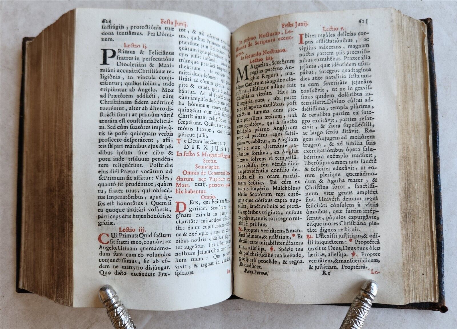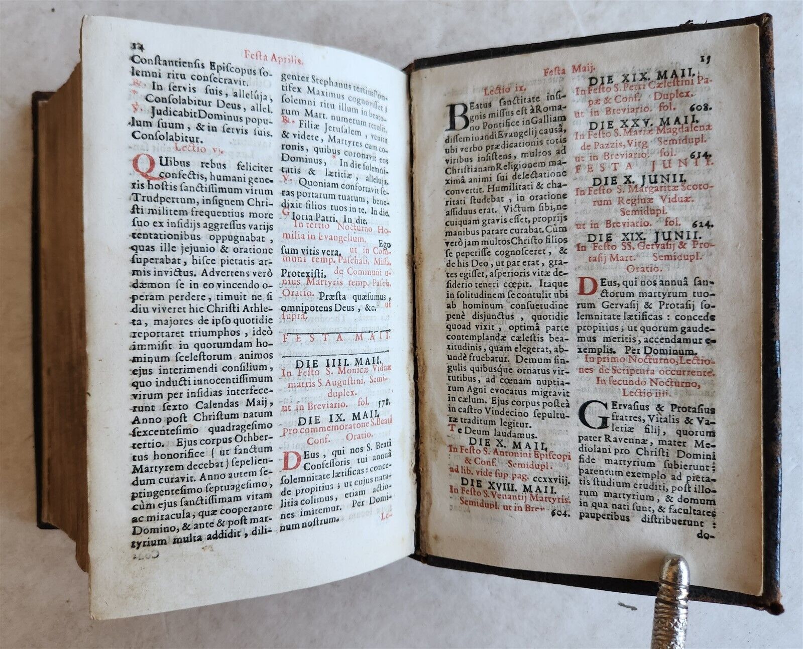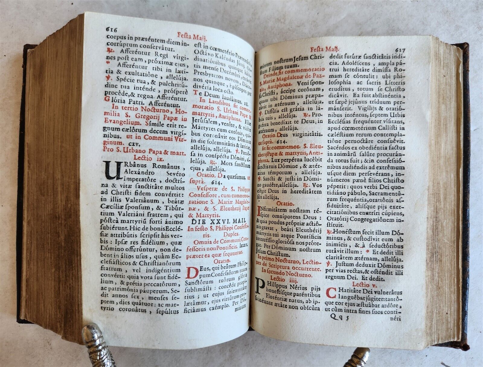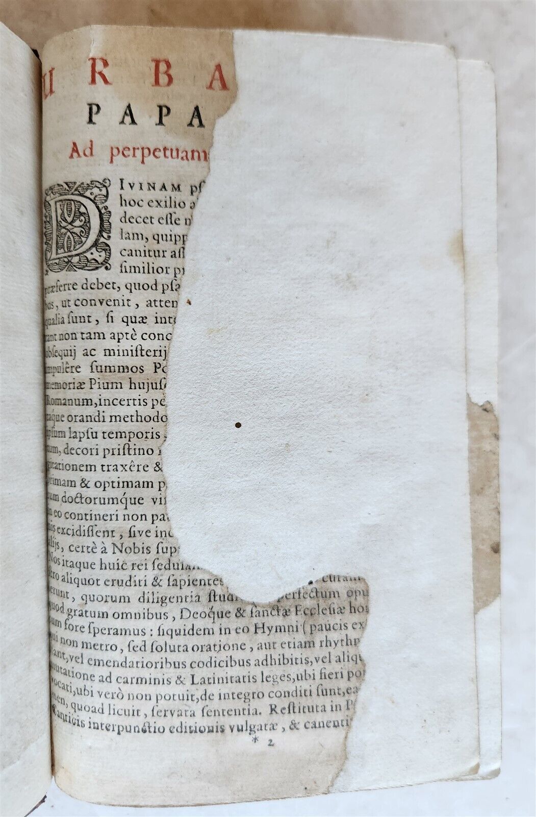 BREVARIUM ROMANUMex decreto... Pii II... Clementis VIII et Urbani VIII.w/ PsalteriumTitle page is damaged, edition information is missing[c.1700s]With one copperplate engraving. Size: 4 by 6.5 inchesblind tooled original leather binding, spinbe with raised bands, marbled endpapers, gilt edges, text in red and blackFirst 6 leaves are damaged and repaired, occasional spotsSome wear of bindingText in Latin===========================