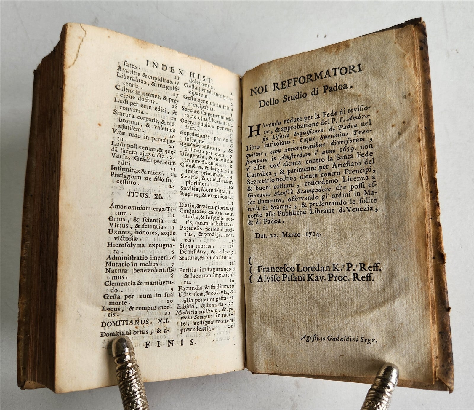 CAIUS SUETONIUS TRNAQUILLUS CUM ANOTATION DIVERSORUM1714441 pp. plus indexSize 3.5 by 6 inchesOriginal vellum binding , manuscript title to the spineVery good interior condition, minor occasional foxing, some wear of bindingText in Latin============================Please see my other auctions Thank You
