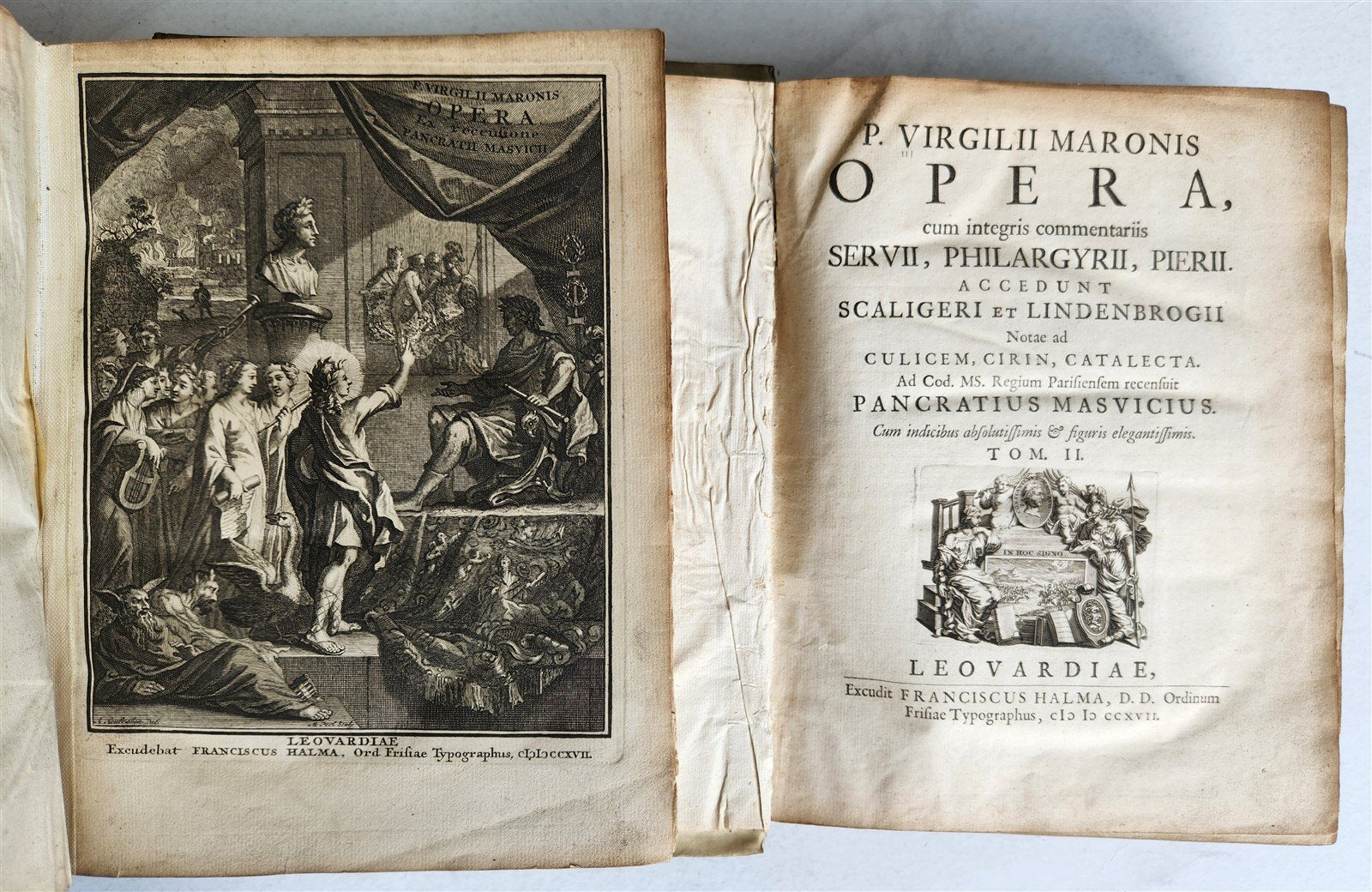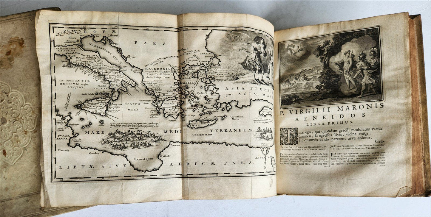 1717 VIRGIL OPERA 2 VOLUMES antique BLIND-STAMPED VELLUM BINDING illustrated