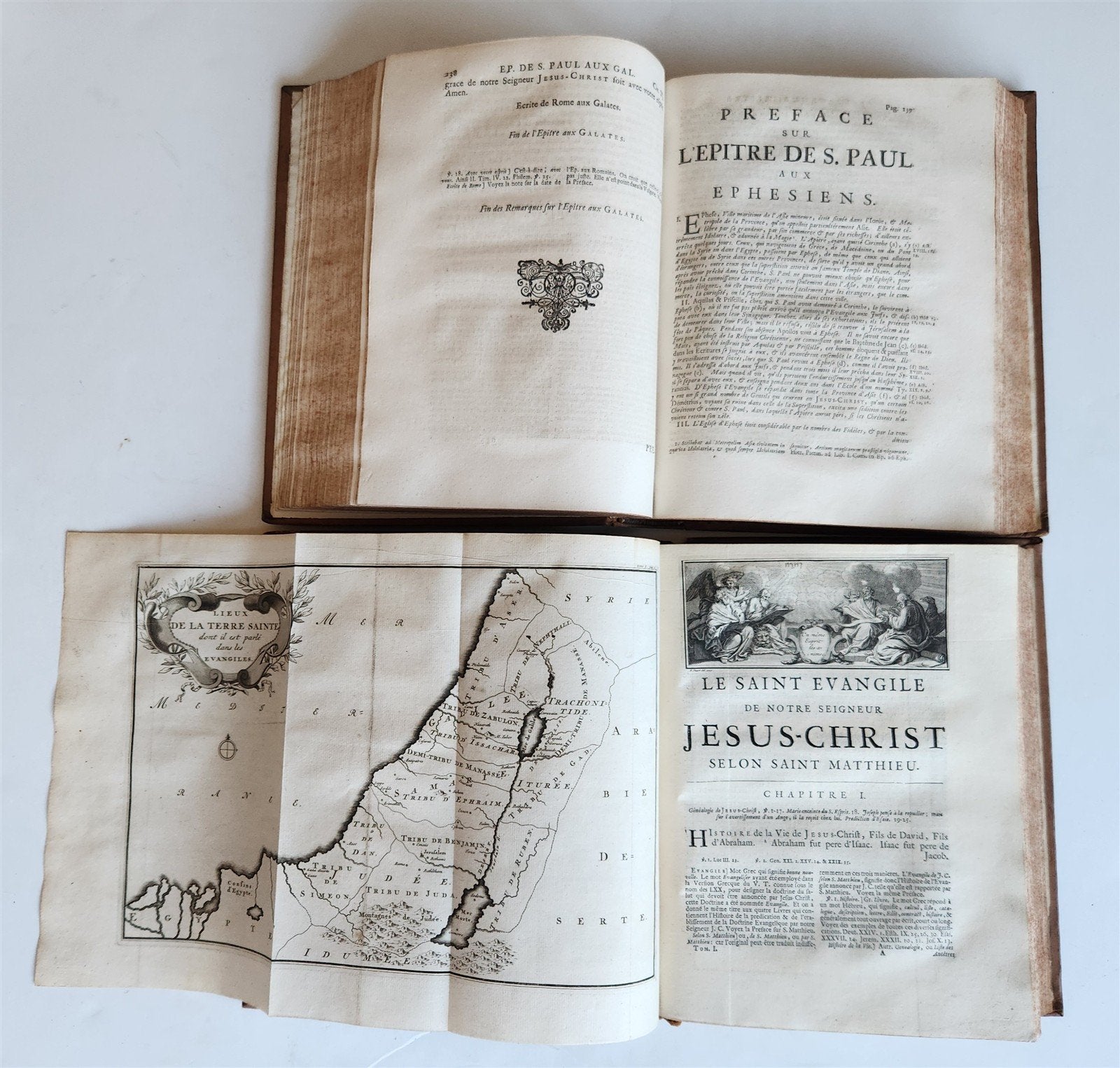 1718 BIBLE in FRENCH 2 volumes NEW TESTAMENT antique ILLUSTRATED w/ MAPS