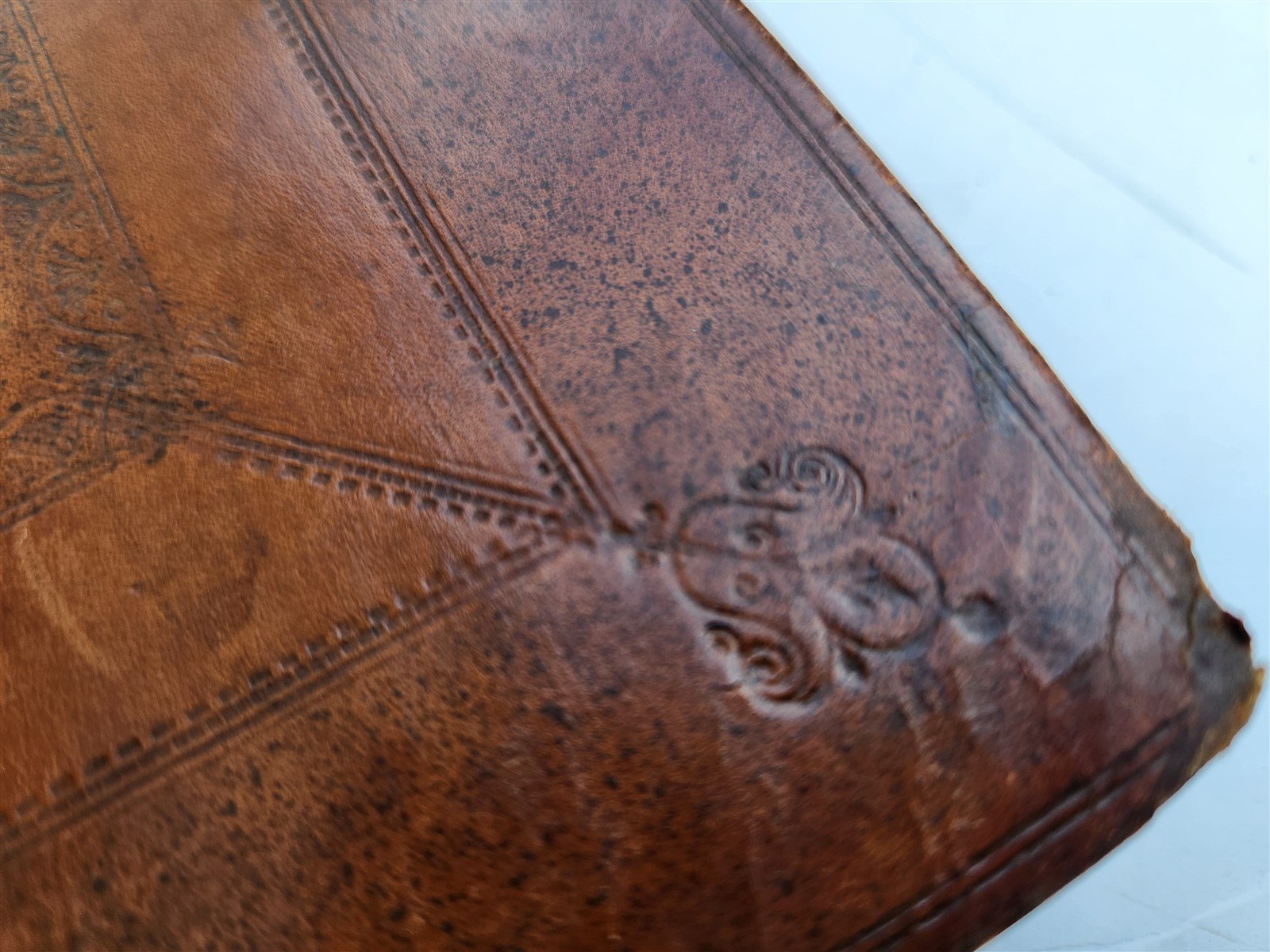 Some wear of binding, damage to the lower end of the spine, dampstained