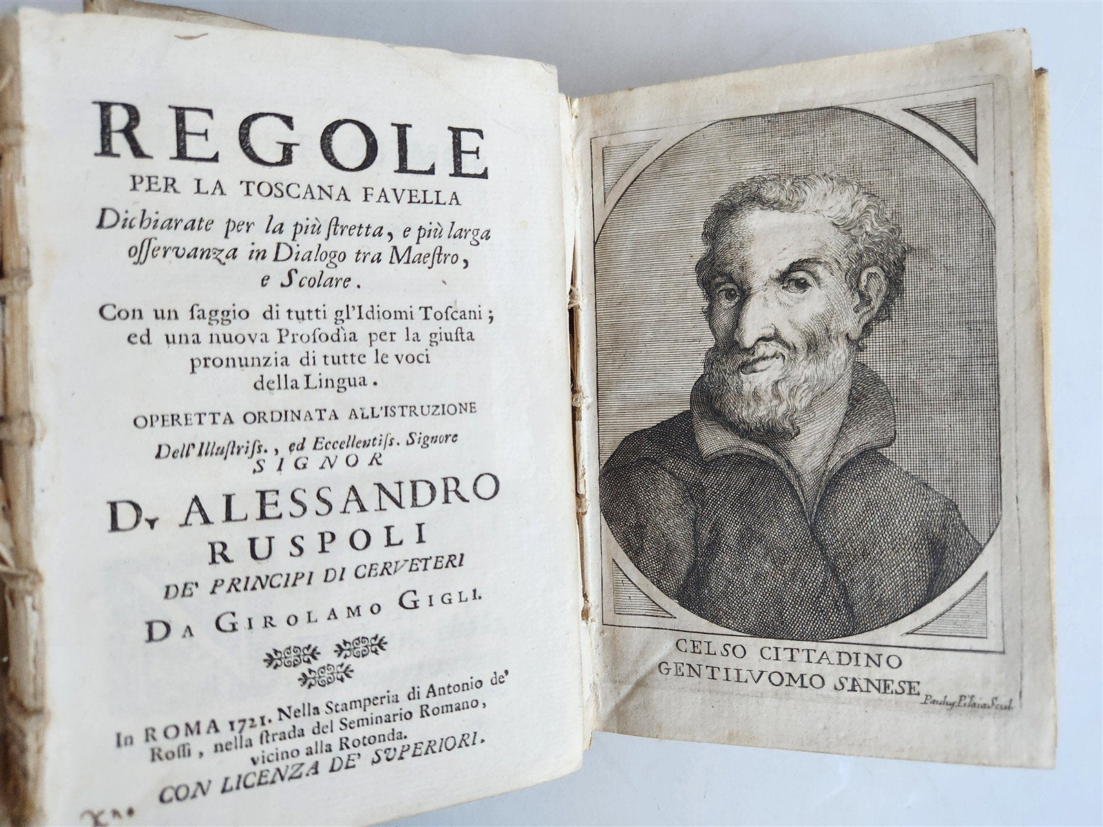 Last edition by Girolamo Gigli (1660-1722) published during his lifetime, being a commentary on Celso Cittadini (1553-1627)'s treatise on the dialects of Tuscan and Vulgar Latin.