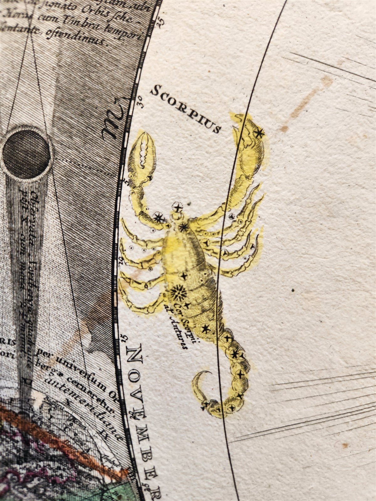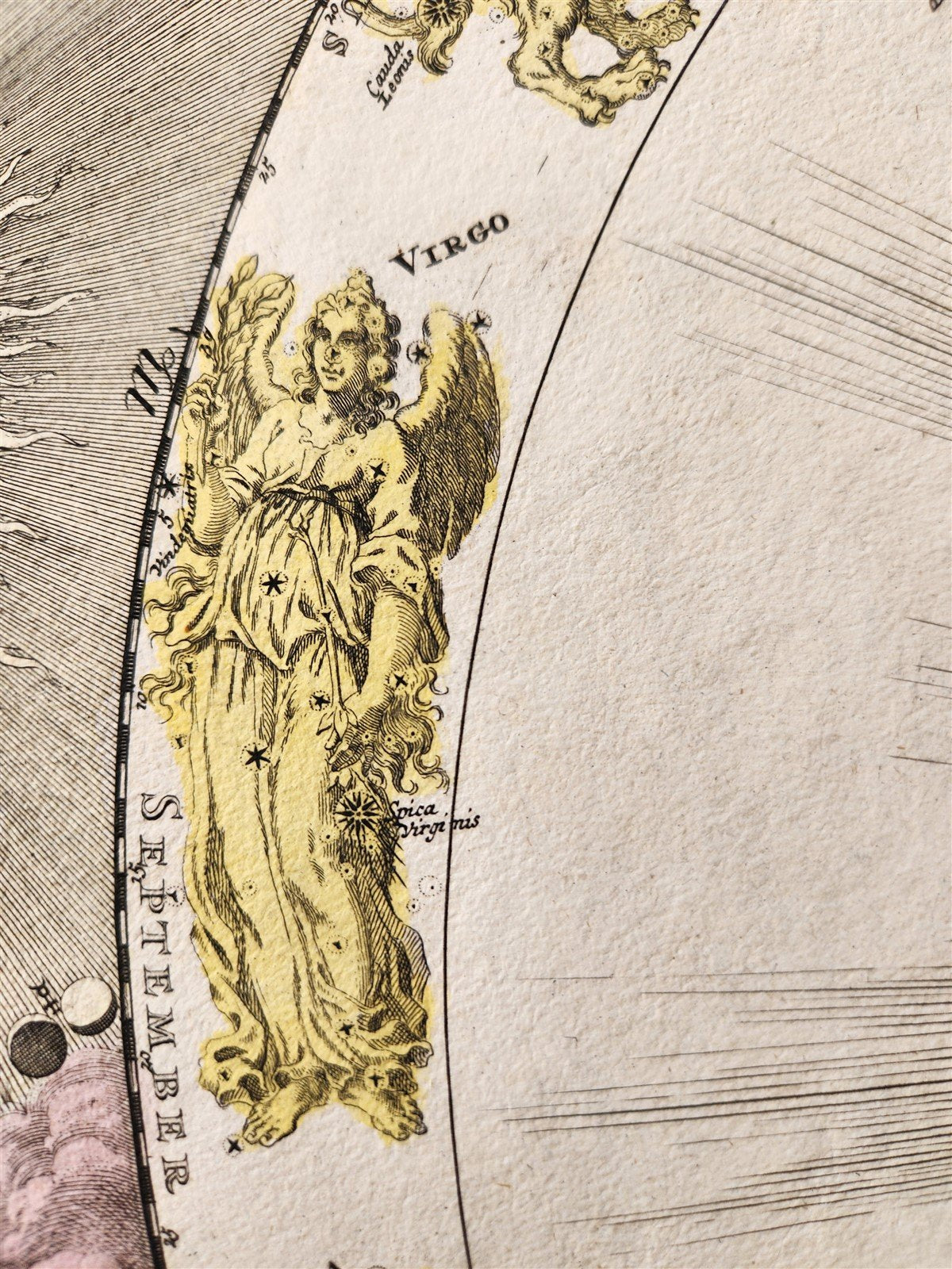 This chart almost rivals those of Cellarius in its artistic arrangement of technical information complemented by elaborate surrounding illustrations. Here, however, Dopplemayr includes additonal astronomical information along with purely decorative touches. Urania, personified in the lower right corner is especially fetching as she daintily dangles a diagram of the Copernicus system from its decorative ribbon-like border.