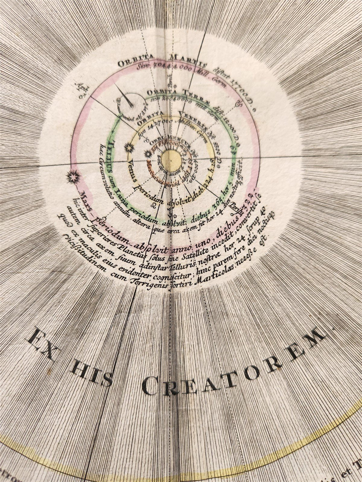 In the center, planetary paths from Earth and inner planets to Jupiter and Saturn are shown in a sunburst, all within a concentric ring of Baroque representations of the 12 signs of the zodiac.