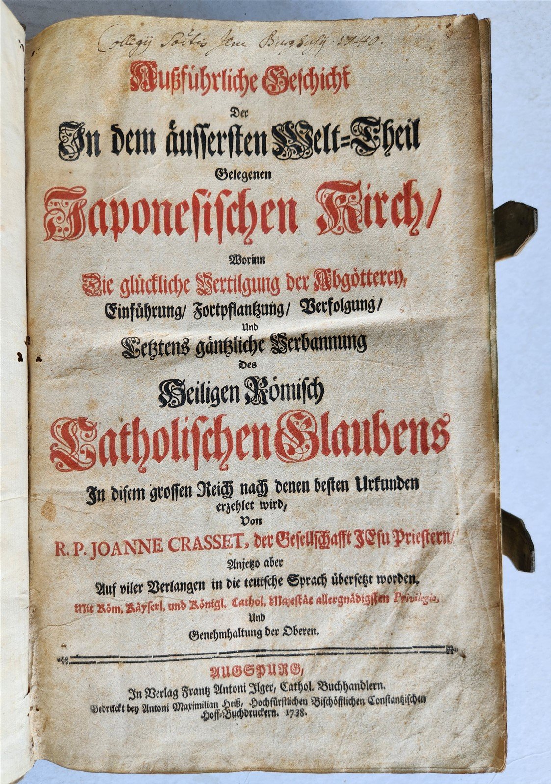 Ausfuhrliche Geschicht der in dem aussersten Welt-Theil gelegenen Japonesischen Kirch, worinn die glückliche Vertilgung der Abgotterey, Einfuhrung, Fortpflantzung, Verfolgung, und letztens gantzliche Verbannung des Heiligen Romisch Catholischen Glaubens... erzehlet wird.