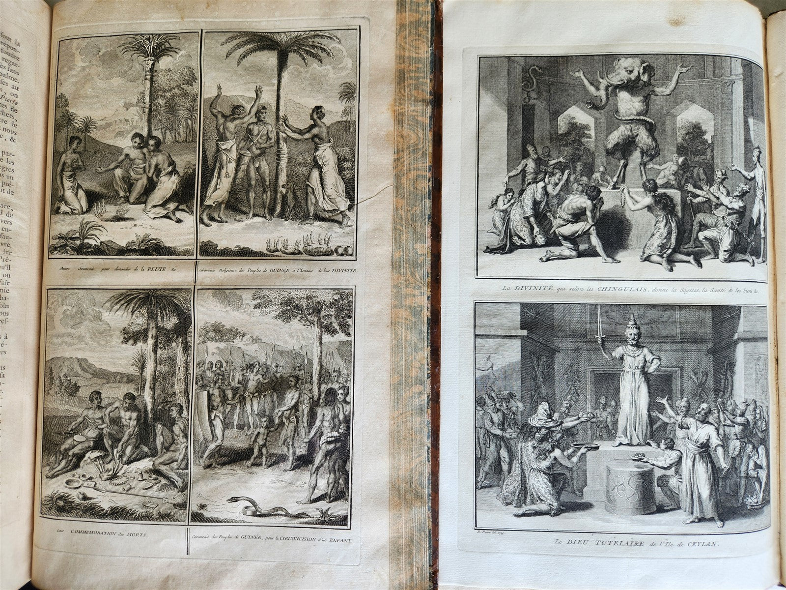 Picart Bernard[ Antoine Banier (1673 - 1741), Jean Baptiste Le Mascrier ]HISTOIRE GENERALE des CEREMONIES, MOEURS, et COUTUMES RELIGIEUSES de tous lesPEUPLES DU MONDE Paris: chez Rollin fils, 17417 volumes in-folio : 10 by 15.5 inches (mm 390x240)Original full calf binding with gold titles and decorations on the ribbed spine. Marbled edges and endpapers. Ex-libris of a previous owner on the front pastedown of each volume. A celebrated work, famous for its beautiful engravings based on drawings by Picart. This is second edition (after Amsterdam), the first published in France.Based on the one published in Amsterdam in 1723-43, but with the texts revised and expanded by Abbots Banier and Le Mascrier on the basis of new information that reached them from various Catholic missions. The illustrations, on the other hand, largely follow those of the Dutch edition.See Brunet I, 1743: «This edition was published under the literary direction of the Abbot Banier; but the text, both entirely revised and simply corrected, is due to the Abbot Lemascrier, as well as the new dissertations»; Cohen-Ricci 135; Hiler 708; Lewine 414; Sander 1548. Beautifully illustrated works depicting the rites and rituals of various beliefs but also costumes, deities, etc. The work deals with religious practices in Asia, Africa, North and South America and Europe, including Judaism, Islam, Catholicism, Greek Orthodox, and the various forms of Protestantism, as well as orders of chivalry and the inquisition. Despite condemnation by the Catholic church, the work was a resounding success.Engraved frontispiece , over 200 illustrationstitles printed in red and black with engraved vignettes by CochinVery good condition,some wear of bindings, a few occasional spots, one engraving is detached (but present)Text in French