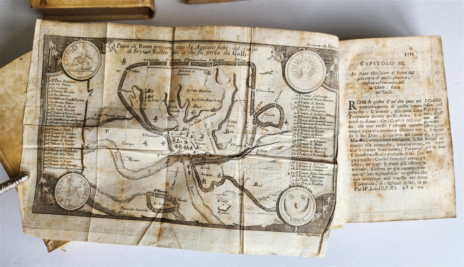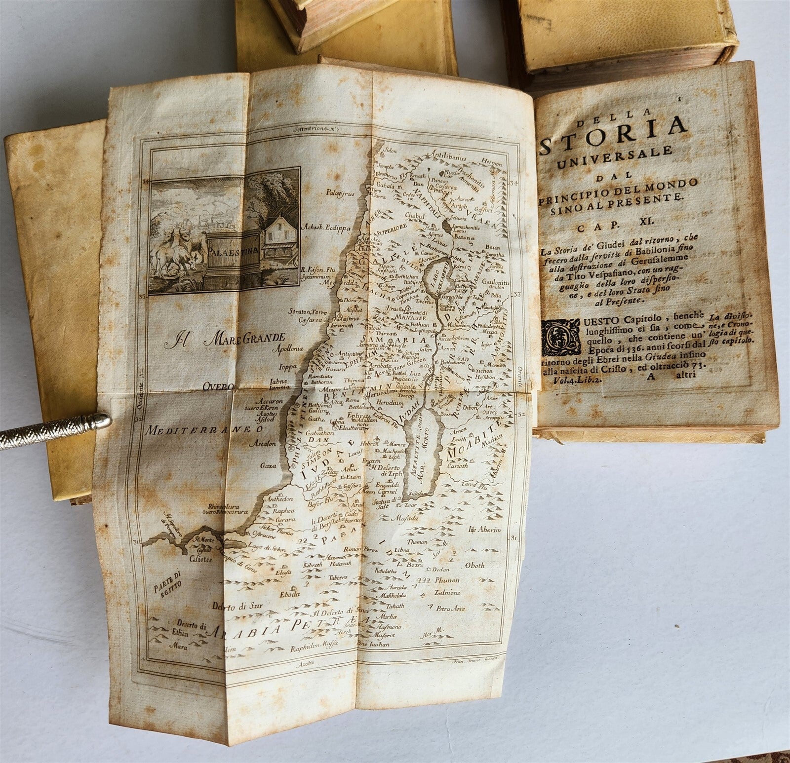 Della storia universale. (universal history) Naples: 17417 volumes (incomplete set)Copperplate typographic mark on the frontispiece of the first part of volume IV, some copperplate plates of folded maps and viewsbrowning, foxing, one of the cover with damaged vellum (visible on the photo)Original vellum, gilt title labels on the spinesProvenance:Puricelli di Gallarate (ex libris on the flyleaf and seal stamp on the frontispieces) Size 4.5 by 7.5 inchesText in Italian================================