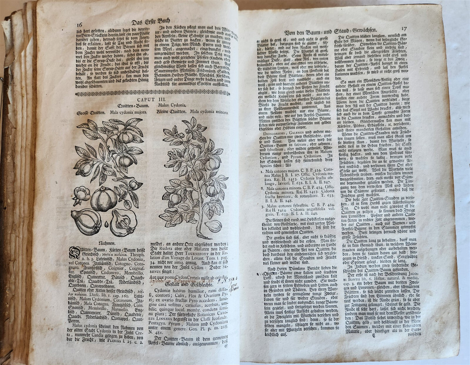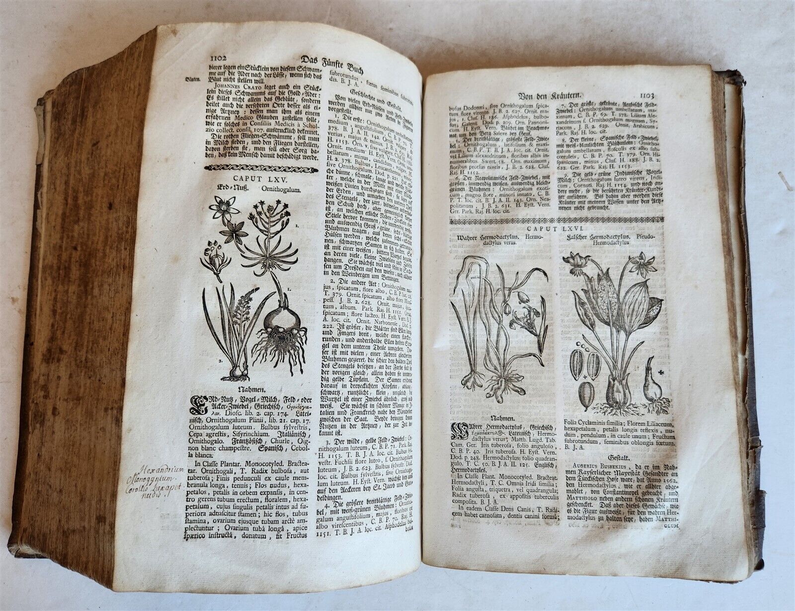 Theatrum Botanicum. Ist: Vollkommenes Krauter-Buch, Auf das Neue ubersehen durch F. Zwinger. ( Theatrum Botanicum, a complete herbal book, revised by F. Zwinger) Basel, Bischoff ; 1744Folio: 9 by 14.5" With engraved frontis, folded engraved portrait and approximately 1200 plant woodcuts. 6 (instead of 7) leaves, 1216 pages, 28 leavesOriginal blind stamped pigskin , worn, soiled- Nissen, BBI 1311. Pritzel 10532. - Expanded new edition of Zwinger's herbal book, which in turn is a new edition by Mattioli. In this edition, produced by Zwinger's son, the progress of botany was already taken into account, but with a deliberate exclusion of Linnaeus. Portrait with a closed tear, some wear, occasional spots, a few tears, one leaf with repaired corner (no text loss)Some period marginalia.Text in German==================================Please see my other auctions Thank You