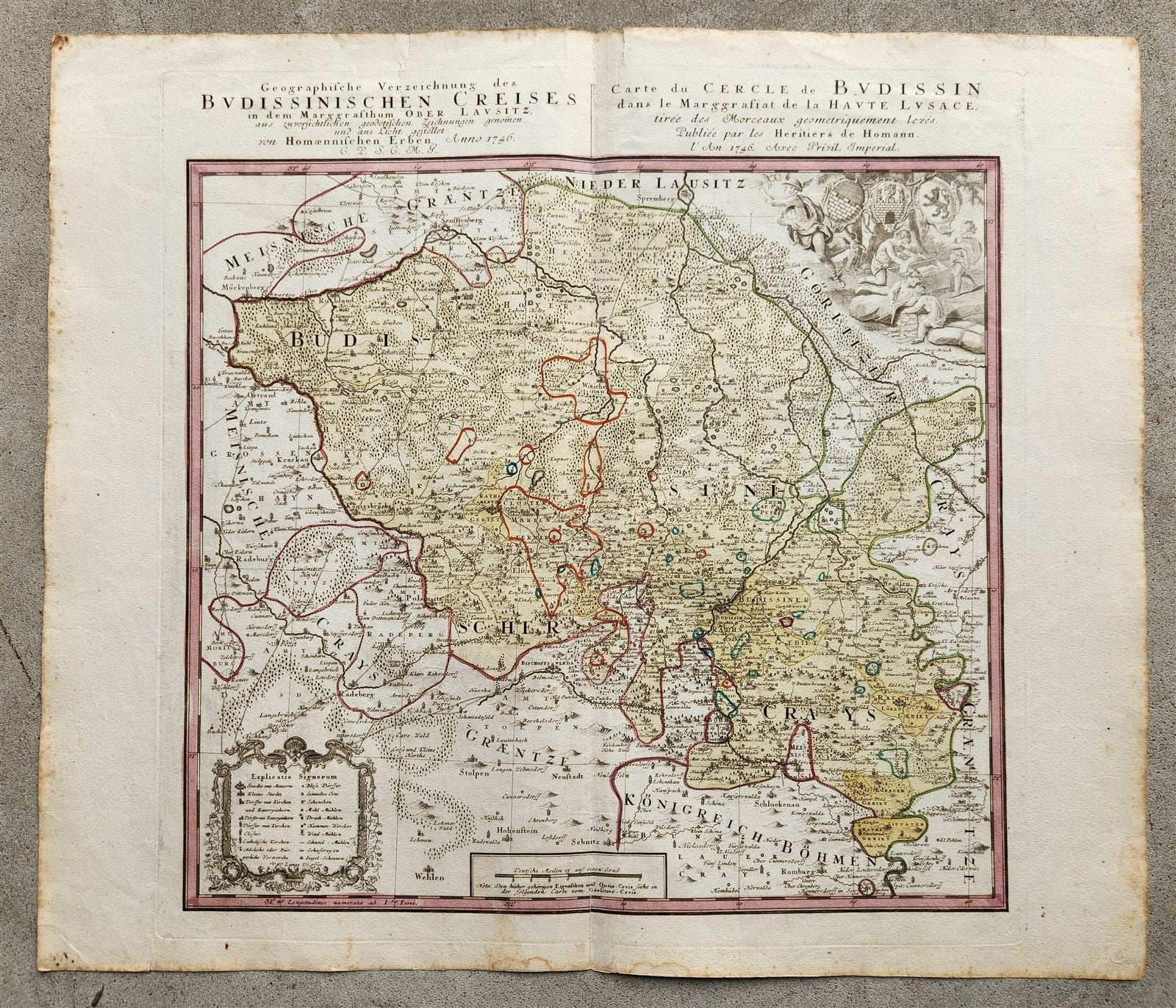 This is a very detailed map of the vicinity of Bautzen in eastern Saxony. The district is bounded by mountains and filled with forests and tiny villages. An extensive key in a cartouche at lower left identifies a variety of churches, schools, blacksmiths, and mills. The cartouche in the opposite corner features a group of putti working with textiles, a major industry of the region, and the coats of arms. There is also a French title, Carte du Cercle de Budissin dans le Marggrafiat de la Haute Lusace…