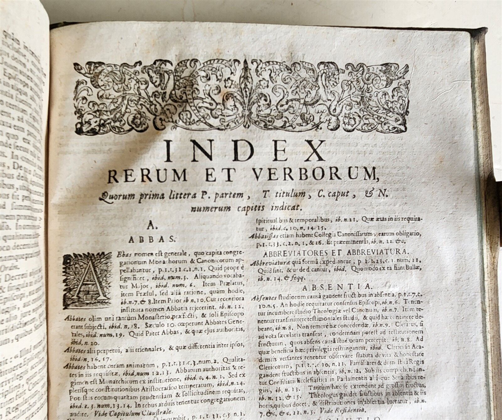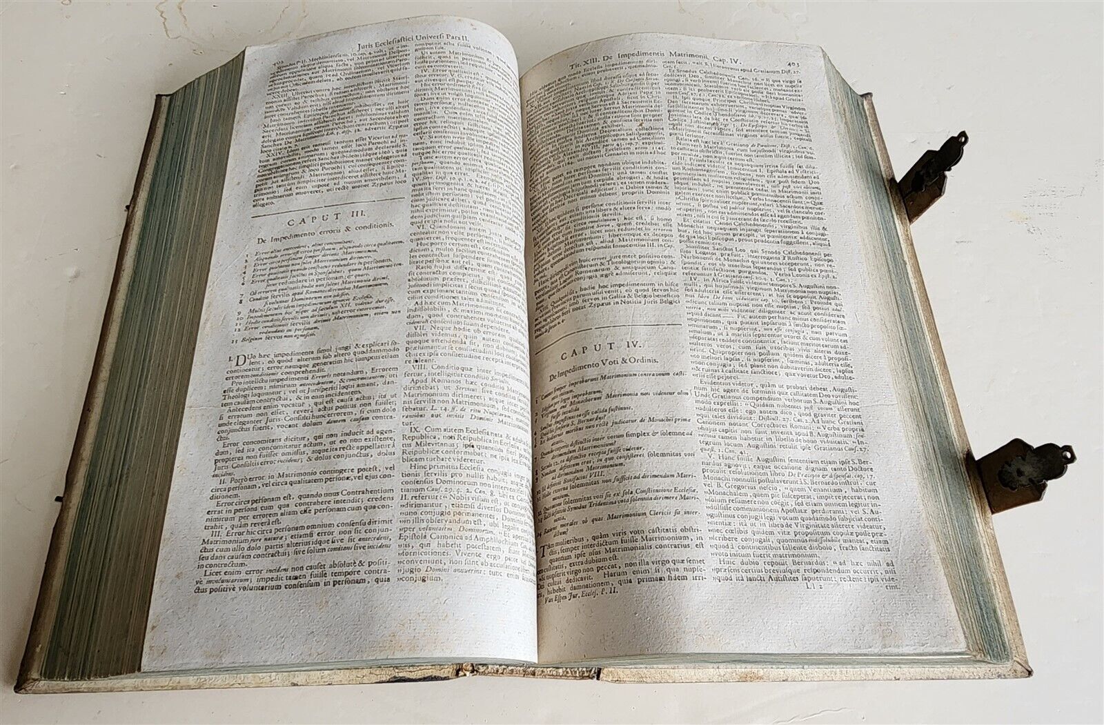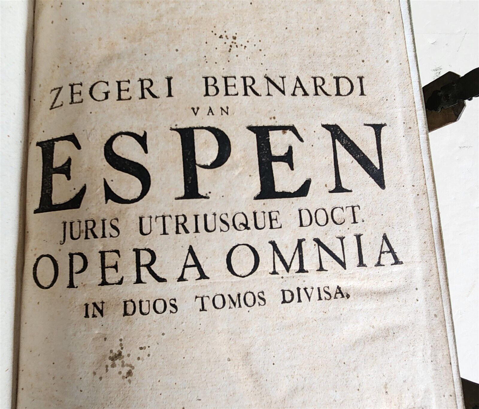 Jus ecclesiasticum universum, hodiernae disciplinae praesertim Belgii, Galliae, Germaniae, et vicinarum provinciarum accommodatum...3 parts in 1 volume Cologne, Metternich; 174813 pages, 750 pages, 196 pages, 30 pagesListed in Index librorum prohibitorum (ed. 1841). p. 131. ( included in the index because of Jansenist views of the author, Z. B. Espen)Folio: 8.5 by 14.5"Original blind-stamped pigskin over wooden boards with 2 metal clasps. Some toning, very good conditionText in Latin ====================Zeger Bernhard van Espen (Espenius) (9 July 1646 at Leuven – 2 October 1728 at Amersfoort, Netherlands) was a Belgian canonist, who supported Gallican theories and was an ardent upholder of secular power against religious authority. Van Espen is generally classed among the ablest writers on ecclesiastical law.=====================Please see my other auctions Thank You