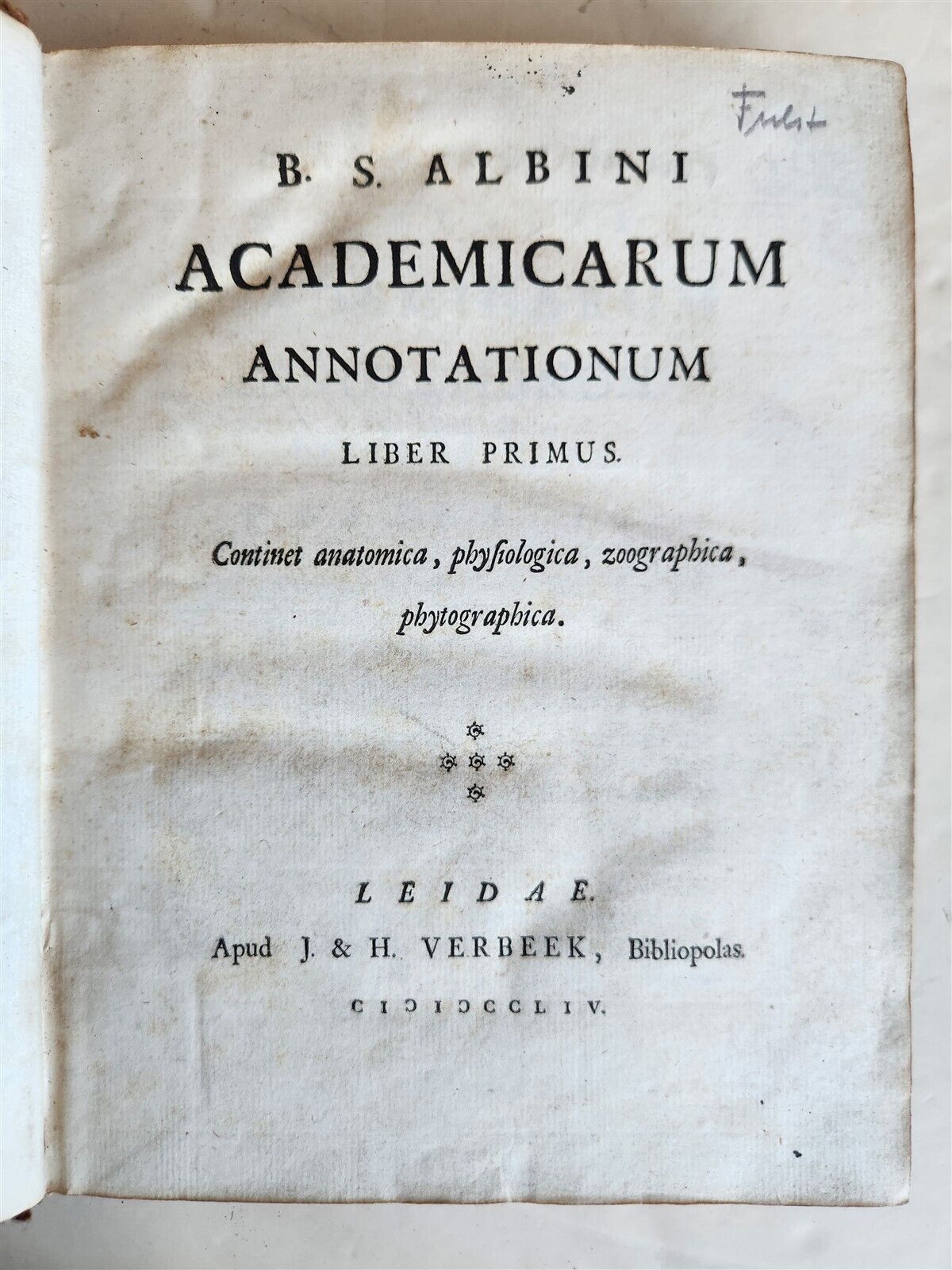 Albinus,B.S.Academicarum annotationum. Continet anatomica, physiologica, zoographica, phytographica. Leiden, Verbeek; 1754-58Size 7 3/4 by 10"With 28 copper plates Bound with: Oratio... in Academico Lugduno-Batava... Leiden, Mulhovius ; 1721With engraved title page. 2 leaves, 67 pages. Original leather. Spine with raised bands , decorated in gilt- First edition - The plates show illustrations of anatomy (uterus, embryo, etc.), dentistry and botanyMinor wear of binding, very good interiorText in French==================================================Please see my other auctions Thank You