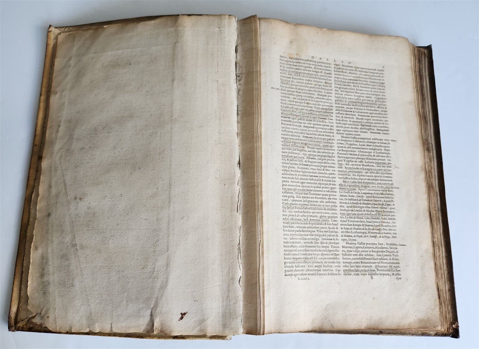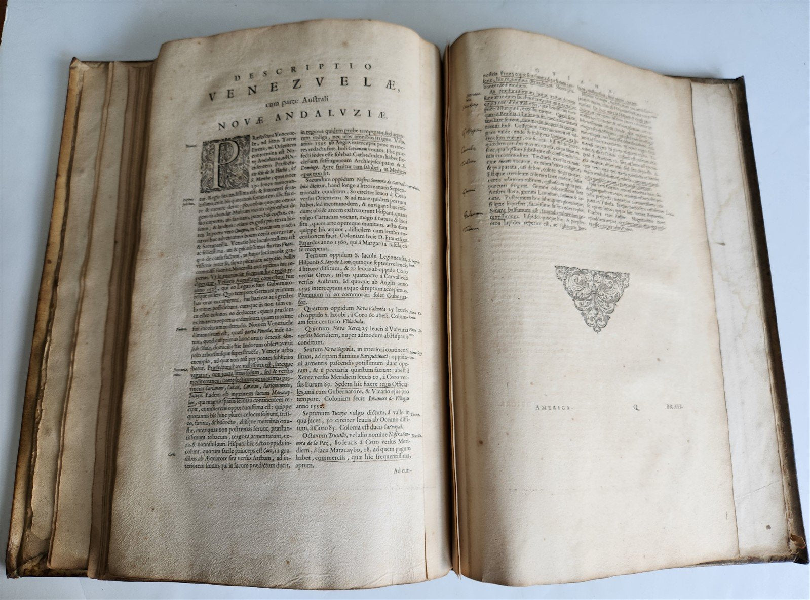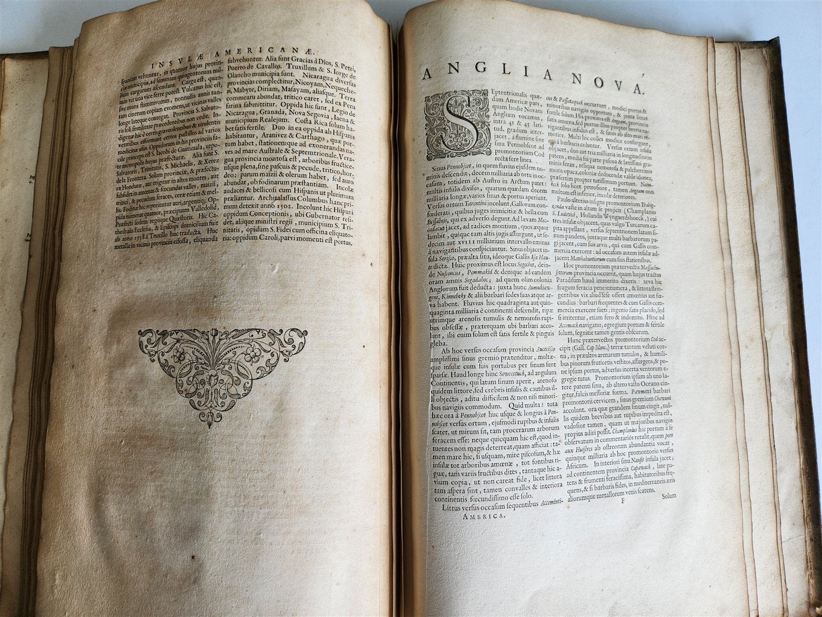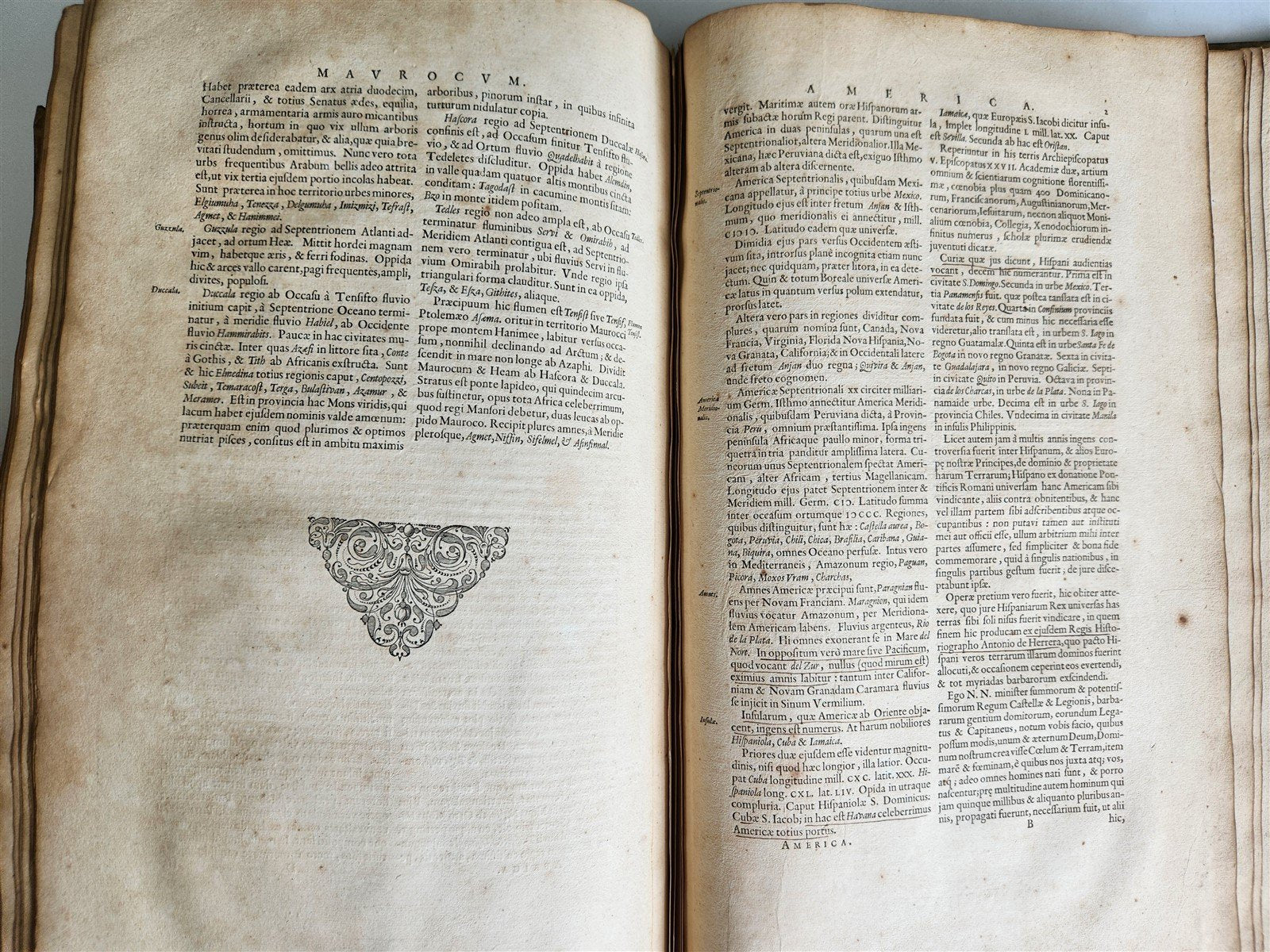 WIth some leaves left with descriptions of Gallia, Belsia, Normannia, Burgindia, Benearnia, Belloiolesii, Sabaudia, Karoli Magni Imperium, Hispania, Catalonia, Algarbia, Andalusia, India, Iapon (Japan), Tartaria, Persia, Palaestina, Africa, Regnum Maurocanum, America, Nova Hispania, Anglia Nova, Venezuela