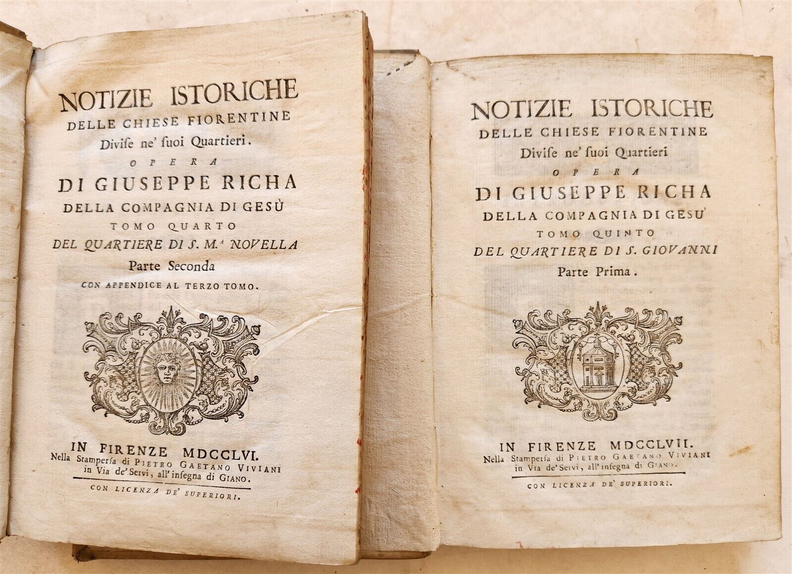 NOTIZIE ISTORICHEDELLE CHIESE FIORENTINEby GIUSEPPE RICHA2 volumes, complete setIn Firenze; 1756-1757Size 7.5 by 10"Original full vellum, with title labels at the spines, sprinkled edgesBinding worn, with damagesFirmly attachedInterior is clean, in very good conditionWide marginsIllustrated with fold-out engravingsOtherwise good condition.Text in Portuguese======================== Please see my other auctions Thank You