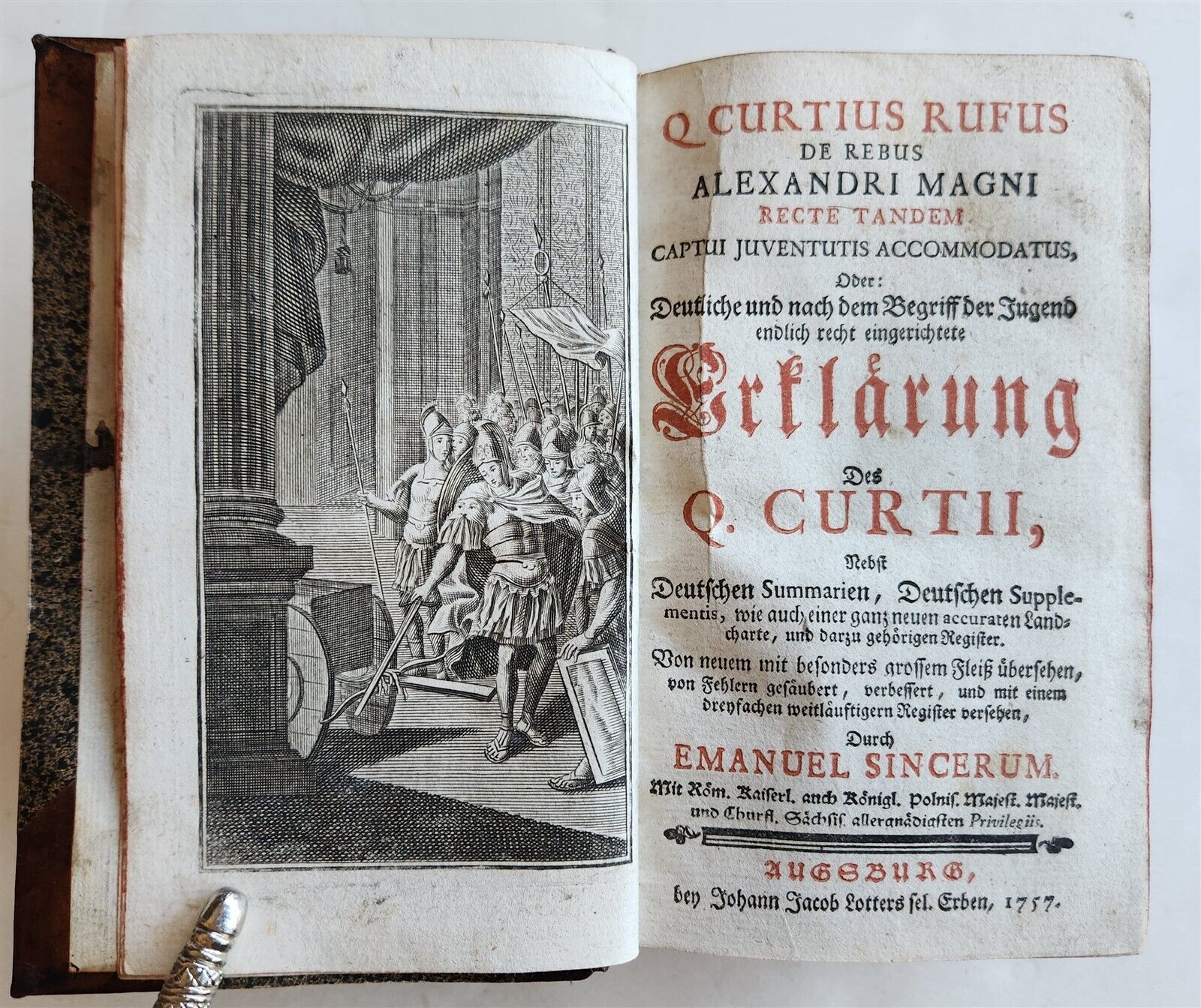 Curtius Rufus, Q.De rebus Alexandri Magni recte tandem captui juventutis accommodatus, oder: Deutliche und nach dem Begriff der Jugend endlich recht eingerichtete Erklärung des Q. Curtii,... verb. ...durch E. Sincerum.Augsburg, Lotter Erben; 1757 With engraved frontis and 1 folded copperplate map. 35 leaves, 865 pages, 78 leaves Original 3/4 leather over cardboardRare Augsburg Lotter edition of the life of Alexander the Great.Good condition, a few spotsSize 4.5 by 7"Text in Latin=============================Please see my other auctions Thank You