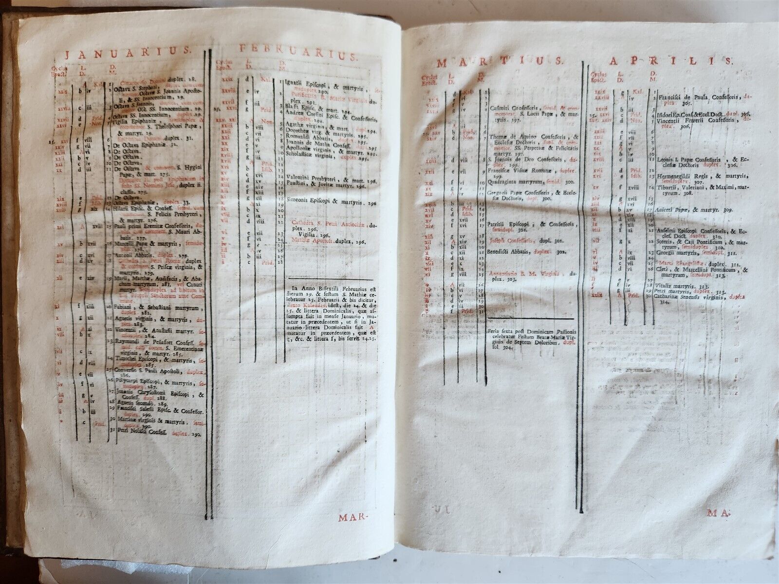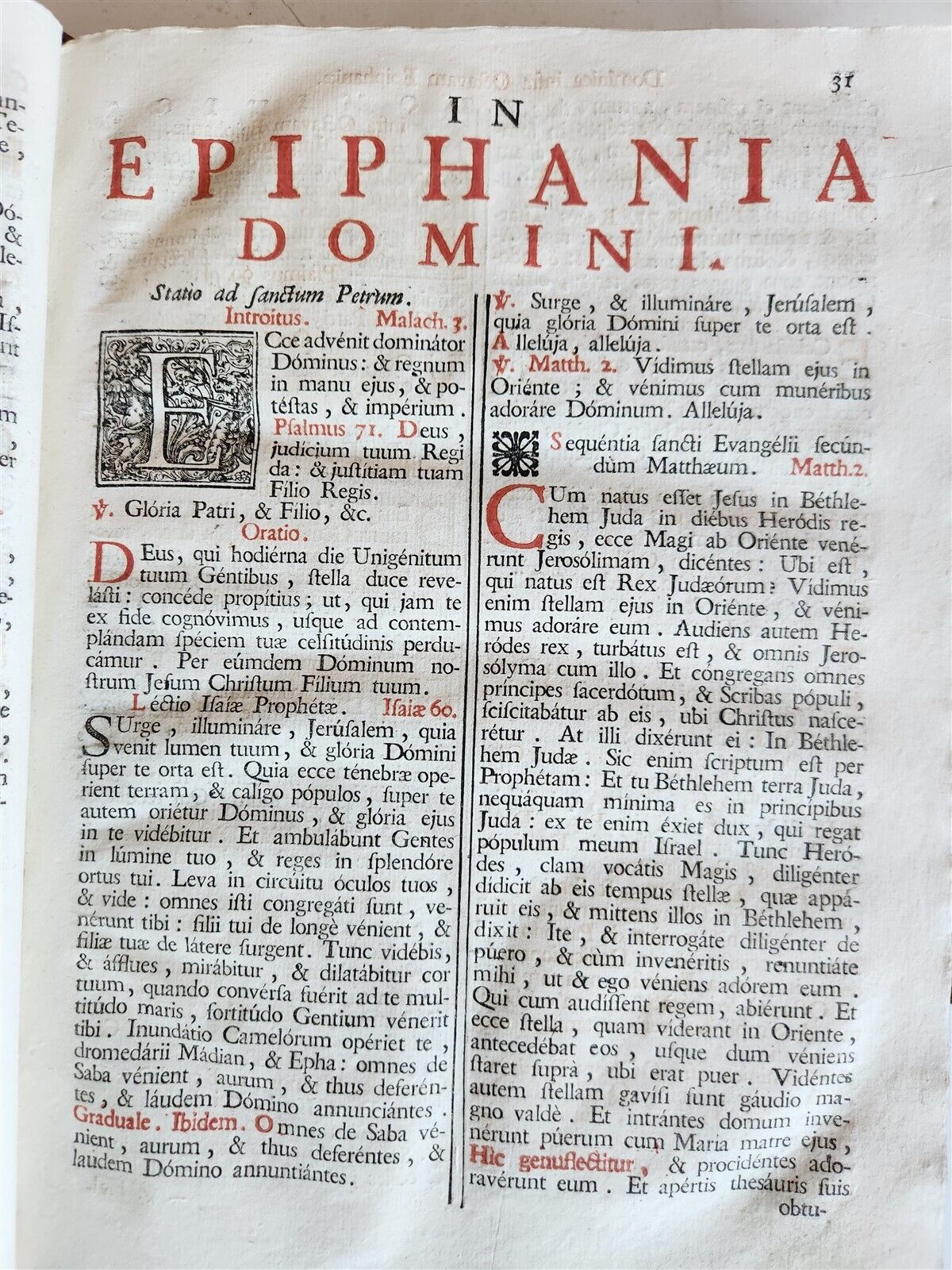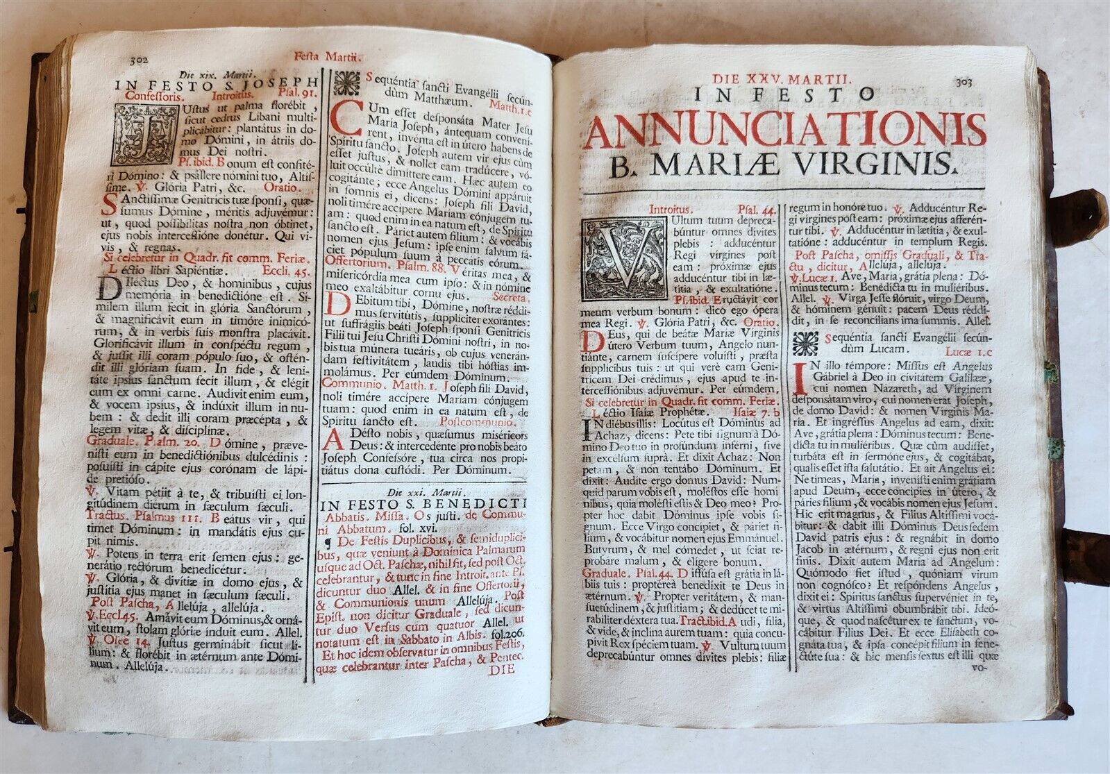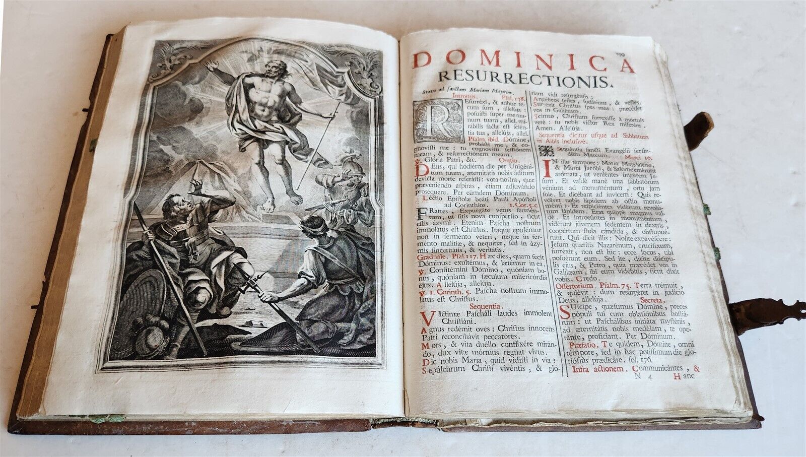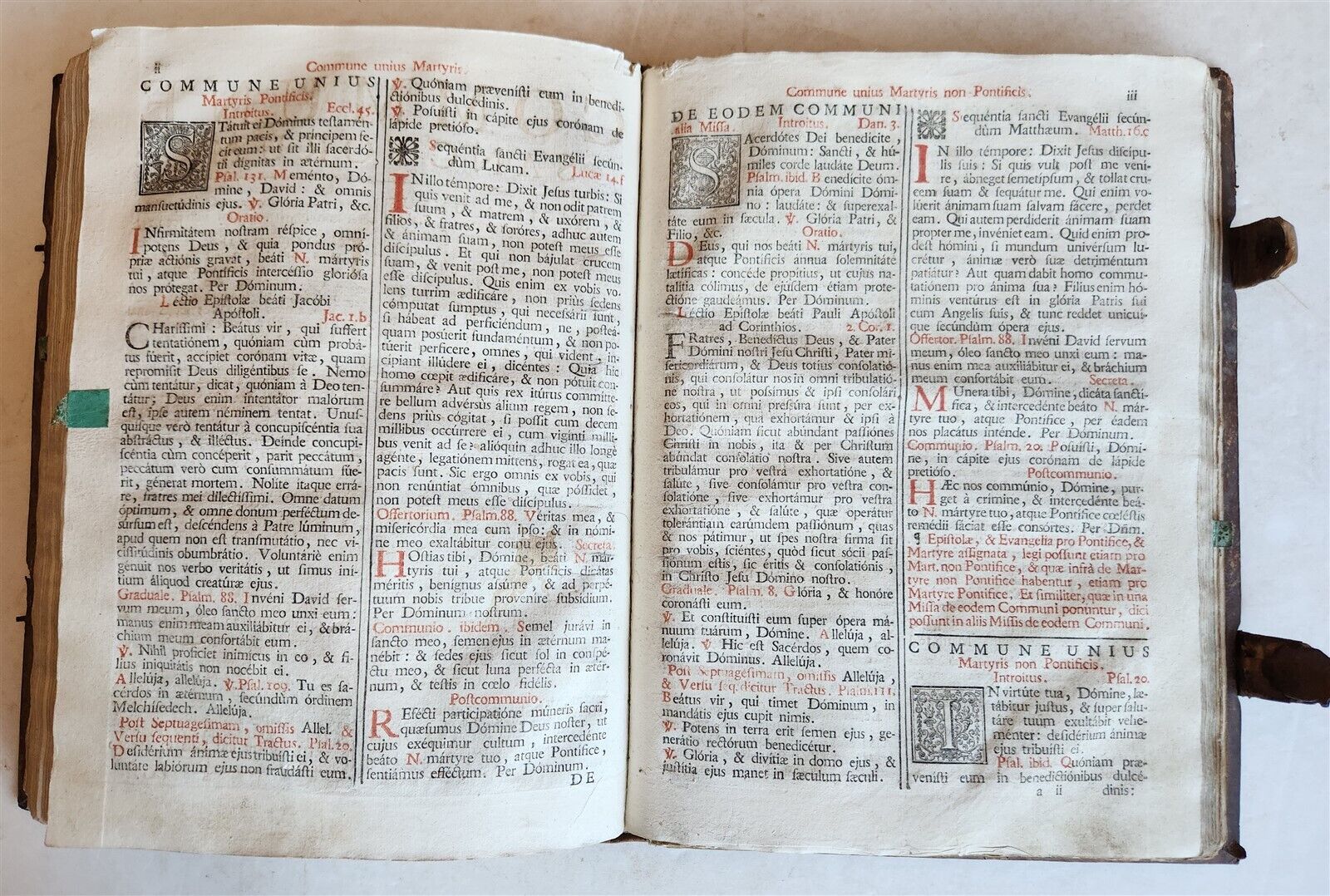 Missale Romanumex decreto sacrosancti concilii tridentini restitutum, S. Pii V. Pontificis Max. jussu editum, Clementis VIII & Urbani VIII Auctoritate recognitum. Venetiis, Apud Nicolaum Pezzana; 1757Folio. Size 9 3/4 by 13 1/4"With engraved frontispiece. Text mostly in two columns and two colours. 3 full-page engravings. Bound in at the back with ‘Missae Propriae Sanctorum Metropolitanae Ecclesiae ... Salisburgi; 1752Original blind tooled leather binding. Gilt edges.Defective clasps. Good condition, some wear.Text in Latin======================Please see my other auctions Thank You
