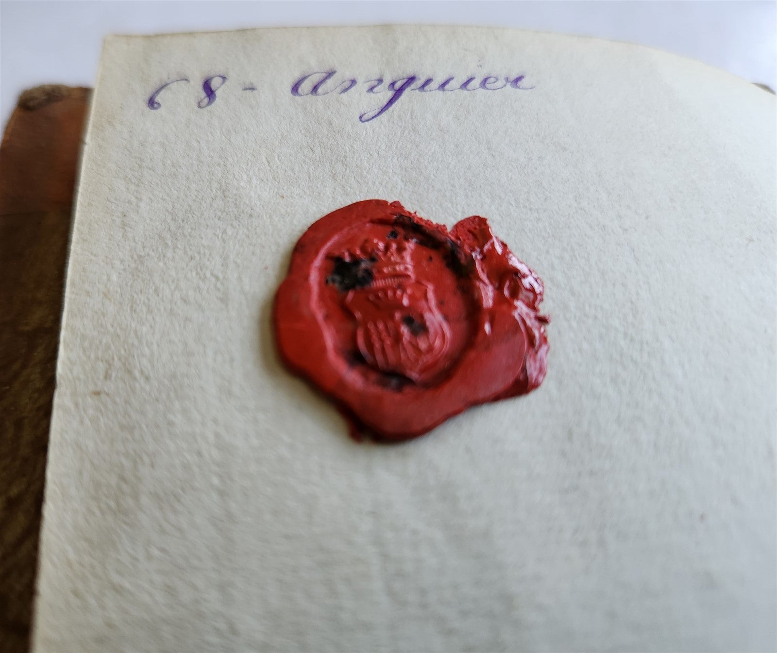 Original half-leather binding , marbled endpapers , front endpaper verso with crowned wax seal and handwritten inscription "68-anguier",