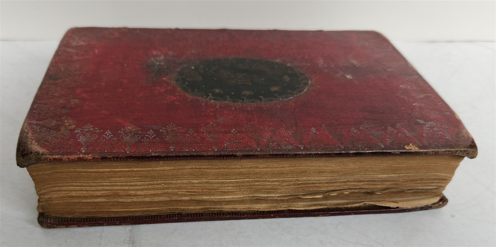 Original red morocco decorated in gilt, all edges gilt, contrasting green oval roundel to centre of each board with JHS initials emblem to centre