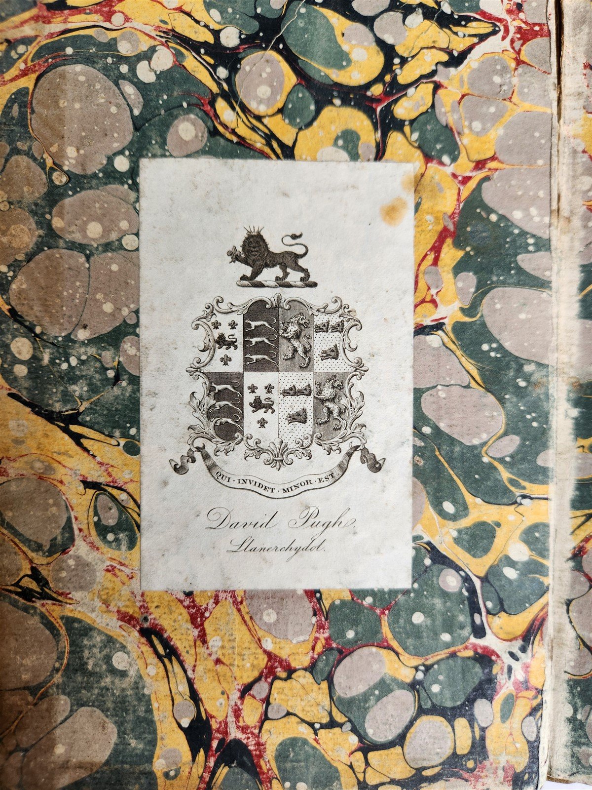 armorial bookplate of David Pugh of Llanerchydol to upper pastedown,
