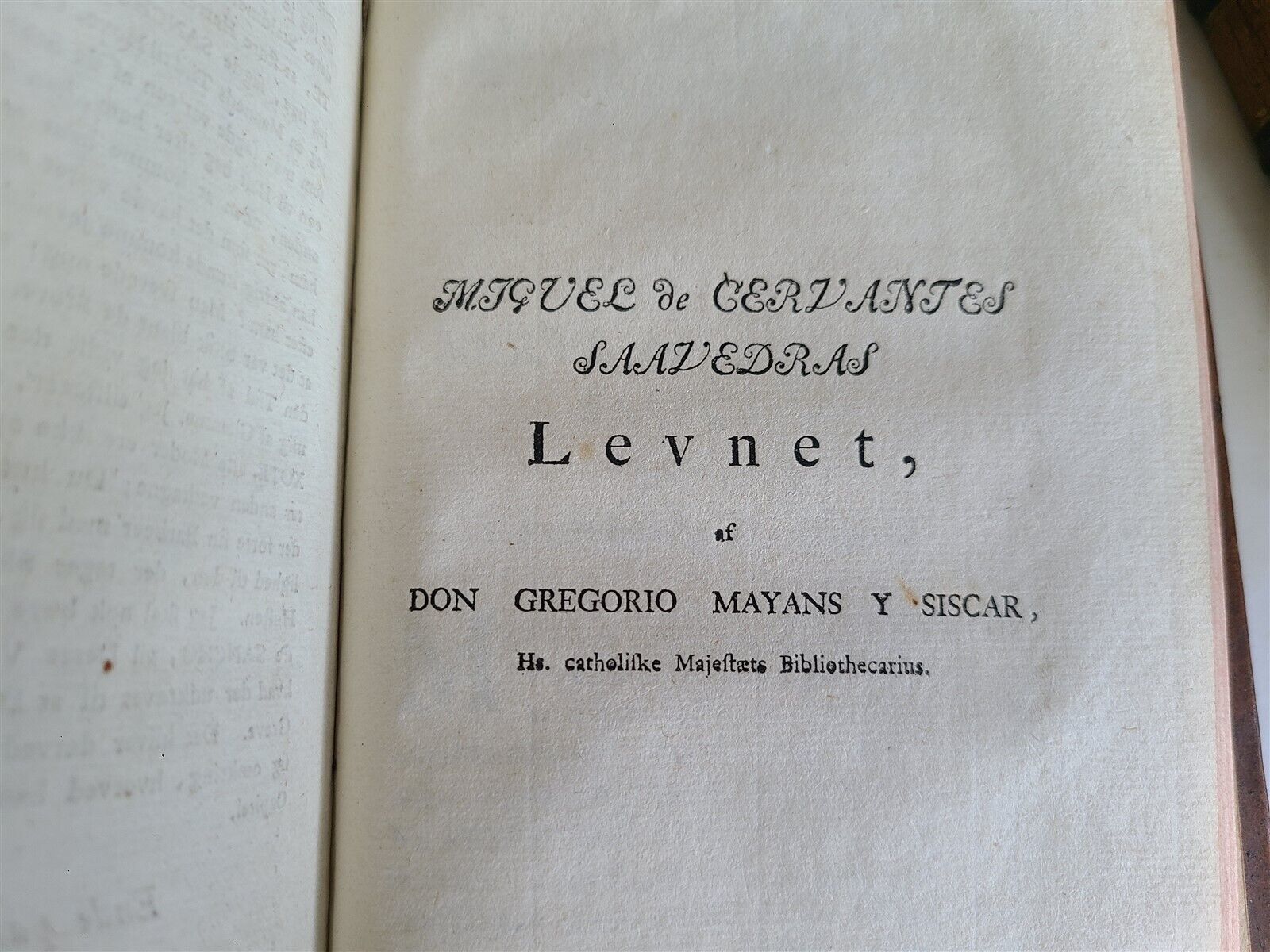 CERVANTES SAAVEDRA, MIGUEL de.DEN SINDRIGE HERREMANDS DON QUIXOTE af MANCHA LEVNET og BEDRIFTER forfatter afMIGUEL de CERVANTES SAAVEDRA.oversat... udgivne spanske oplag af CHARLOTTA DOROTHEA BIEHLKiobenhavn (Denmark); 1776-17774 volumes , complete setFirst edition in Danish LanguageIllustrated with engraved frontispiece-portait of Carvantes (by Meno Haas) and 28 engraved plates by Georg Haas and Preisler.Original leather ruled in gilt, spines with raised bands and title labels.Size 4 by 7.5"Minor wear of binding, very good interior Bookplate of Ken RapoportText in DanishRARE
