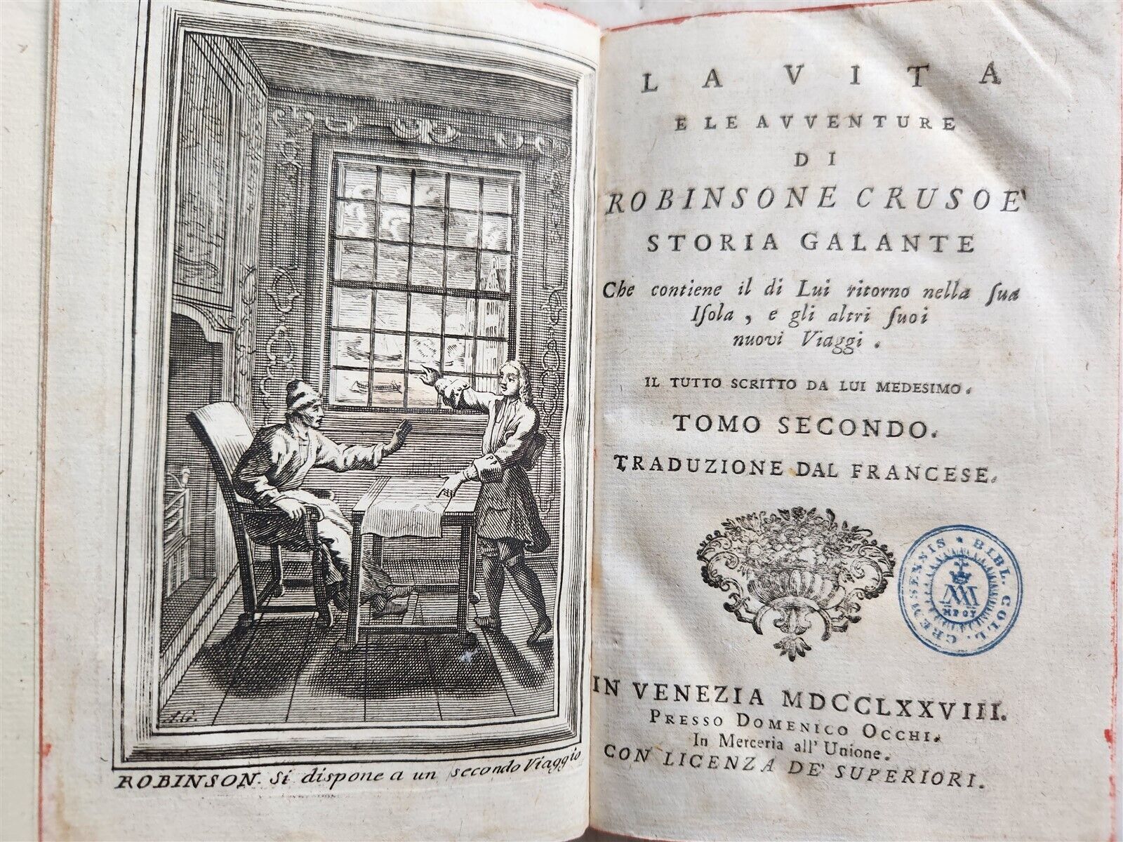 La vita e le avventure di Robinsone Crusoe. Storia galante. by DANIEL DEFORE 2 vols. Venice, D. Occhi; 1778 With 2 engraved frontispieces. VIII, 272 pp.; 310 pp. Size 4 3/4 by 6 3/4"Modern bindings using original spines - Rare.-Some occasional foxing.Small repair in the lower left corner of one of the frontispiecesText in Italian=======================================Please see my other auctions Thank You