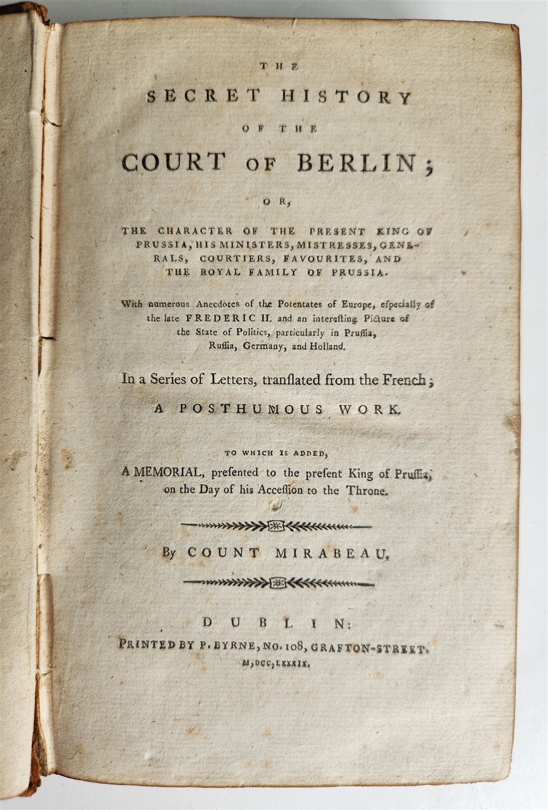 1789 THE SECRET HISTORY of the COURT of BERLIN by Count Mirabeau antique