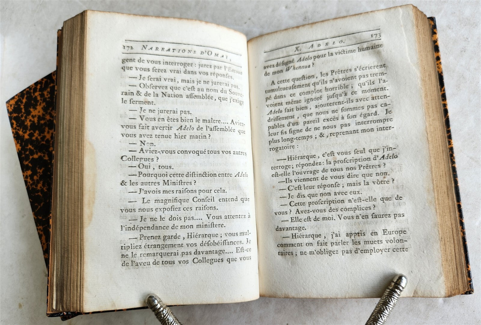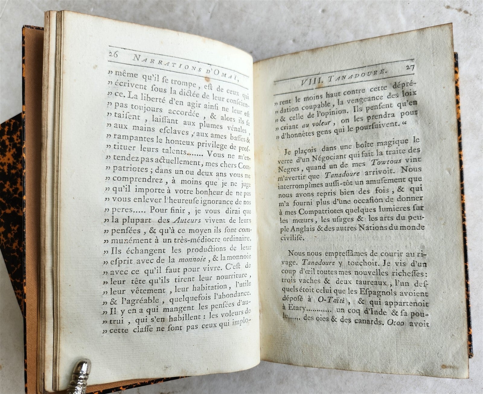 ABBE GUILLAUME-ANDRE-RENÉ BASTONNARRATIONS D'OMAI, INSULAIRE DE LA MER DU SUD, ami et compagnon de voyage du Capitaine Cook. Ouvrage traduit de l'O-Taitien, par M. K. & publie par le Capitaine L. A. B. Rouen/Paris, chez Le Boucher/ Buisson, libraire; 17904 volumes Size 5 1/4 by 7 3/4 inchesFrontispiece, (4), 446pp./ 492 (2) pp./ 480 (2) pp./ 462 (2) pp.Re-bound in half leather over marbled boards, title in gilt at the spinesGood condition , occasional foxingEx-libraryText in French