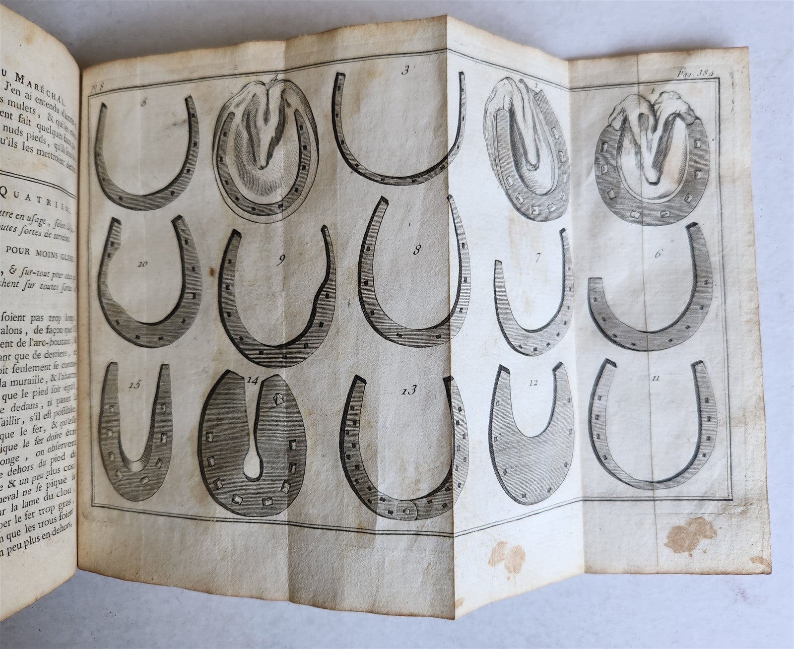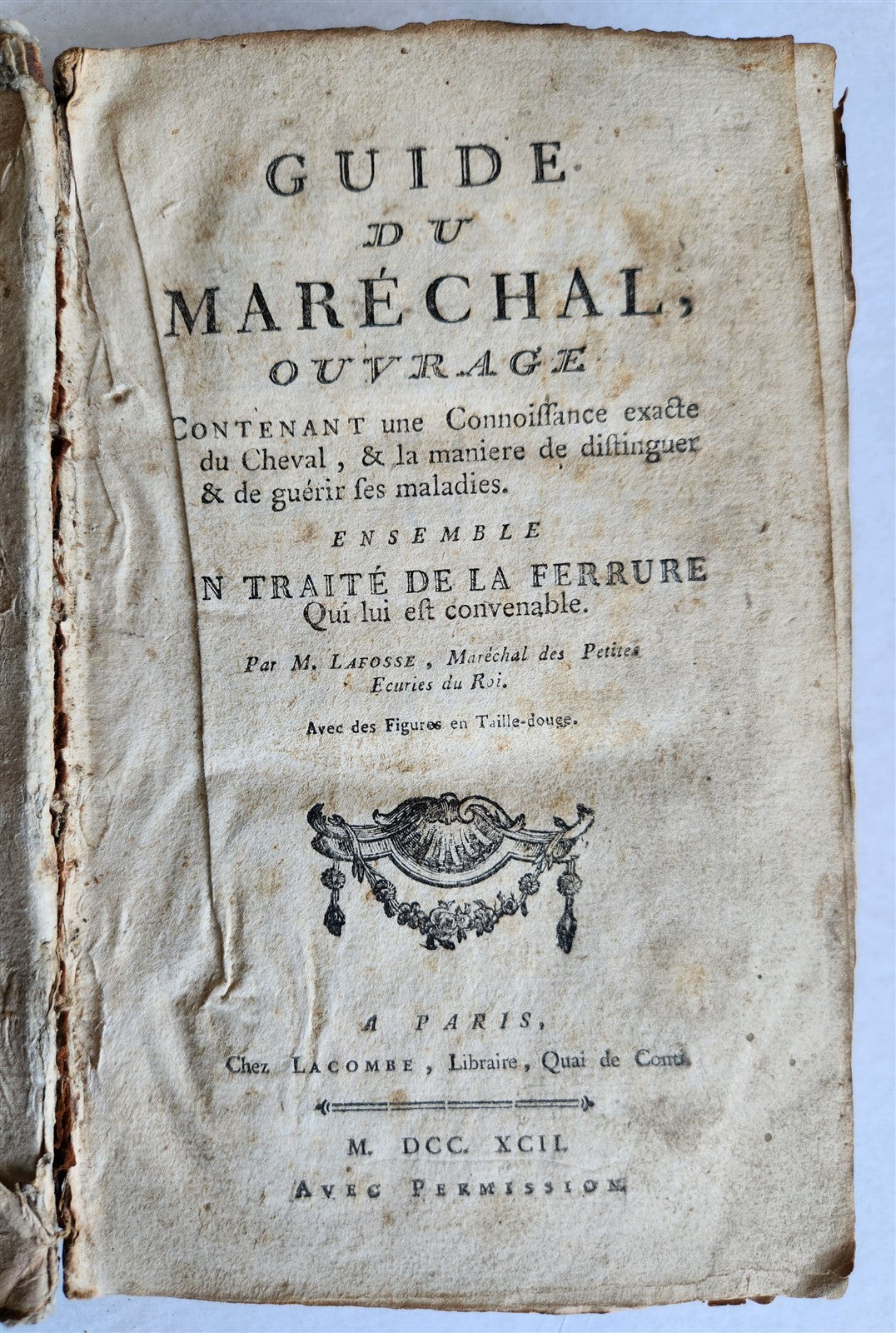 Guide du marechal, ouvrage contenant une connoissance exacte du Cheval, & la maniere dedistinguer & de guerir ses maladies. Ensemble un Traite de la ferrure qui lui est convenable. by M. LaFosseParis, Lacombe, 1792xii, 415 pp.Illustrated with 9 (of 10) enravingsSize 5 by 8 inchesOriginal leather, spine with raised bands and title label.Binding damaged, spine with missing ends, some occasional foxingText in French===============Philippe Etienne Lafosse (1739-1820) "learned horseshoeing in the blacksmith shop of his father, Etienne Guillaume, who was also a well-known horse anatomist. Philipp Etienne was not merely a crude apprenticed horseshoeer, however; he was also a learned man. He studied human and animal anatomy by visiting slaughterhouses and observing dissections in hospitals. Furthermore, he followed advanced studies at the Academy of Sciences, investigating anthrax, and was educated in the art of horse riding. He joined the army as a horse doctor in 1758.After the French defeat in the Seven Years' War, he joined the medical faculty of the Paris university. Then he started his own public courses in hippiatry for interested individuals in 1767, and this sparked a debate about the social attributes and purposes of veterinary education" (Jones/Koolmees, A Concise History of Veterinary Medicine, p. 106)======================================Please see my other auctions Thank You