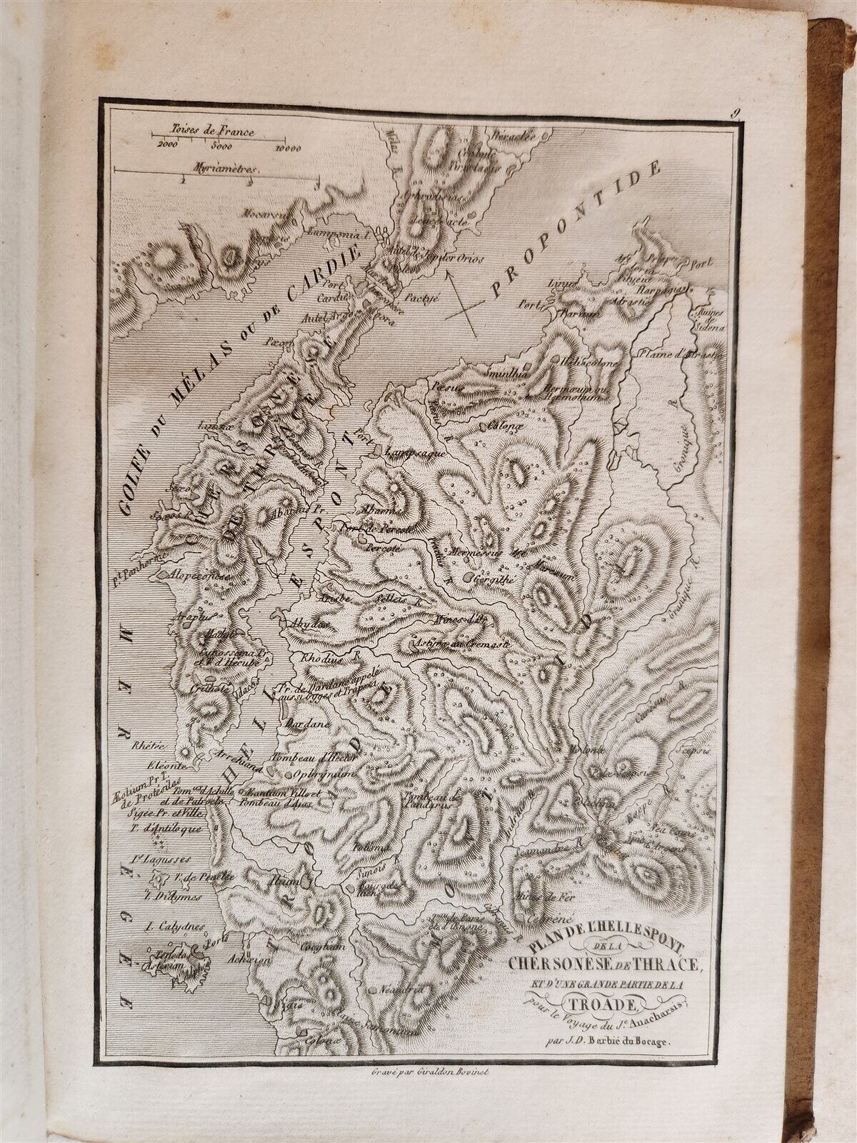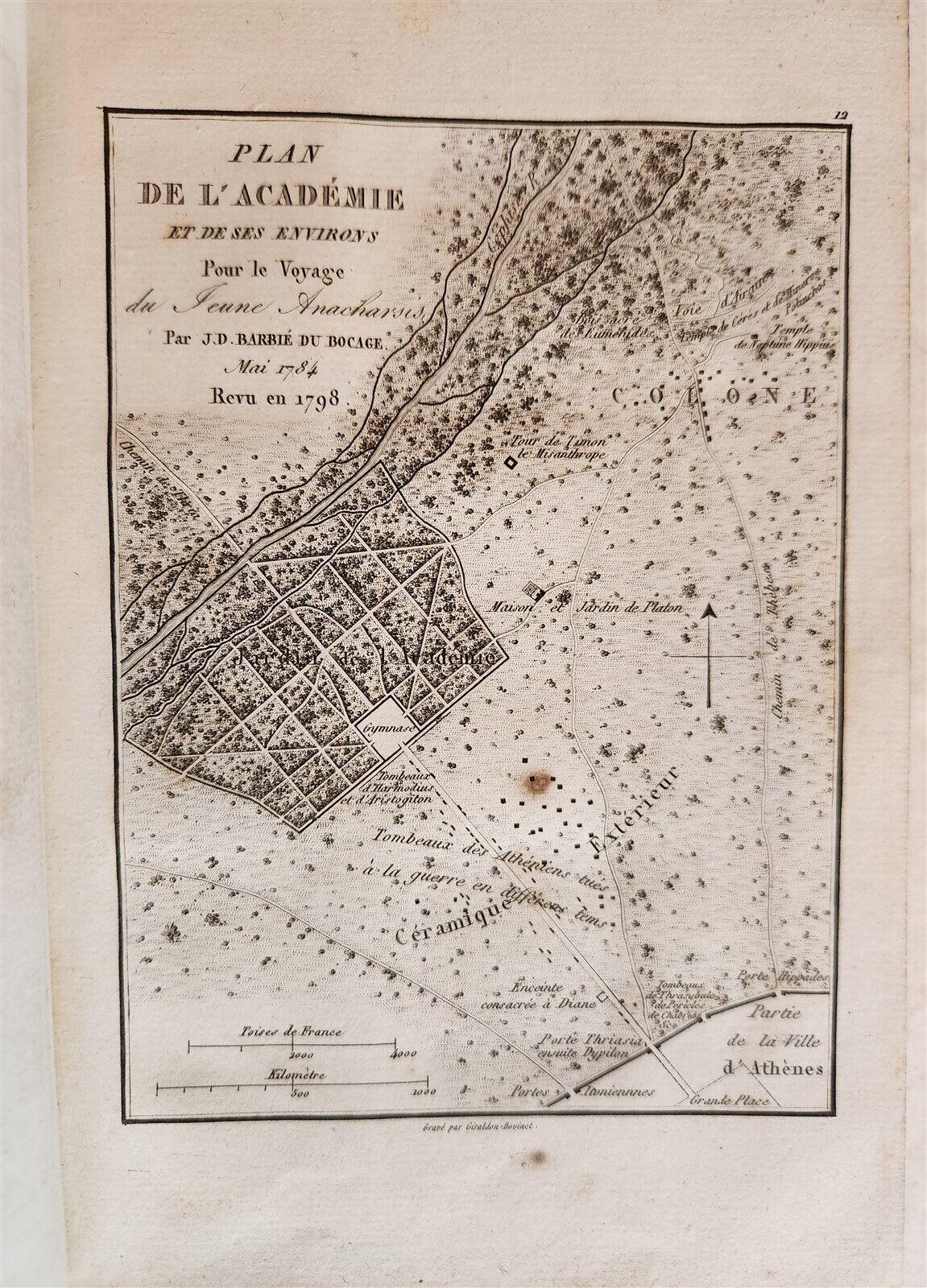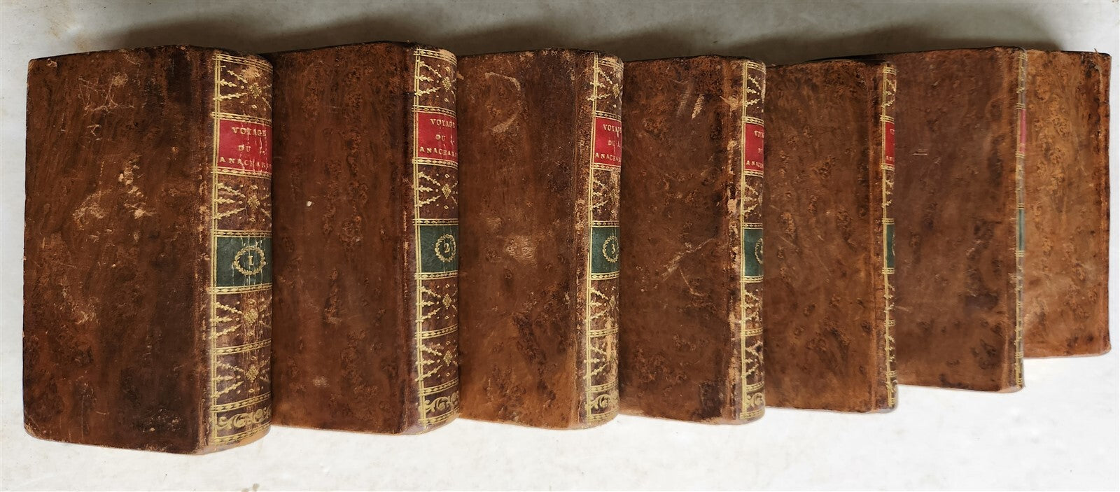 Voyage du jeune Anacharsis en Grece, vers le milieu du quattrième siecle avant l'ere vulgaire (...). Mixed edition. Atlas and 7 text vols., altogether 8 vols.Paris, Didot Jeune (1799) and 1821. With 36 (instead of probably 39) copper plates. Size 4 by 6.5" (atlas 5.5 by 8")Text volumes are leather bound, spines gilt decorated.Atlas is half leather over cardboardVery good conditionText in French==============================Please see my other auctions Thank You