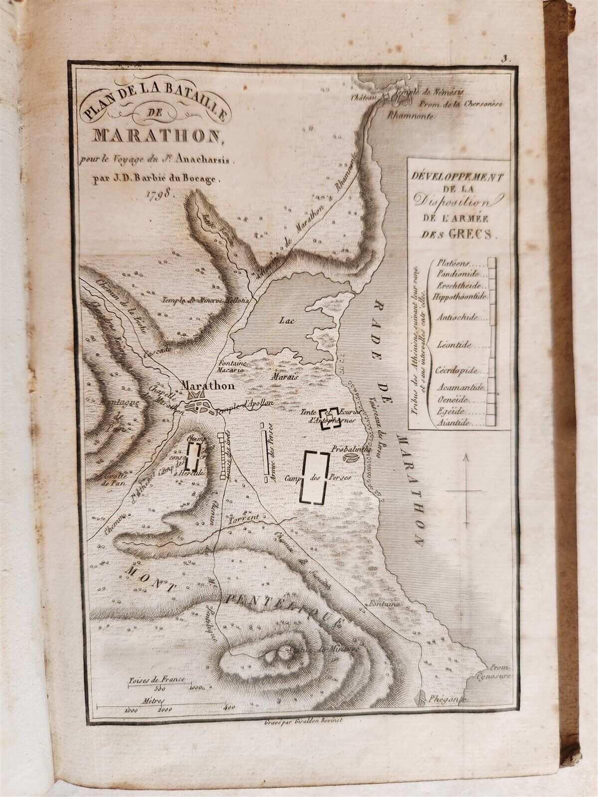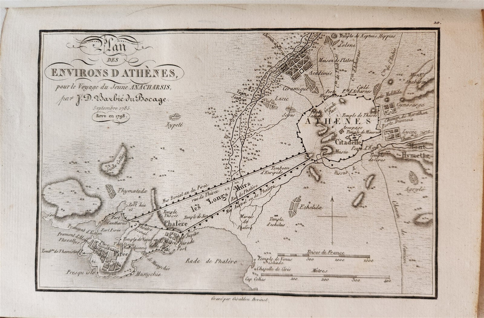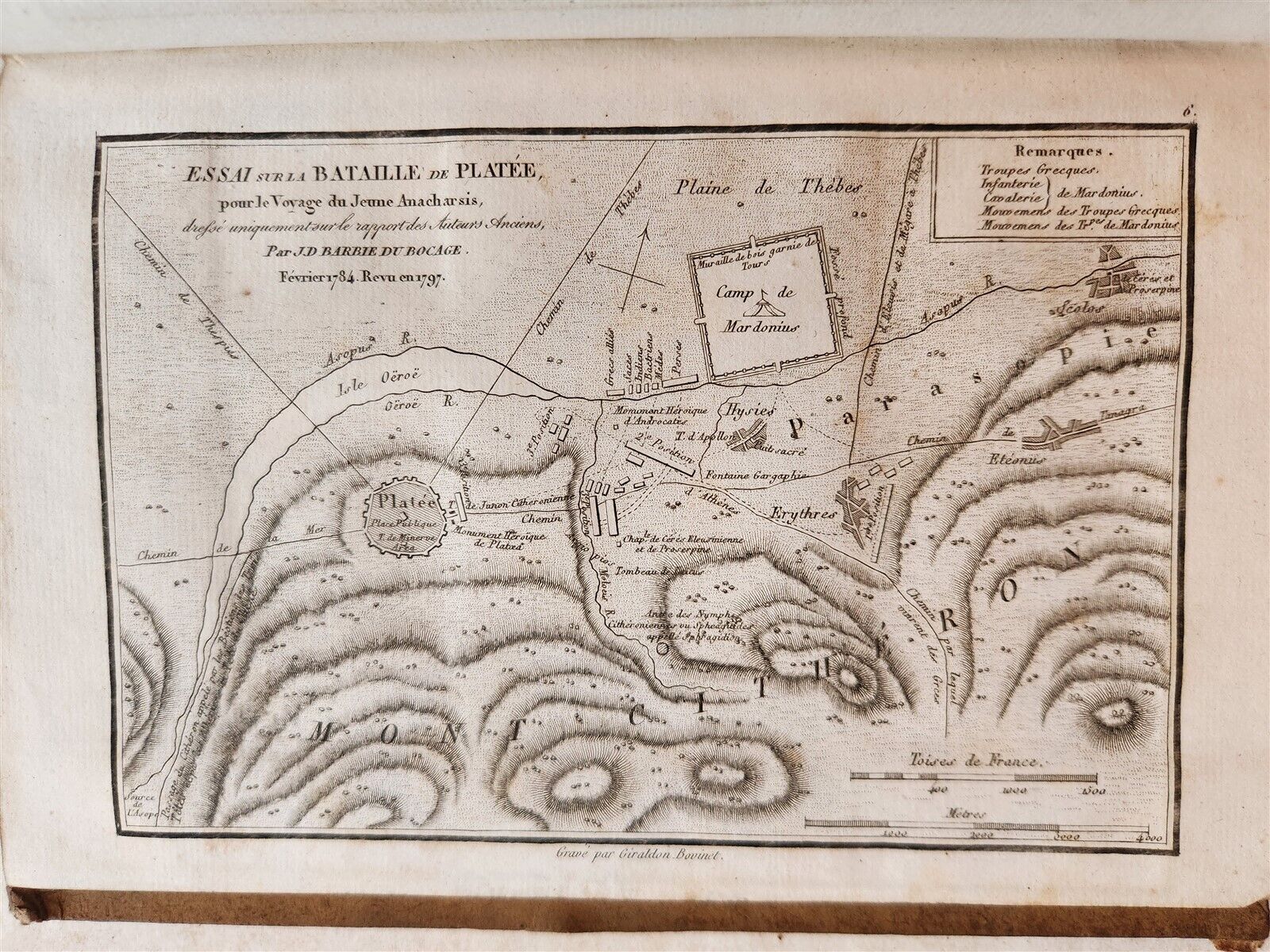 Voyage du jeune Anacharsis en Grece, vers le milieu du quattrième siecle avant l'ere vulgaire (...). Mixed edition. Atlas and 7 text vols., altogether 8 vols.Paris, Didot Jeune (1799) and 1821. With 36 (instead of probably 39) copper plates. Size 4 by 6.5" (atlas 5.5 by 8")Text volumes are leather bound, spines gilt decorated.Atlas is half leather over cardboardVery good conditionText in French==============================Please see my other auctions Thank You