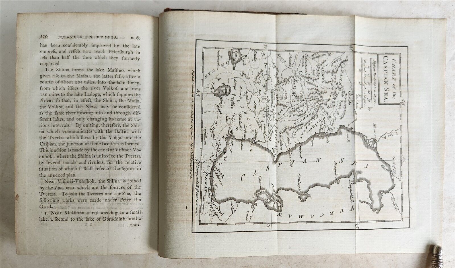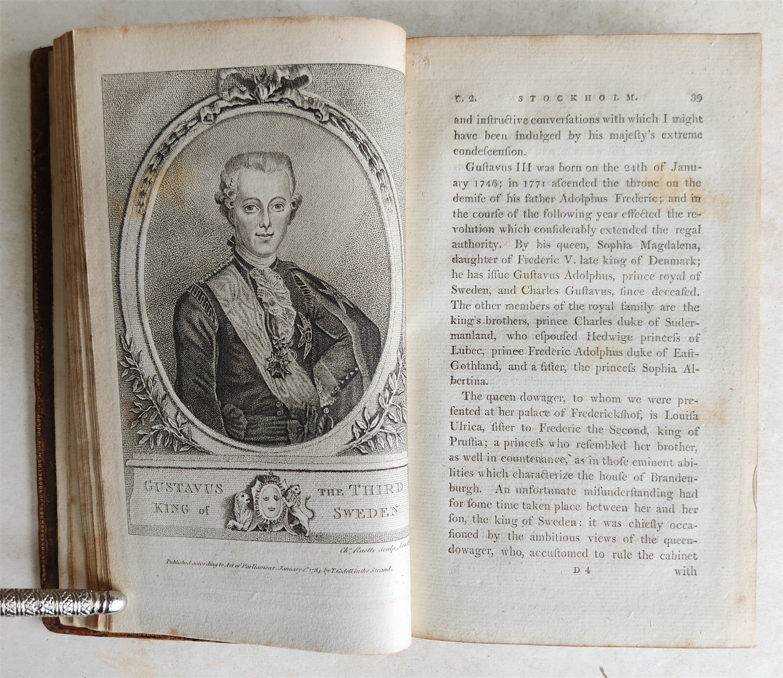 Travels in Poland, Russia, Sweden, and Denmark. 5 vols. by William CoxeLondon, T. Cadell Jr. and W. Davies, 1802 With 7 engraved views, 15 engraved maps or plans, 6 plates, 1 table, and 2 general plates. XV, 404 pp.; 5 nn., 374 pp.; 4 nn., 404 pp.; 4 nn., 367 pp.; 4 nn., 283, 28 nn. pp. (index). Rebacked , with richly gilt decoration on the boards. the "Specimen of Russian print" is missing in vol. 1. Minor foxing and toning, worn bindingsSize 5 1/4 by 8 1/3"good conditionText in English==============================Please see my other auctions Thank You