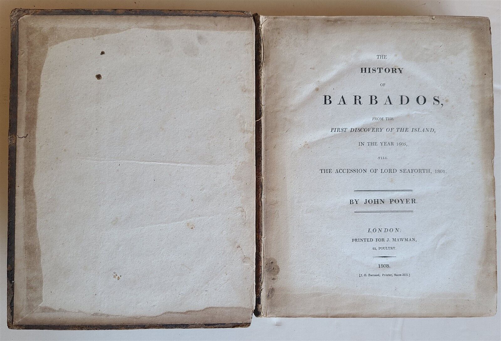 POYER, John (d. 1834).The History of Barbados, from the First Discovery of the Island, in the year 1605, till the Accession of Lord Seaforth, 1801 London: J. Mawman; 1808Size 8.5 by 10.5" [ii], [i]-[xxxvi], [1]-668 pp. FIRST EDITION OF THIS COMPREHENSIVE HISTORY OF BARBADOS.With Errata page and List of Subscribers bound at frontSabin 64853.preliminary leaves (including title) with faint old damp-staining to marginsoriginal calf gilt, boards detached, lacking title label, worn, lacks front endpaperSize 8.5 by 10.5"Text in English==========================================="The work of a well-informed native of the island, written from the point of view of a West Indian, the welfare of whose colony home seemed indissolubly bound up with the institution of slavery. Very useful for the detailed account of the course of events during the latter part of the eighteenth century" (Ragatz).================================Please see my other auctions Thank You