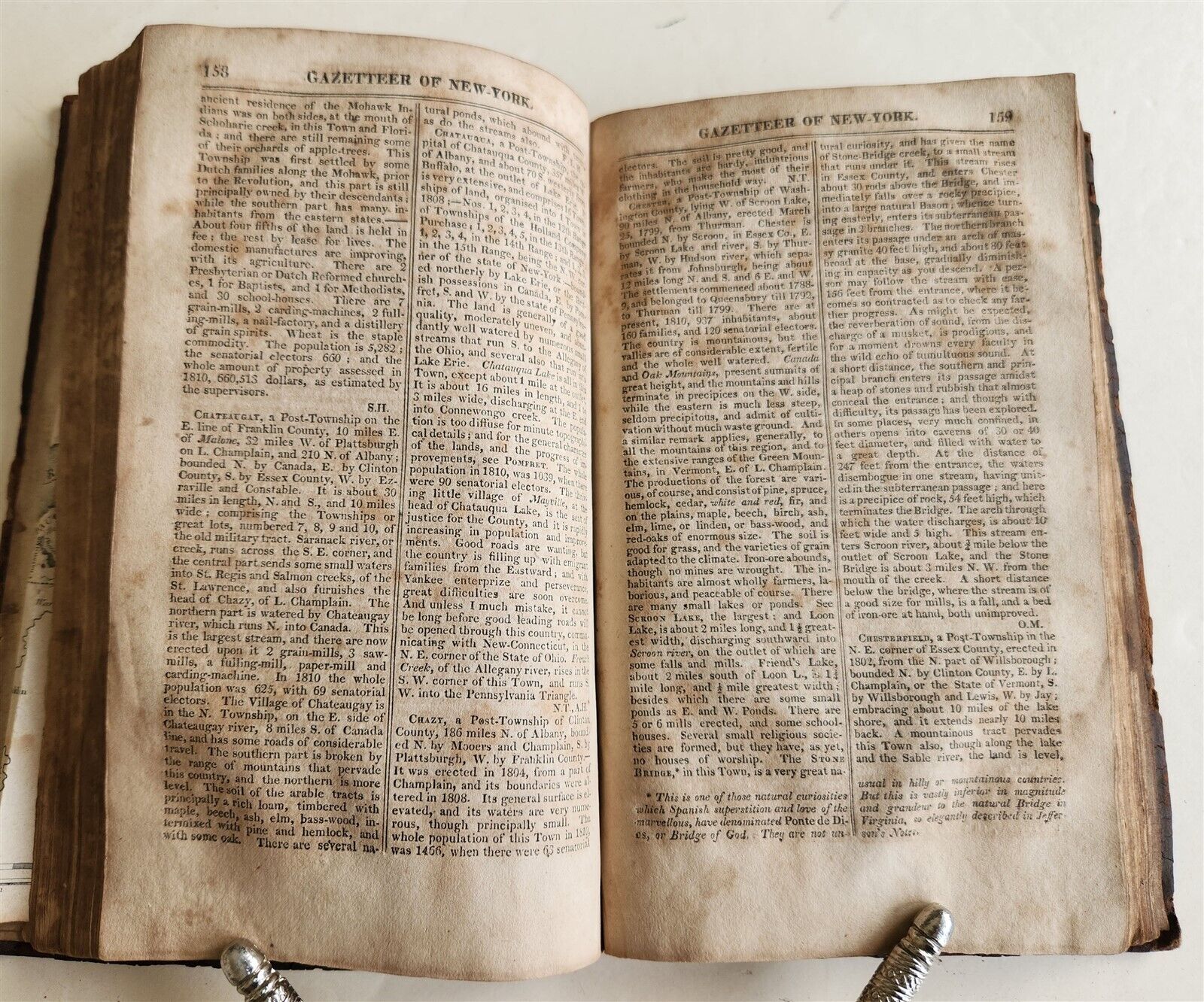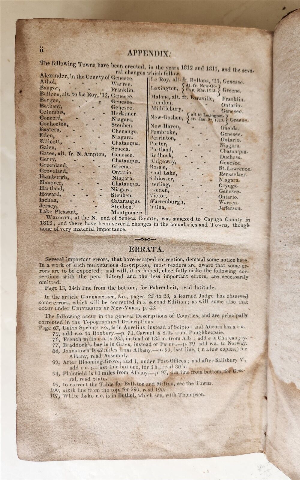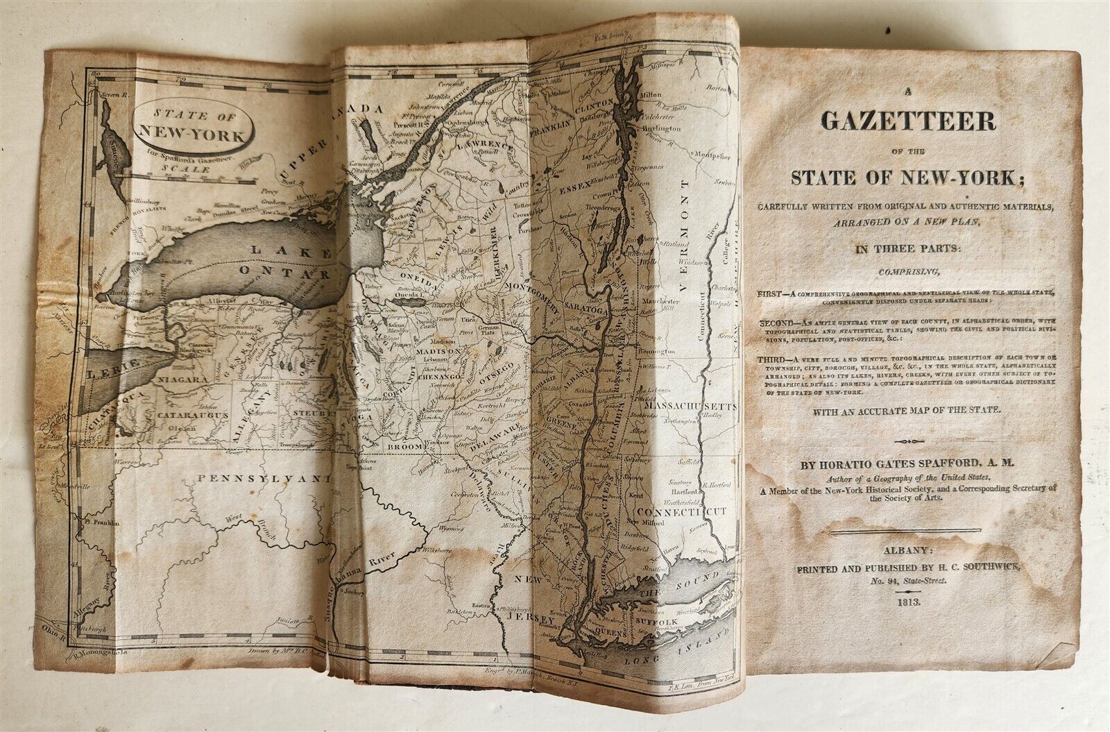 A GAZETTEER OF THE STATE OF NEW-YORK; CAREFULLY WRITTEN FROM ORIGINAL AND AUTHENTIC MATERIALS, ARRANGED ON A NEW PLAN, IN THREE PARTS ... WITH AN ACCURATE MAP OF THE STATEby Spafford, Horatio GatesAlbany: H. C. Southwick; 1813FIRST EDITIONOriginal calf, worn, with some damage to the spine, front cover partially detachedToning, occasional spotsSize 5 by 8 3/4"334 pp plus AppendixText in English===================================================Please see my other auctions Thank You