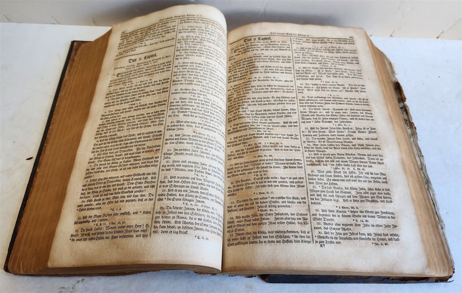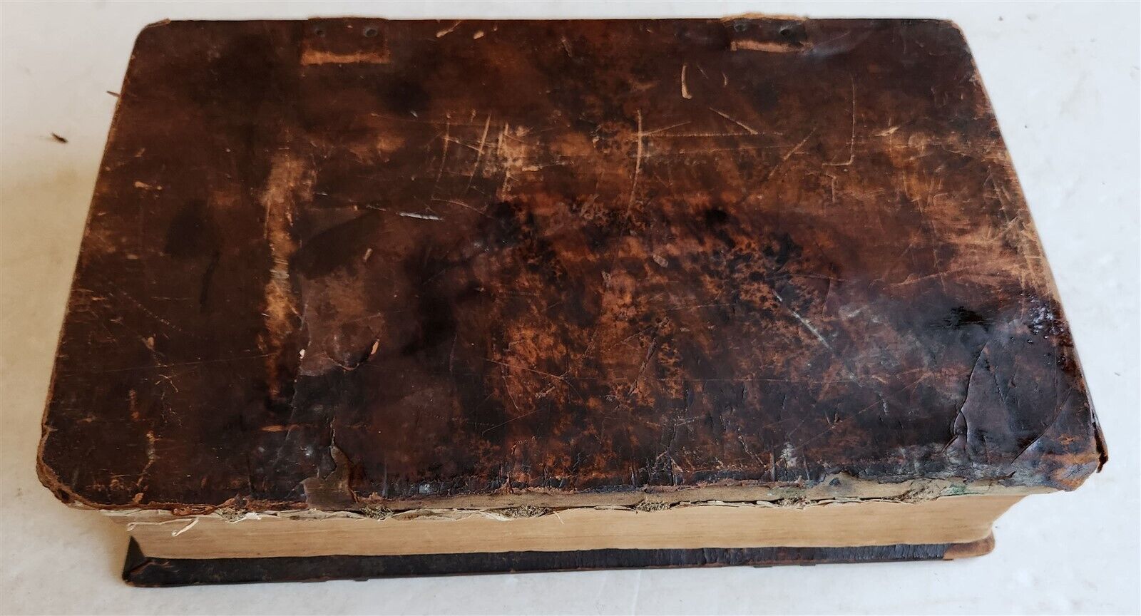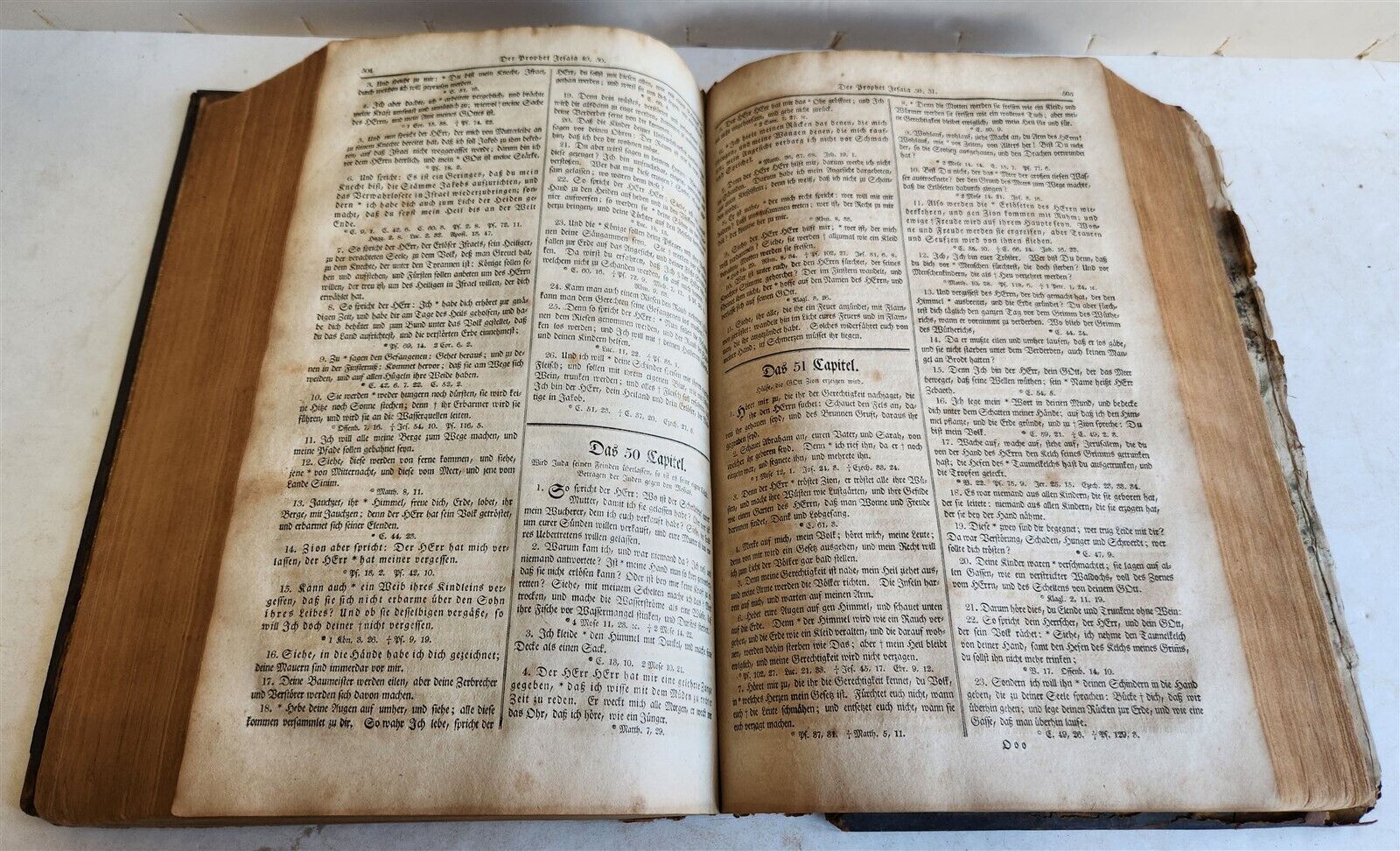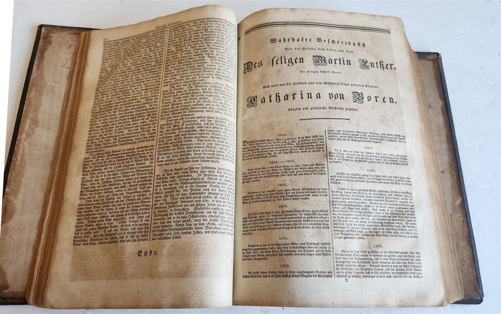 [ HOLY BIBLE ]Biblia, das ist: die ganze Heilige Schrift, Alten und Neuen TestamentsNach der Deutschen Uebersetzung von doctor Martin Luther. Mit lehrreichen Vorreden, und vielen nutzlichen und seltenen Registern versehen. Nebst dem dritten Buch der Maccabaer, und Zugabe des dritten and vierten Buchs Esra. Imgleichen: Eine kurz gefasste Biblische Geschichte und Lebenbeschreibung Doctor Martin Luthers.FIRST FOLIO PRINTED GERMAN BIBLE IN AMERICALANCASTER, PA: JOHANN BAR ; 1819Size 15.5" x 10.5" x 4.5" The previous German-American Bibles were all smaller, quarto Bibles that had been printed by the Saur family in Germantown, near Philadelphia, (1743, 1763, and 1776), by Gottlob Jungmann in Reading (1805) and by Friedrich Goeb in Somerset (1813). In 1819, the young 23-year-old Johann Bar (John Baer, or John Bear) of Lancaster County's printed this substantial work which was the largest German-language Bible printed in America to that date. Despite the numerous subscribers listed on five preliminary pages in four-column format, he was nearly bankrupted by the enterprise. Original glossed leather over wooden boards with aggressively thick raised bands to spine, reverse beveled edges, lacks straps/clasps.Illustrated with 2 engraved frontispiece plates by John Henry. Both boards are detached, first frontis also detached, with repaired tears.Title page is frayed , first about 20 pages with faded dampstain at the lower margin, last about 70 pages and back cover are also dampstainedsome foxingText in German==============================Please see my other auctions Thank You