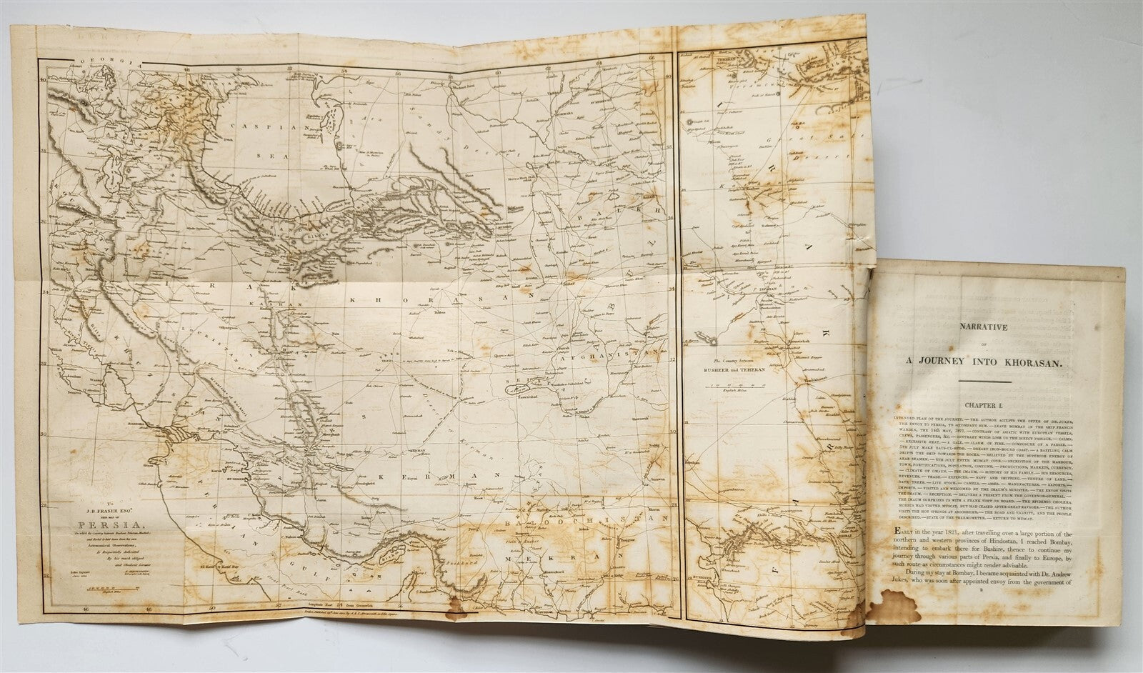 NARRATIVE of a JORNEY INTO KHORSAN,in the years 1821 and 1822Including some account of the countries to the north-east of Persia; with remarks upon the national character, government, and resources of that kingdomby Fraser, James Baillie (1783-1856)London; 1825 Size 4 1/4 by 10 3/4 inchesquarter leather over cloth boards, expertly rebackedxxvi, [1], 623, 148 pages; large folding map (25.5 x 17.5 inches (648 x 445 mm)) ex-library Sion College, London, with their stamp and their crest gilt-stamped on front board. Map foxed, with small closed tear at upper right; otherwise very good condition with ample margins and clean and bright text.Text in English========================================An early detailed account. "James Baillie Fraser left his native Scotland for India in 1813. After a short and unsuccessful stint working in a trading business in Calcutta, in 1821 Fraser accompanied Dr. Andrew Jukes of the East India Company on a diplomatic mission to Persia. Jukes died in Isfahan in late 1821, but Fraser continued the journey, visiting Tehran, Mashhad, Tabriz, and other cities before returning to London.This book is Fraser's account of his voyage through Khorasan, a historical region that includes parts of present-day Iran, Turkmenistan, and Afghanistan. It contains detailed information about the peoples of the region and their customs, religious practices, and forms of government. Appended to the main work is a lengthy 'Geographical Sketch of the Principal Districts of Khorasan,' with descriptions of the countryside and of towns such as Herat, Afghanistan. At the end are listed the route and travel distances from Mashad to Herat, Herat to Kabul, Kabul to Balkh, and between various other points. Also included are several tables with geographic and meteorological data." (Library of Congress)=============================Please see my other auctions Thank You