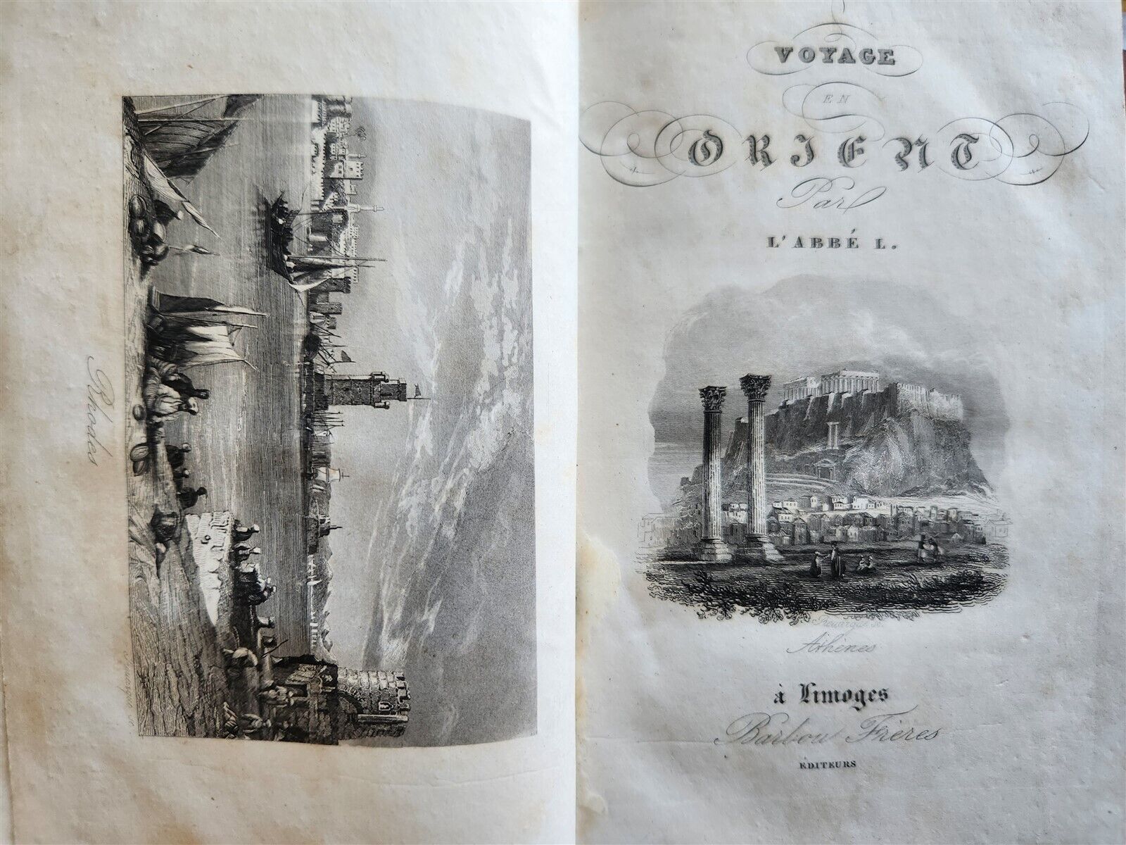 Voyage en Orient.Limoges, Barbou Freres; 1842by M. L'Abbe, H. With engraved title page, 2 steel engravings. 311 pp.Original embossed leather binding, gilt spine, marbled edges and endpapersSize 4 1/4 by 7 inches very good condition, minor wearWith bookplate of College de ThiersText in French=============================================Please see my other auctions Thank You