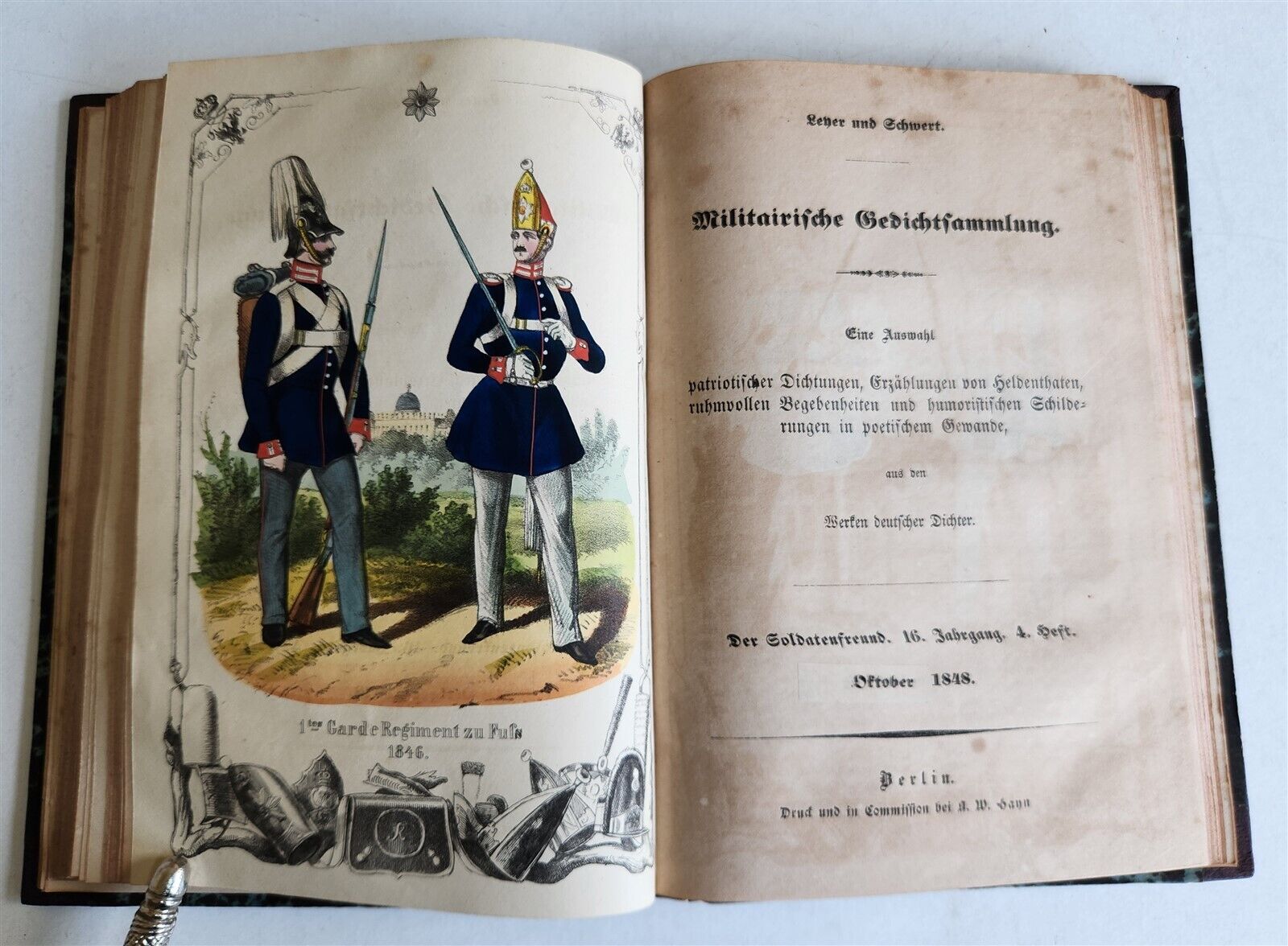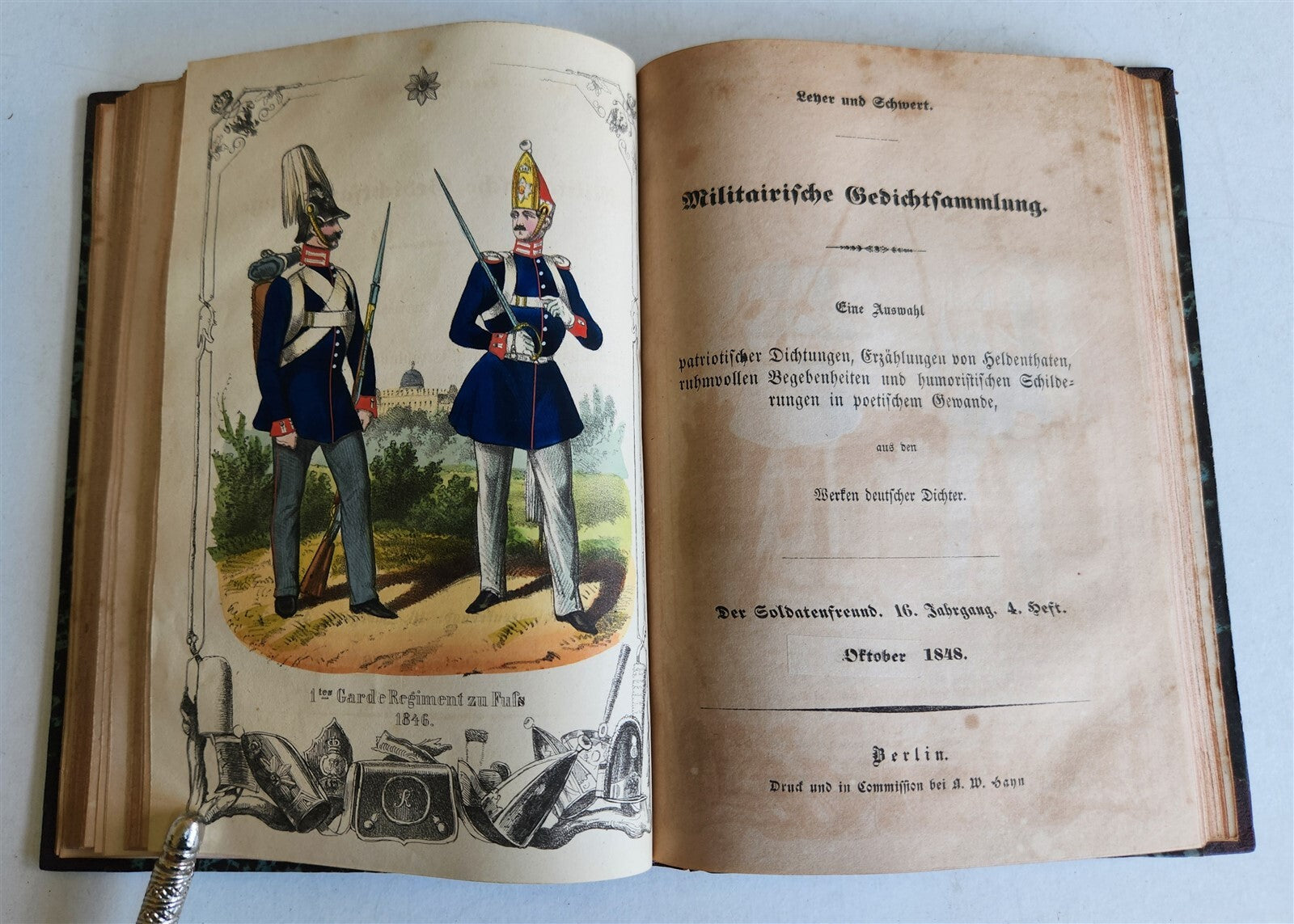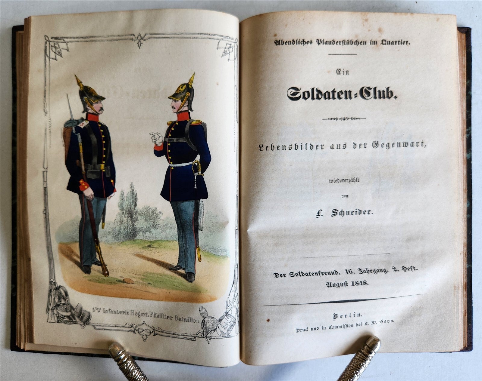 Schneider, L.Der Soldaten-Freund. Zeitschrift fur faßliche Belehrung und Unterhaltung des Deutschen Soldaten. (The Soldier's Friend. Journal for Comprehensible Instruction and Entertainment for German Soldiers.) Vol. 16, Issues 1-6 in 1 volume Berlin, Hayn, July-December; 1848 With 6 color lithographed frontis pages showing uniforms. Contains: The War in Schleswig, A Soldier's Club, The Life Infantry Regiment, Military Poem Collection, The Soldier's Fiel and Garrison Kitchen, The Constitutional Rights and Duties of the Prussian Soldier.Half leather over marbled boardsSize 5 3/4 by 8 1/3 inchesGood condition, foxingText in German=============================================Please see my other auctions Thank You