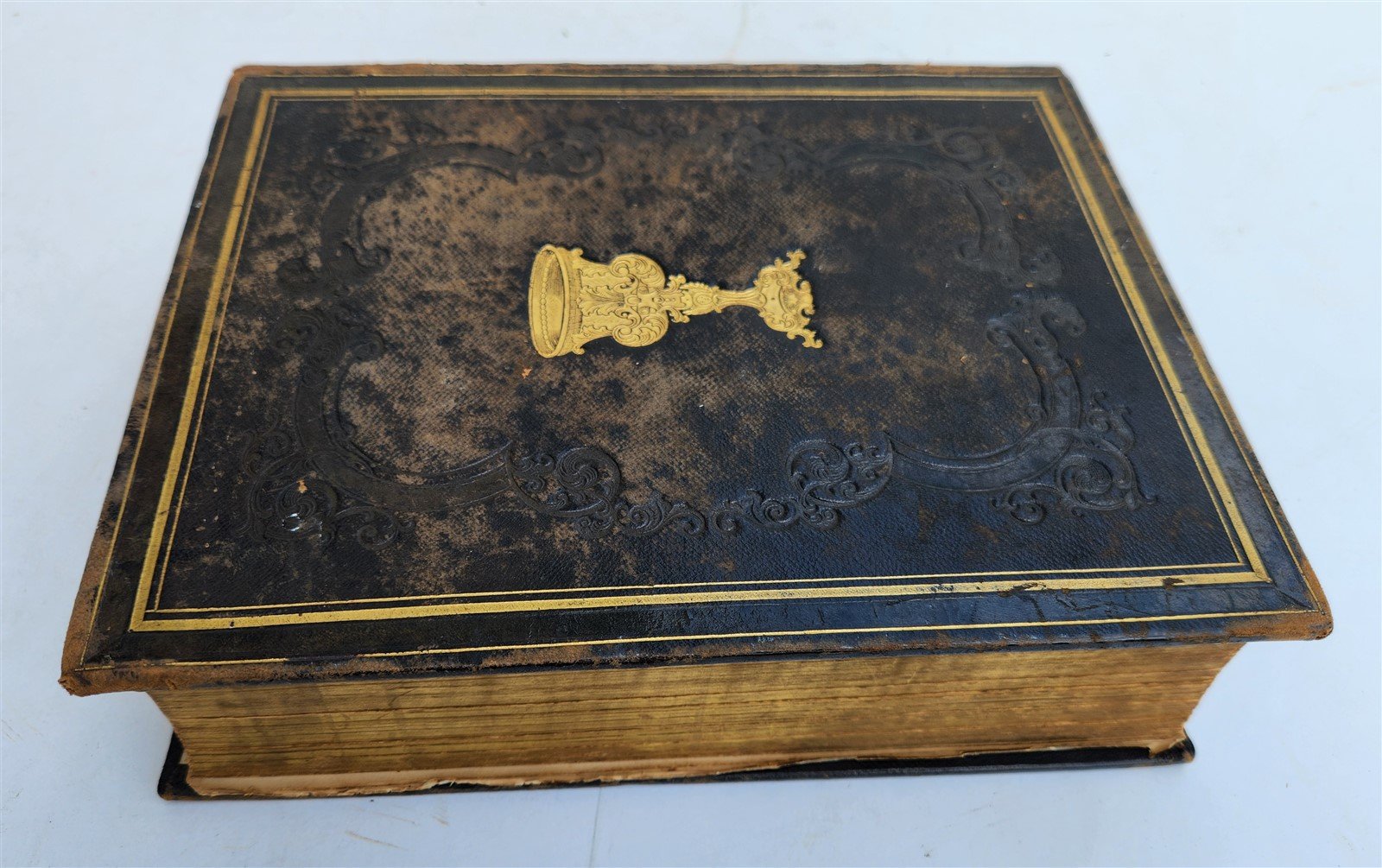 Good interior condition, front hinge cracked. Binding worn, with discoloration visible on the photos