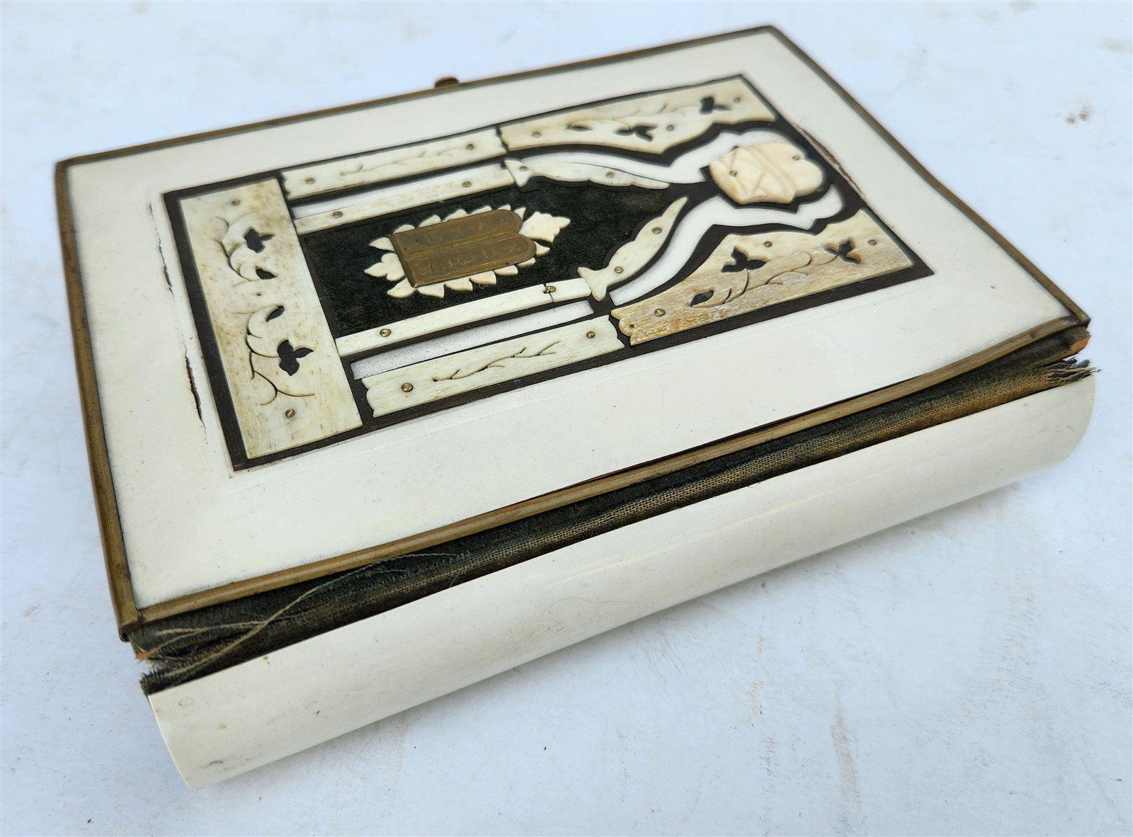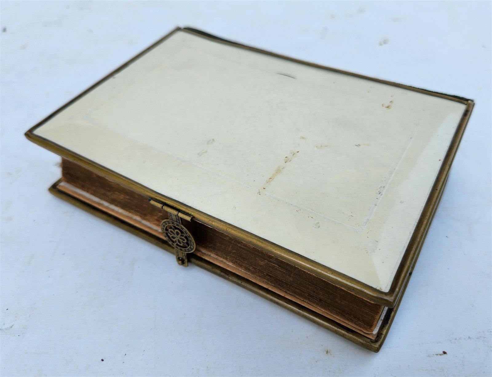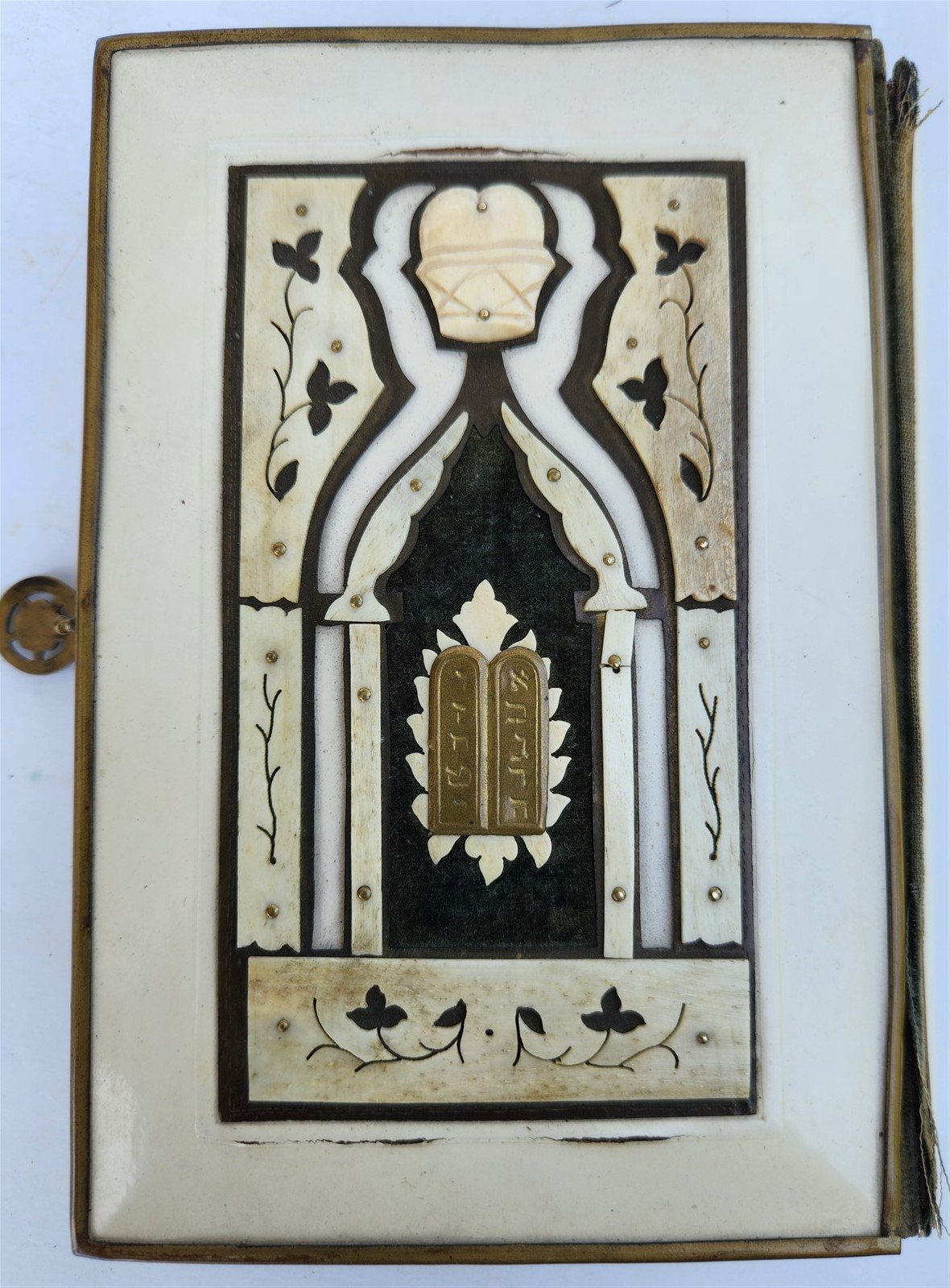 Decorative celluloid binding with metal 10 commandments centerpiece, brass edges and intact clasp