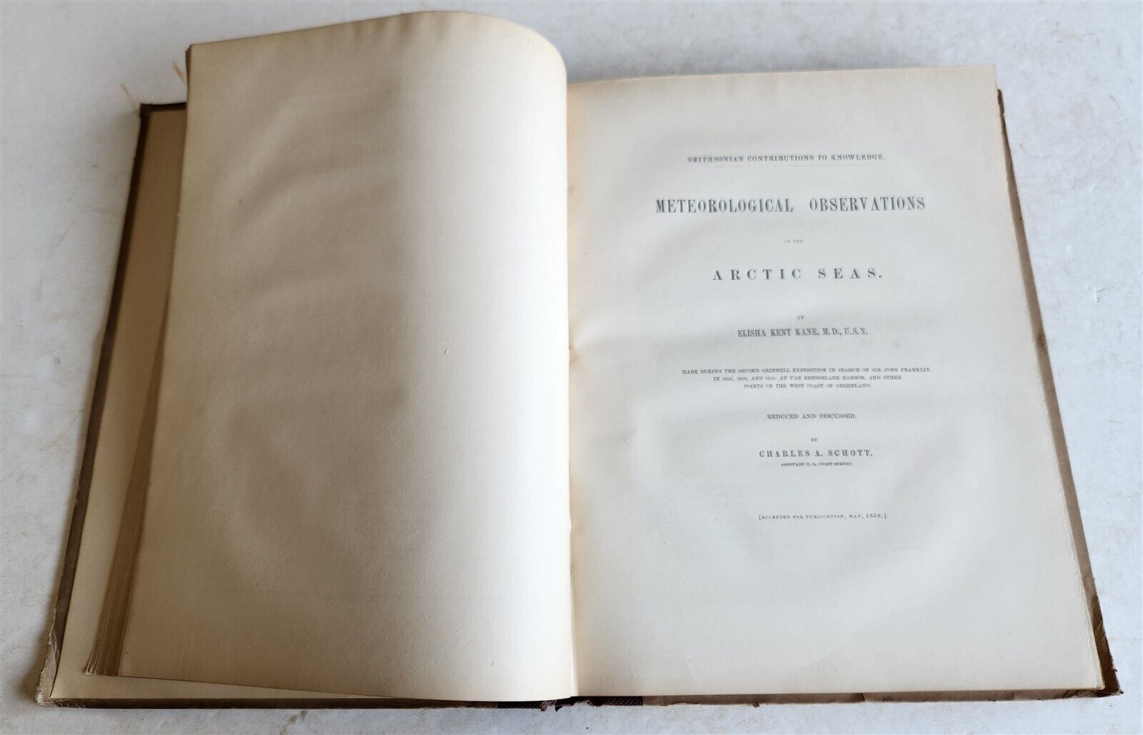 Elisha Kent Kane and Charles A. SchottMAGNETICAL OBSERVATIONS IN THE ARCTIC SEAS, from the SmithsonianContributions to Knowledge seriesWashington: Smithsonian, 1860Distillation of Kane's instrumental readings conducted in Greenlandand the Arctic Sea, 1853-'55; cloth spine, very good interior condition, some wear of binding with bumped corners and spot to the front coverPages untrimmed Folio. Size: 10  by 13 1/4"Text in English=============================="Magnetic Observations in the Arctic Seas" refers to a scientific publication by the Smithsonian Institution, detailing magnetic field measurements taken during an Arctic expedition, most notably from the Second Grinnell Expedition led by Elisha Kent Kane, which searched for Sir John Franklin in the 1850s; the data was analyzed and published by Charles A. Schott. ================================Please see my other auctions Thank You