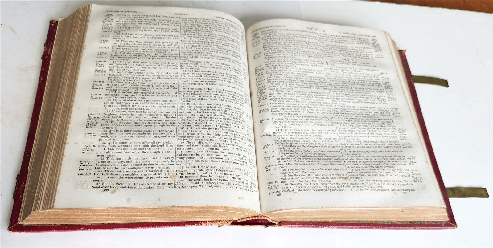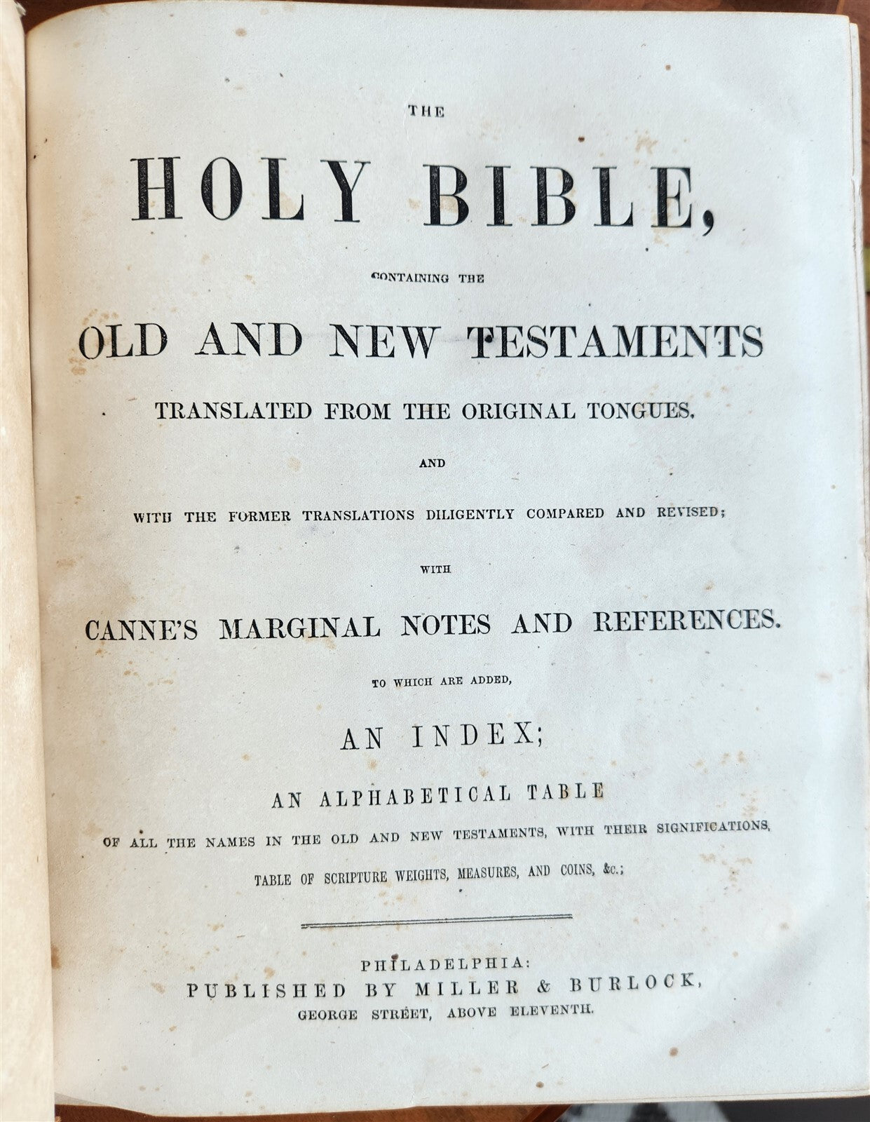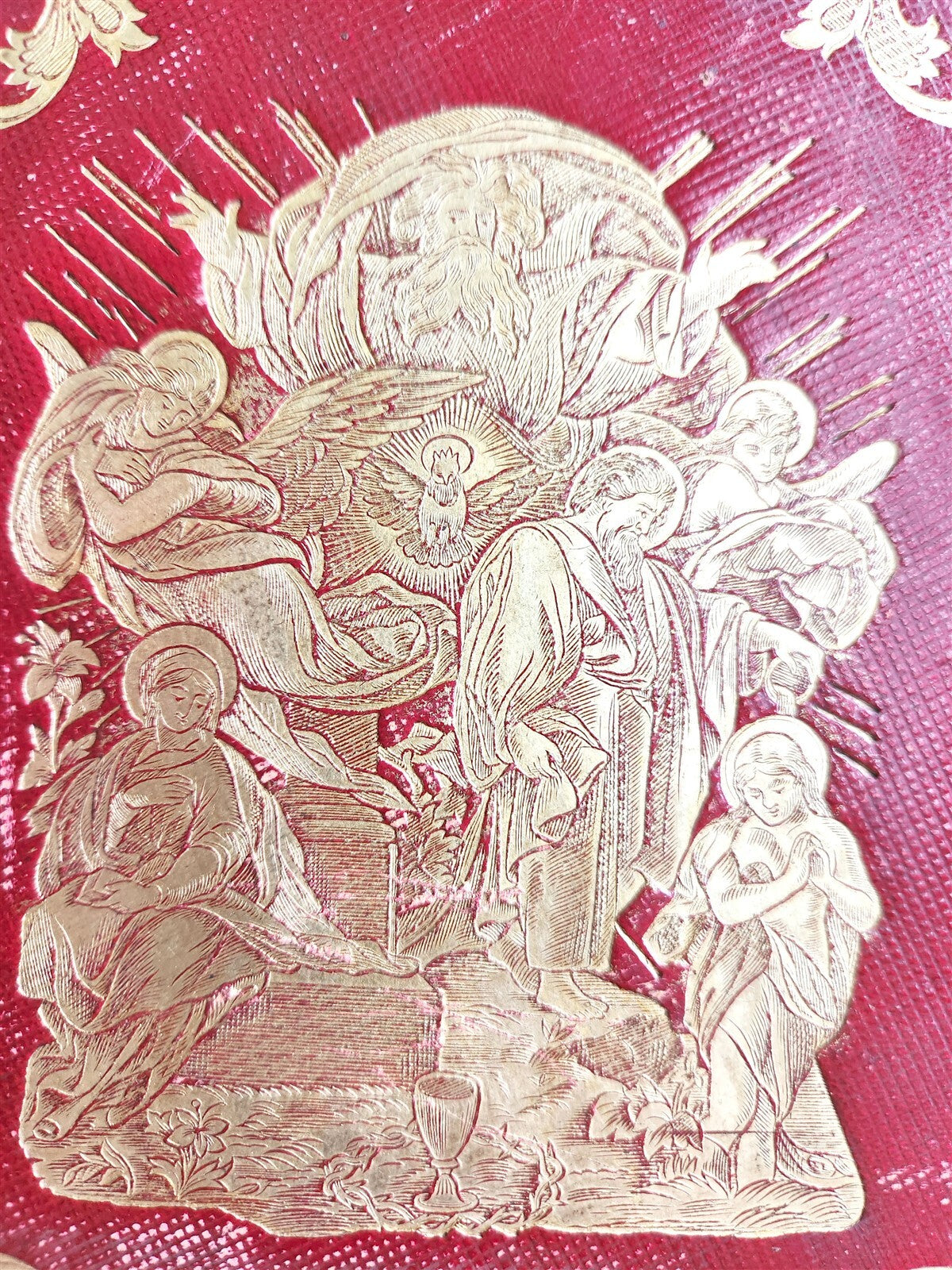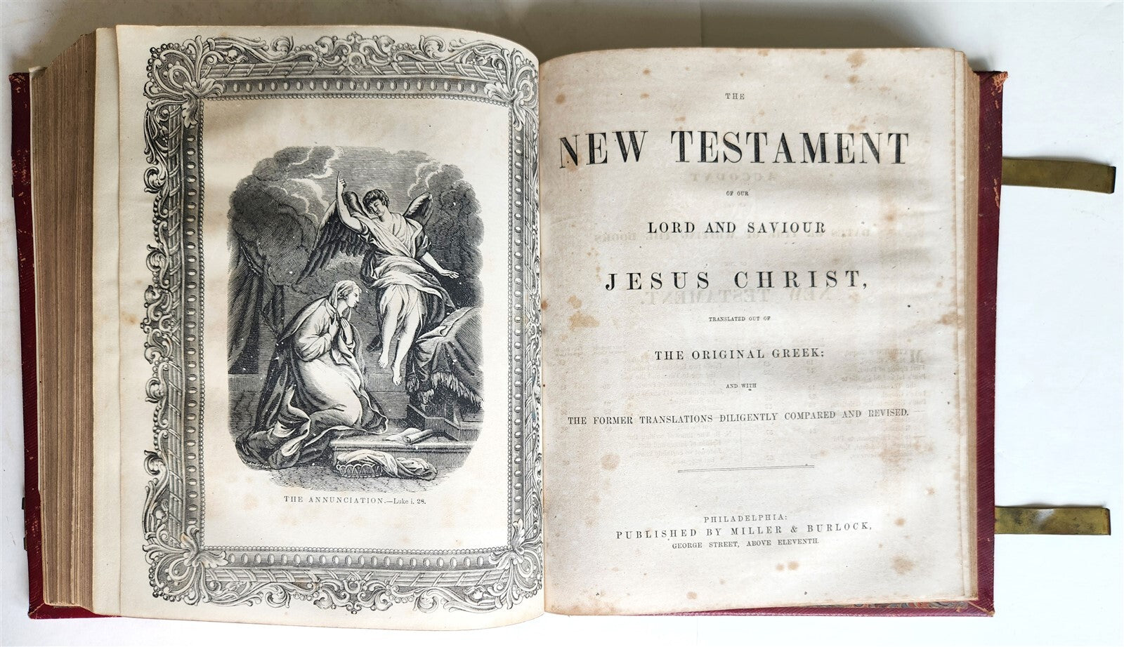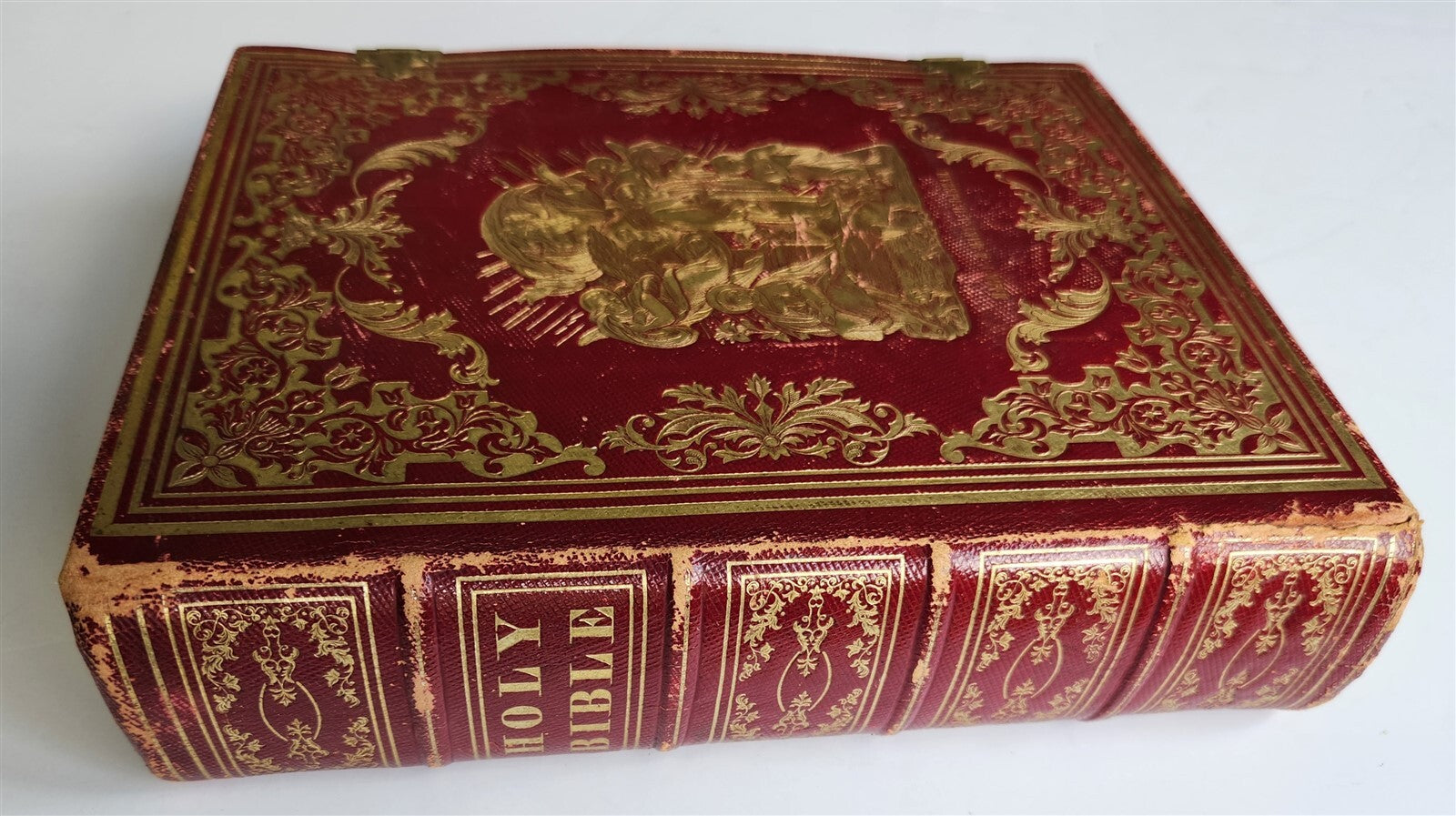 HOLY BIBLEOLD and NEW TESTAMENT Philadelphia; n.d. (c. 1860s)Folio.  Size 9 by 11 1/4 inchesOriginal red morocco decorated in gilt, spine with raised bandsOriginal owner's names in gilt at the front cover: "Mark F. and Mary A.H. DarrahVery good interior condition, some foxingBinding with some wear, scratches to the back coverText in English=================Please see my other auctions Thank You