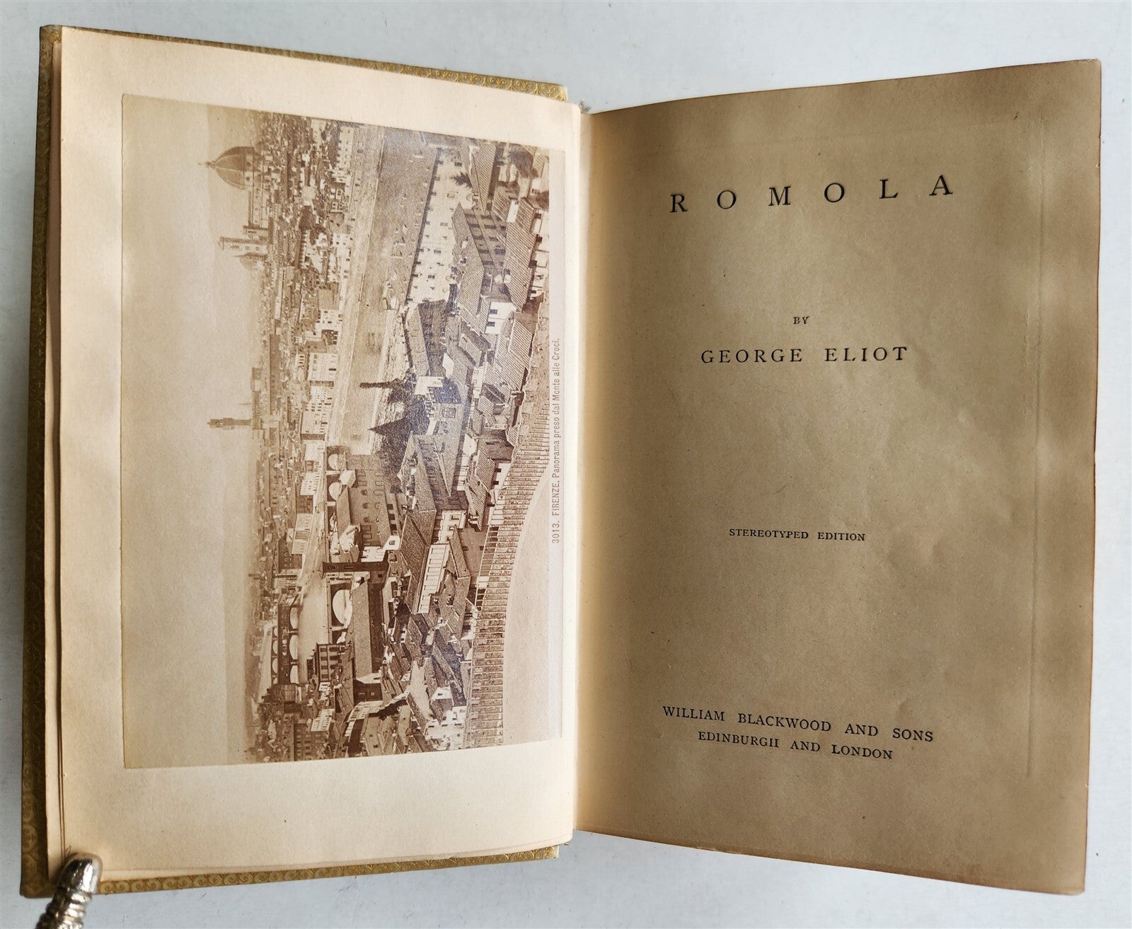 ROMOLAby GEORGE ELIOTWilliam Blackwood and Sons Edinburgh and London, n.d (c. 1875)Original embossed vellum, spines and covers decorated in gilt. decorative endpapers, gilt edgesWith binder label: "Giulio Giannini, Firenze"Fully illustrated with tipped in real albumen photos (views of Florence)Size 5 by 7.5 inchesVery good interior condition, some wear of bindingText in English====================Mary Ann Evans (1819 – 1880; alternatively Mary Anne or Marian, known by her pen name George Eliot, was an English novelist, poet, journalist, translator, and one of the leading writers of the Victorian era.She wrote seven novels: Adam Bede (1859), The Mill on the Floss (1860), Silas Marner (1861), Romola (1862–1863), Felix Holt, the Radical (1866), Middlemarch (1871–1872) and Daniel Deronda (1876).Like Charles Dickens and Thomas Hardy, she emerged from provincial England; most of her works are set there. Her works are known for their realism, psychological insight, sense of place and detailed depiction of the countryside. Middlemarch was described by the novelist Virginia Woolf as "one of the few English novels written for grown-up people" and by Martin Amis and Julian Barnes as the greatest novel in the English language.Scandalously and unconventionally for the era, she lived with the married George Henry Lewes as his conjugal partner, from 1854 to 1878, and called him her husband. He remained married to his wife Agnes Jervis and supported their children, even after Jervis left him to live with another man and have children with him. In May 1880, eighteen months after Lewes's death, George Eliot married her long-time friend, John Cross, a man much younger than she was, and she changed her name to Mary Ann Cross.