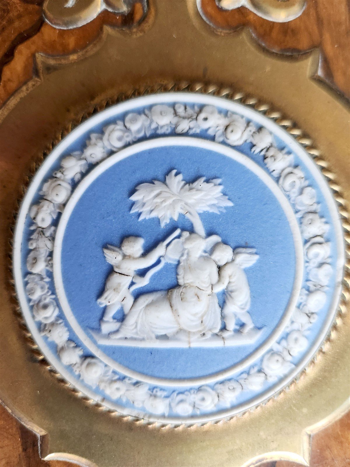 Front is wooden paned, decorated with brass and original Wedgwood centerpiece.