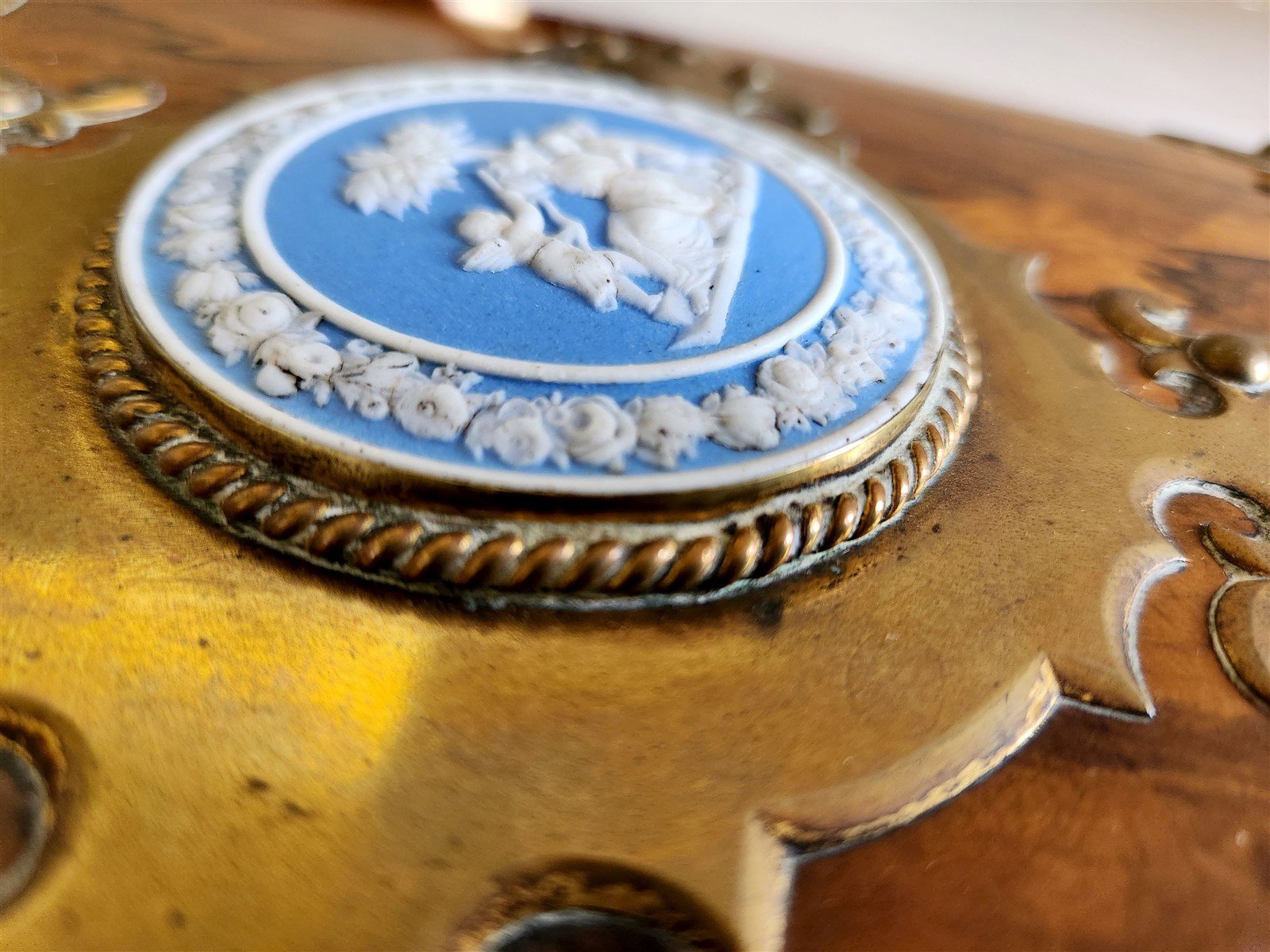 1880s FOLDER / BOOK COVER binding WOODEN w/ BRASS & WEDGWOOD DECORATIONS antique